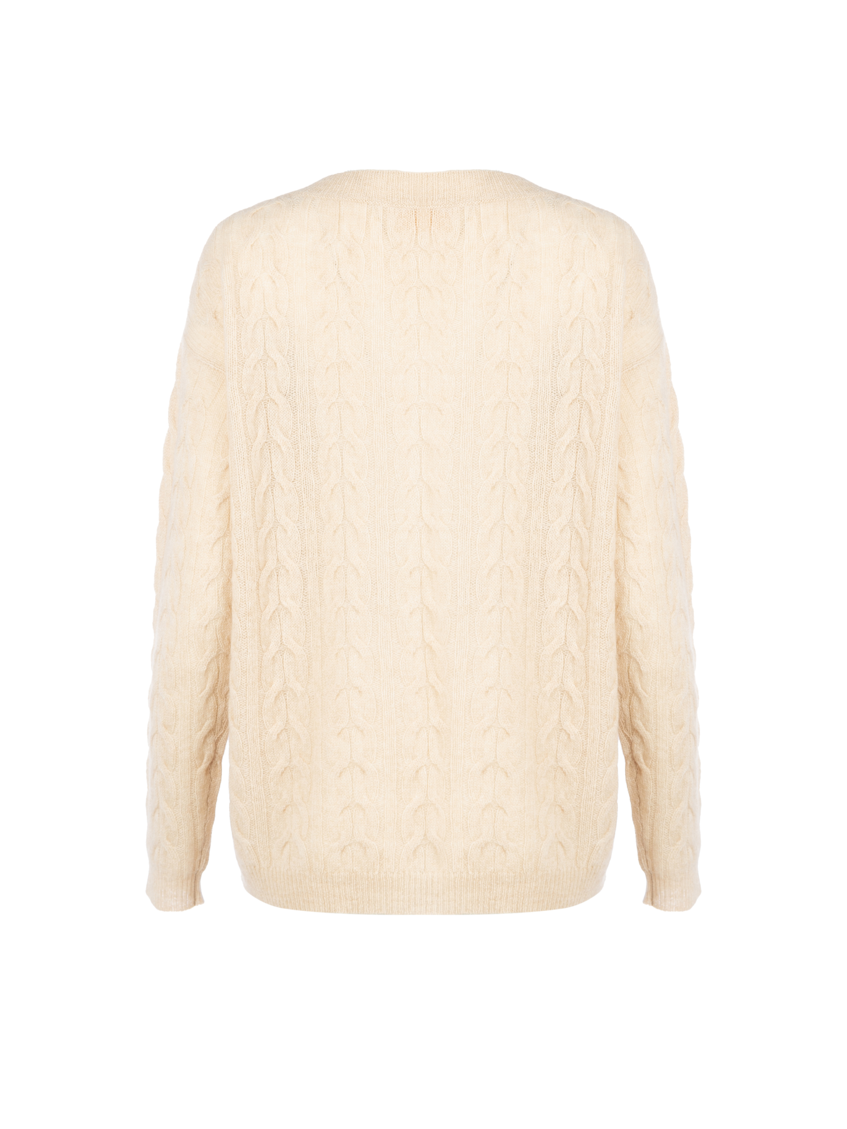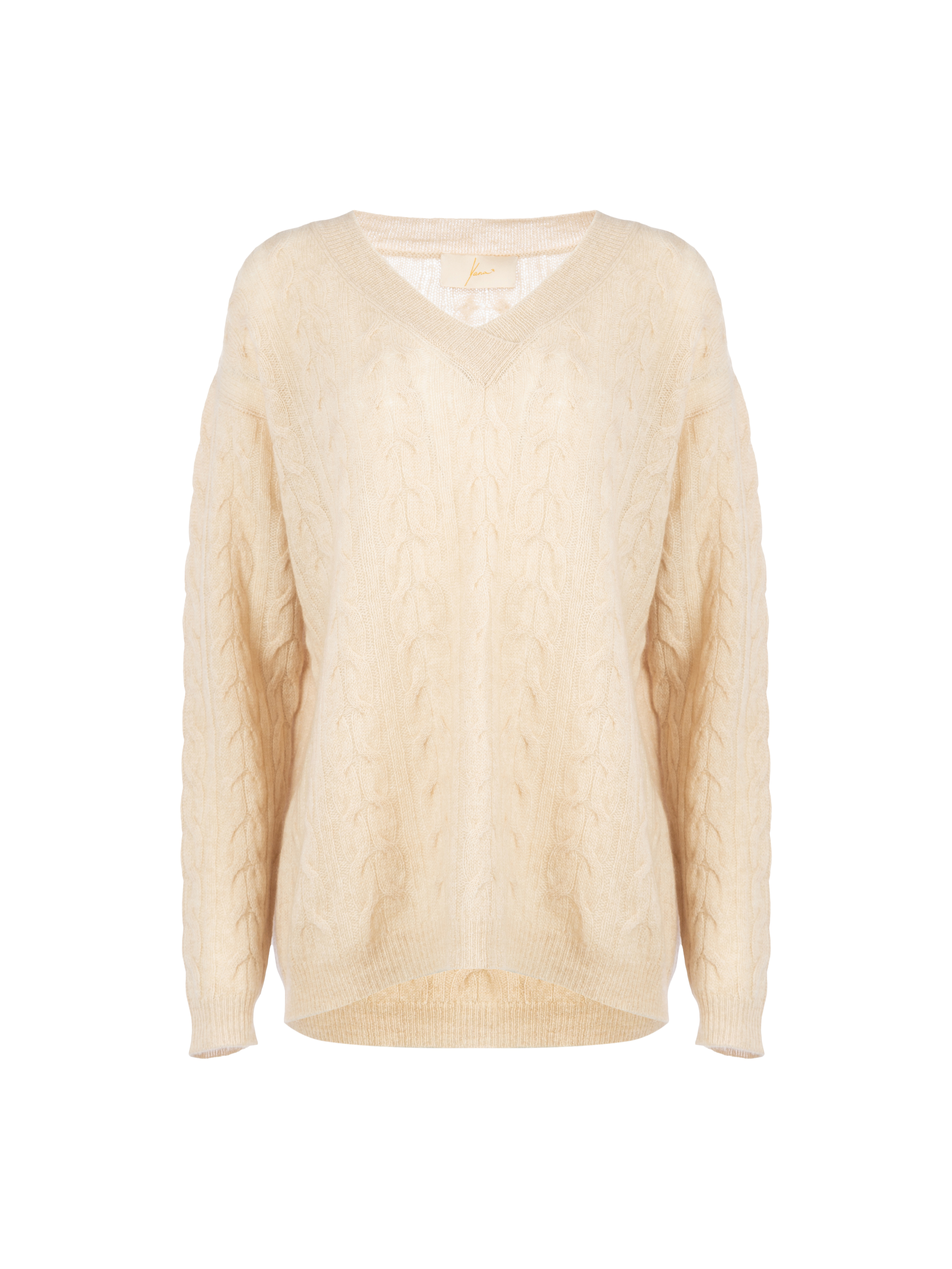 A cozy beige cable-knit pullover is made of natural cashmere and complemented by a V-neckline.
