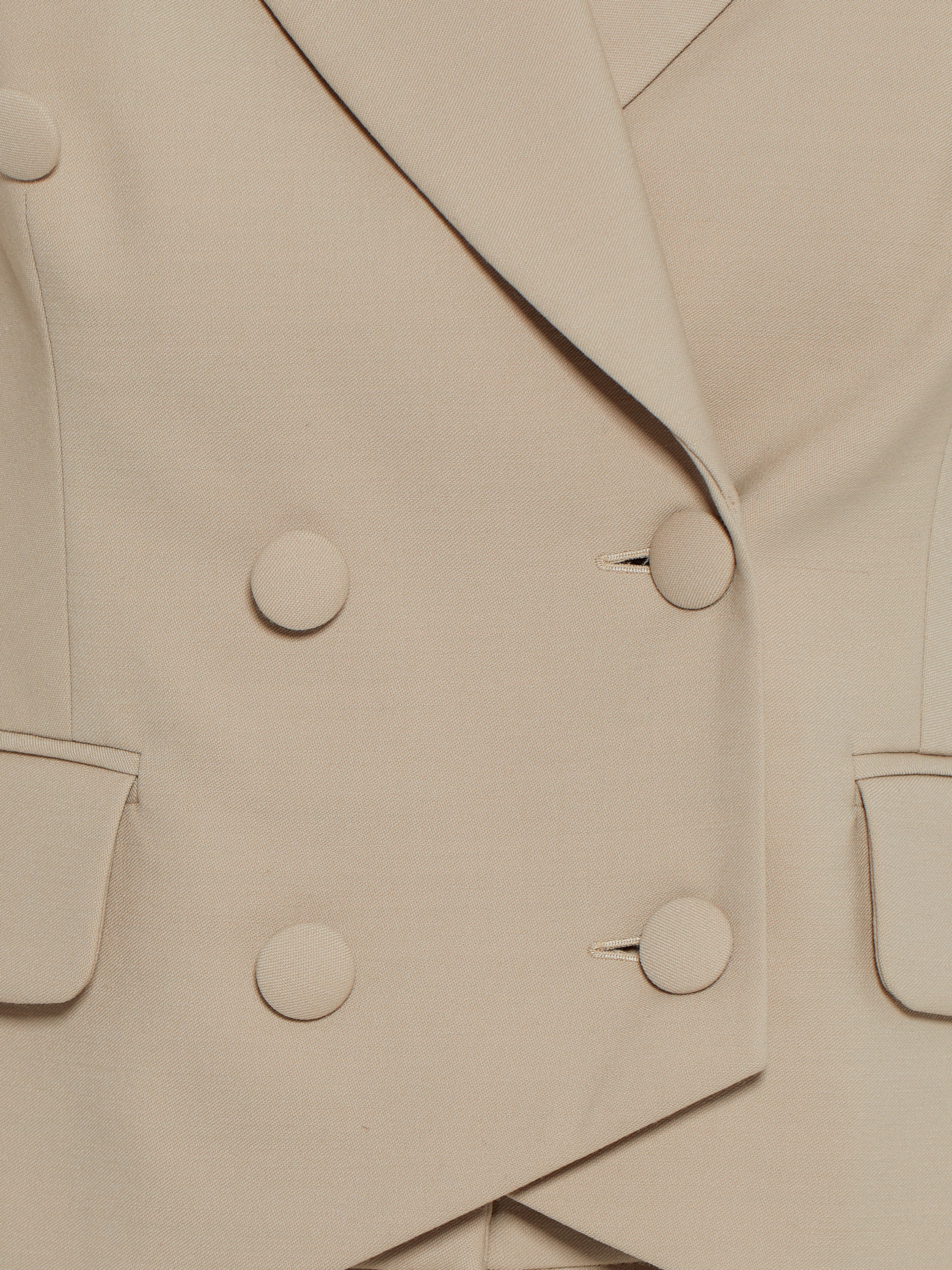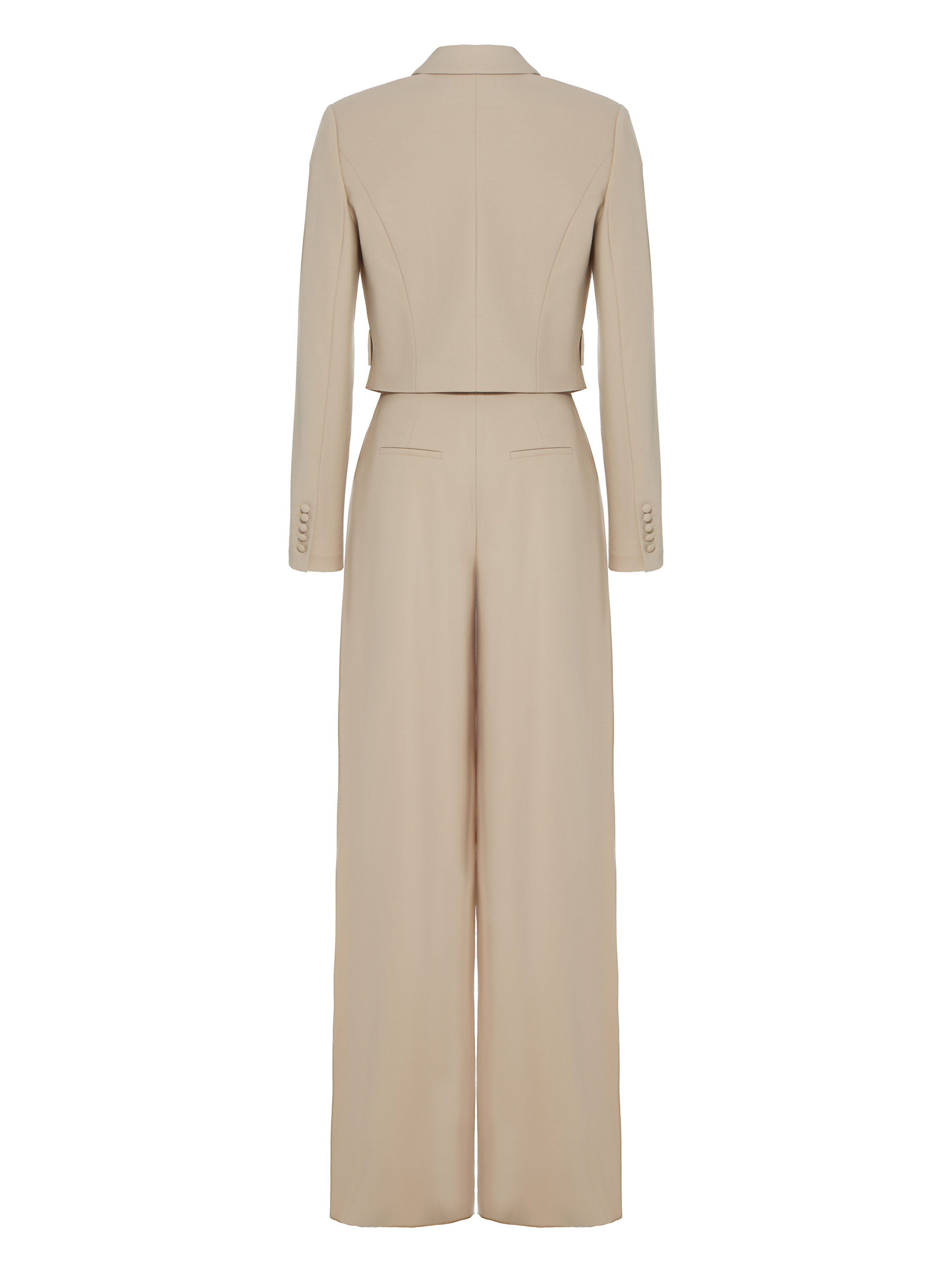The beige trouser suit in the designer interpretation of the Yana fashion house consists of a cropped double-breasted jacket and wide high-waisted trousers. The suit is made of natural wool. The jacket is complemented by a shaped hem and two welt pockets with flaps on the sides.