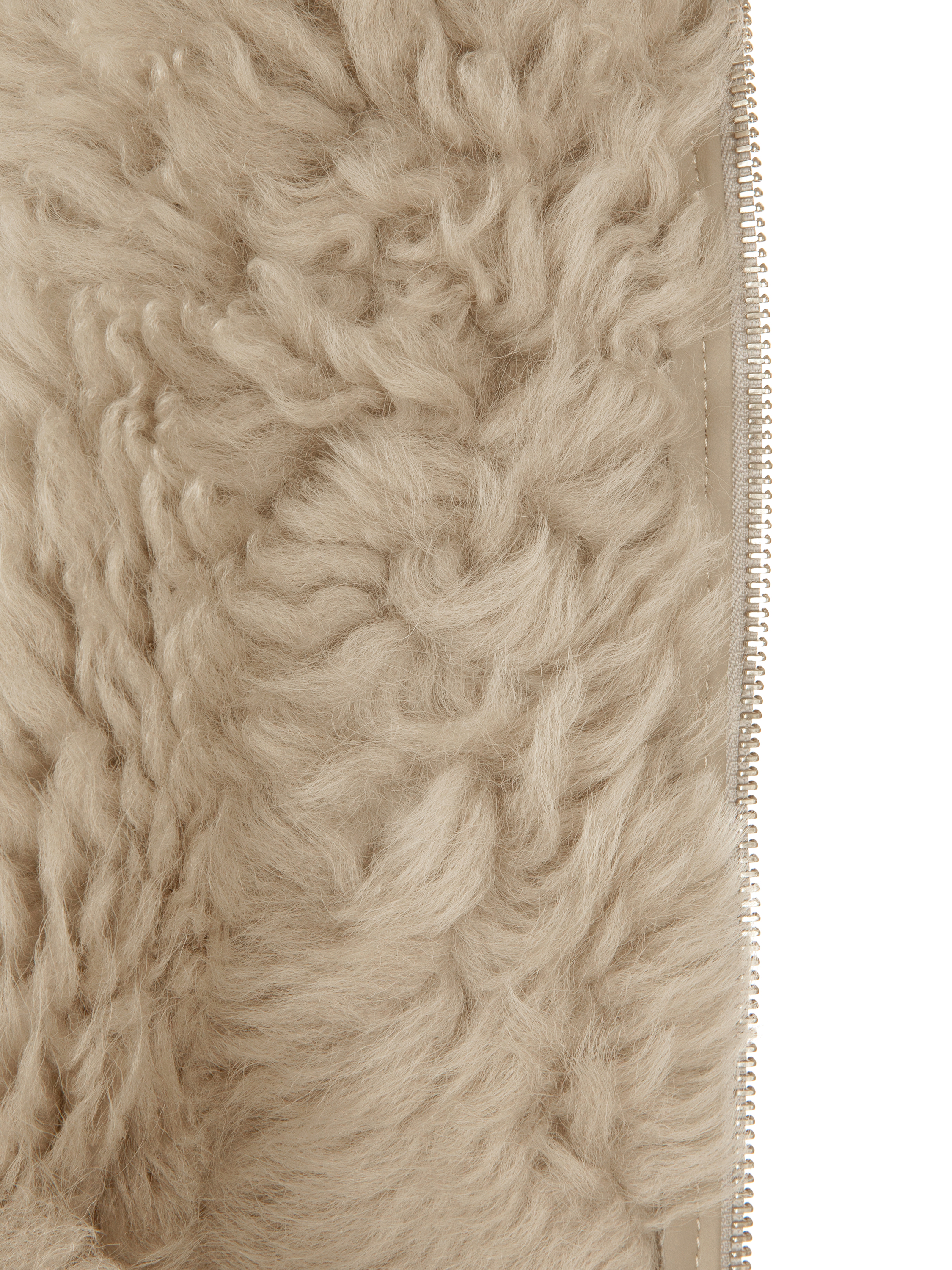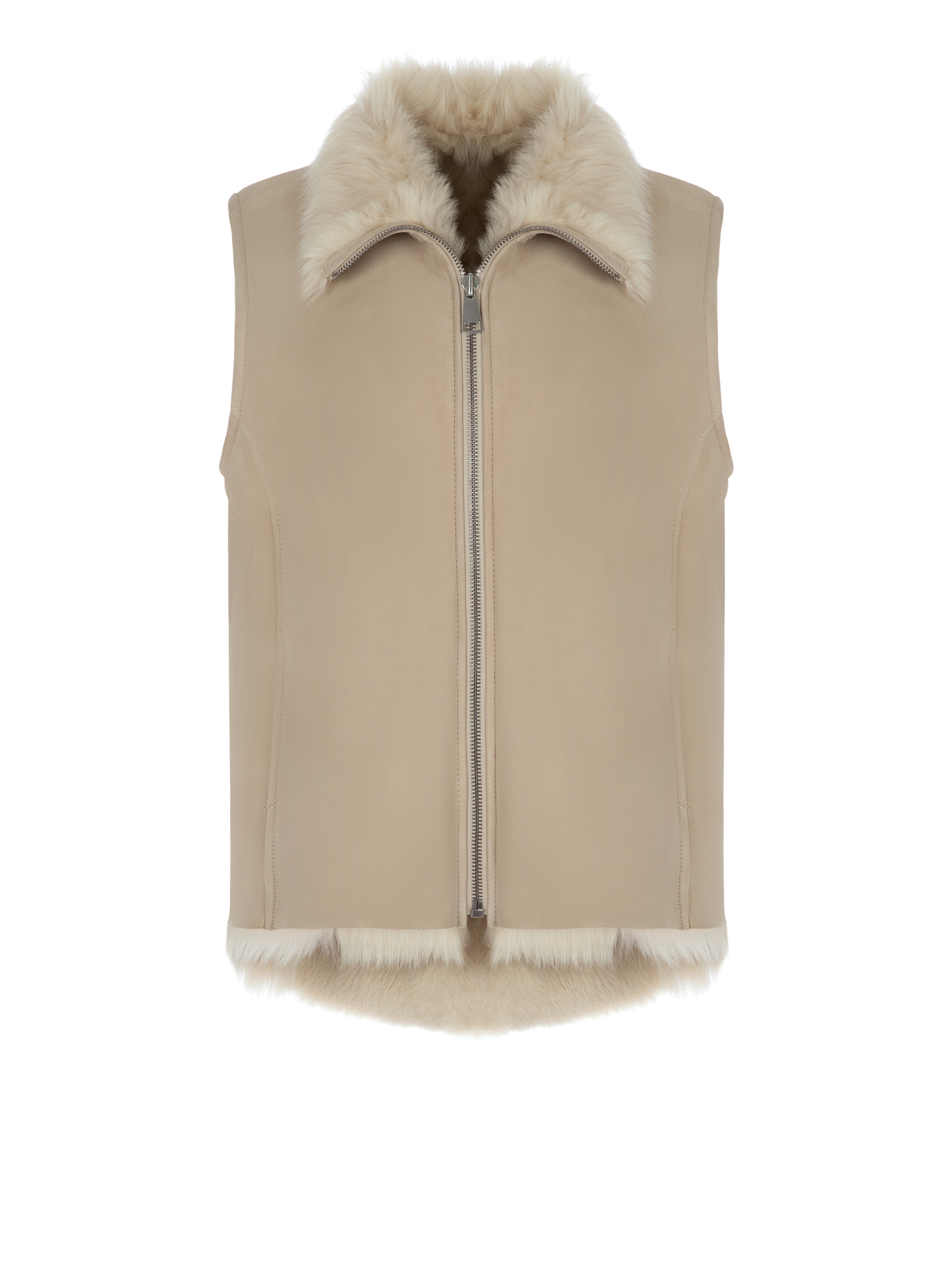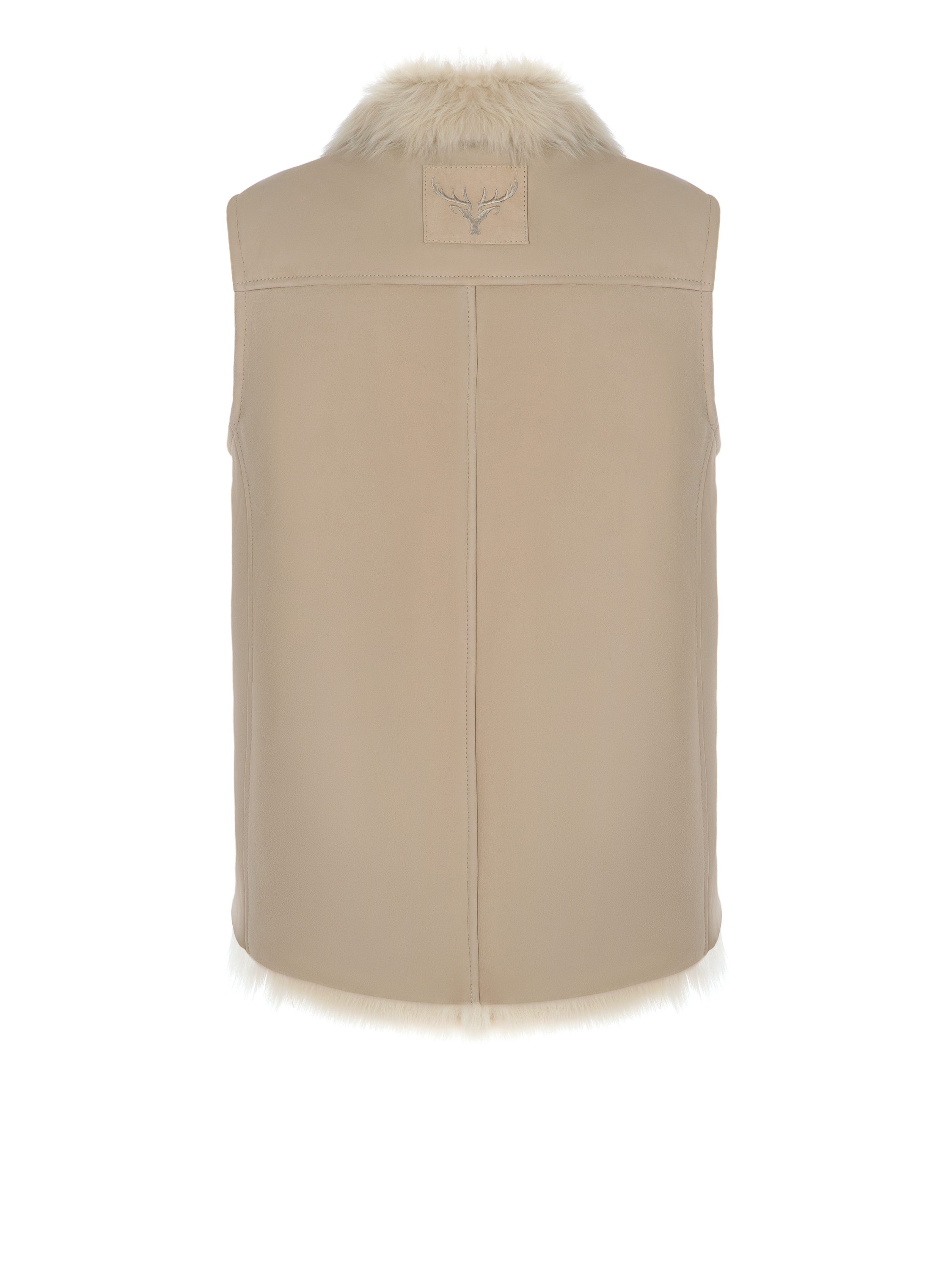 Beige straight-cut vest made of natural sheepskin. Zipper fastening with a stand-up collar. Suede patch with an embroidered deer on the back.