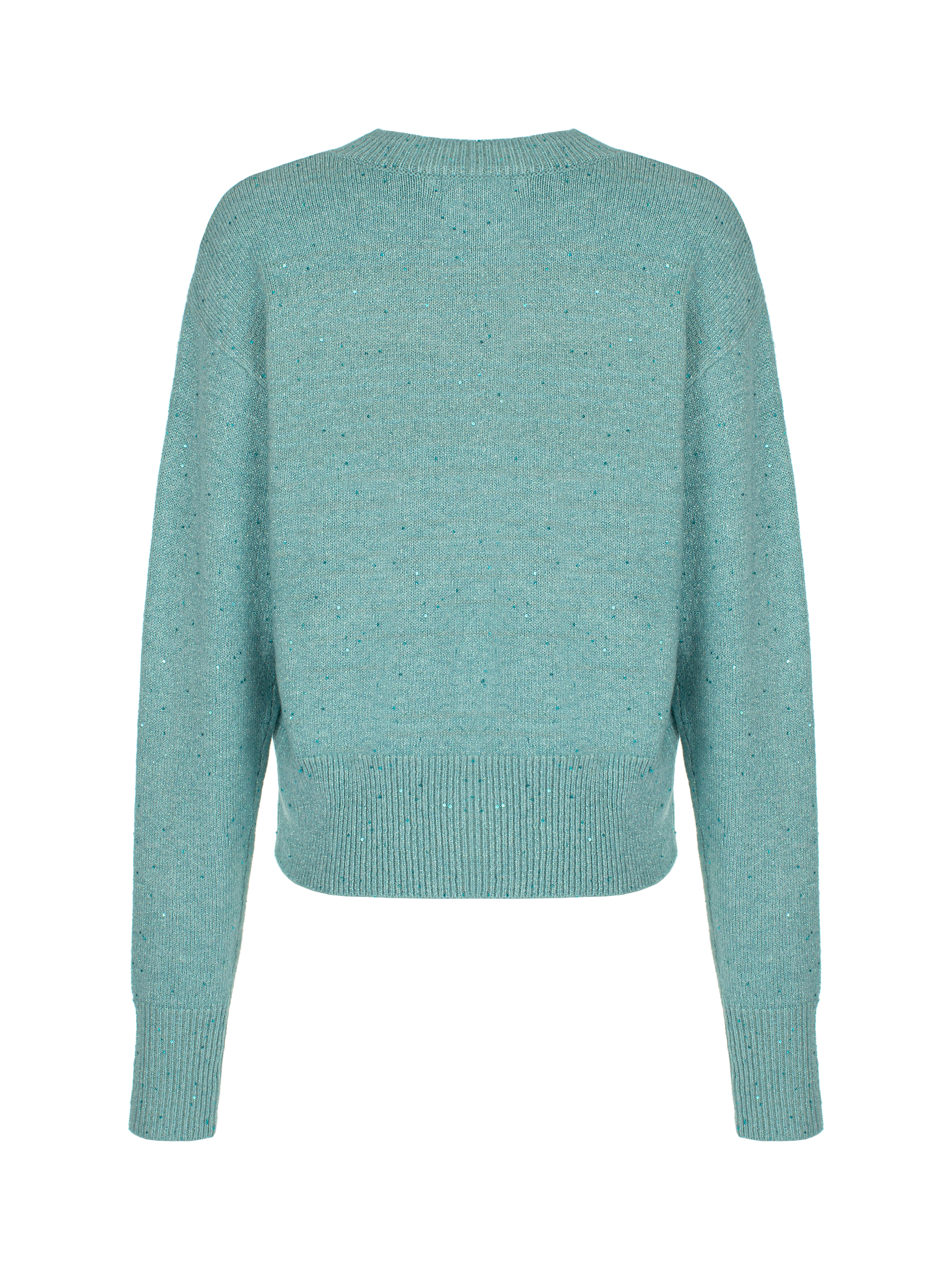 The pullover is made of blended turquoise cashmere with lurex and shimmering sequins. Loose fit, round neckline and elegant dropped shoulder line.