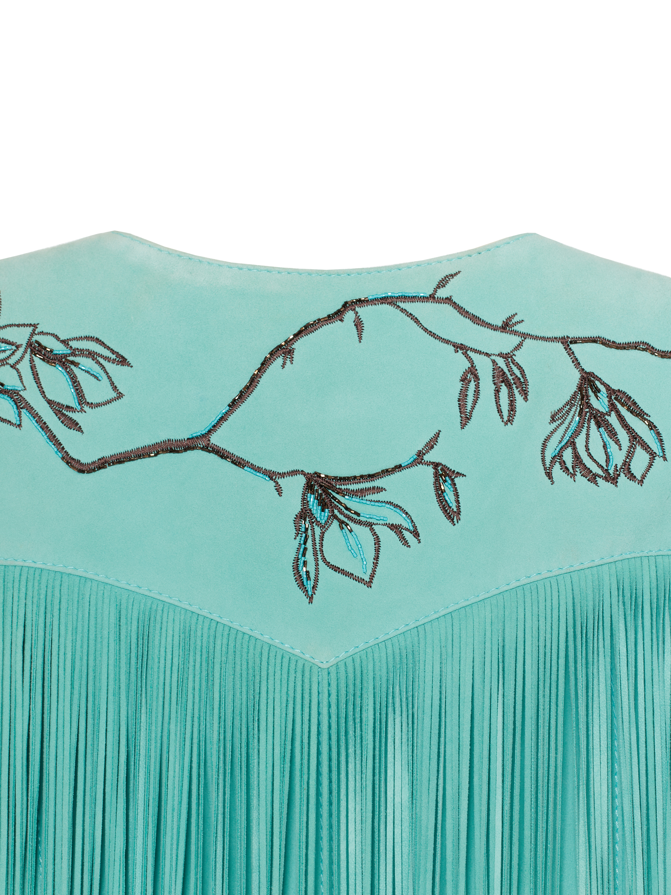 The cropped jacket is made of soft turquoise suede. The model is complemented by 3/4 sleeves, a round neckline and a lining made of natural silk. The jacket is decorated with matching fringe with brown beads along the hem and floral embroidery with shimmering beads on the back.