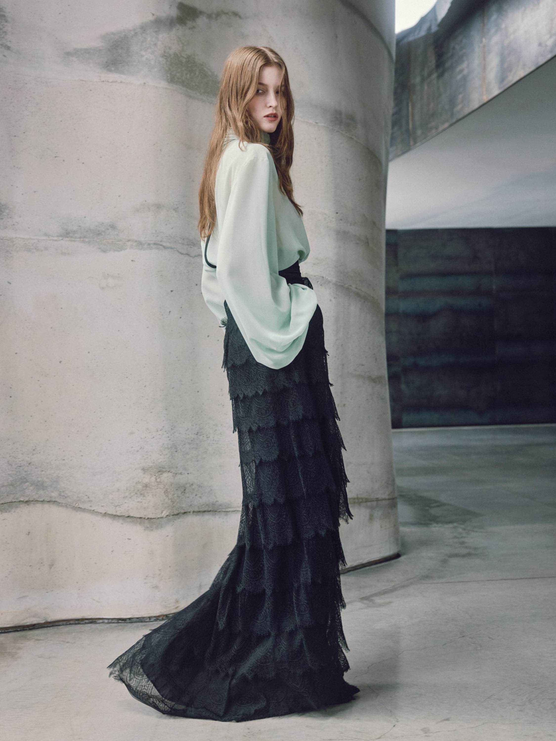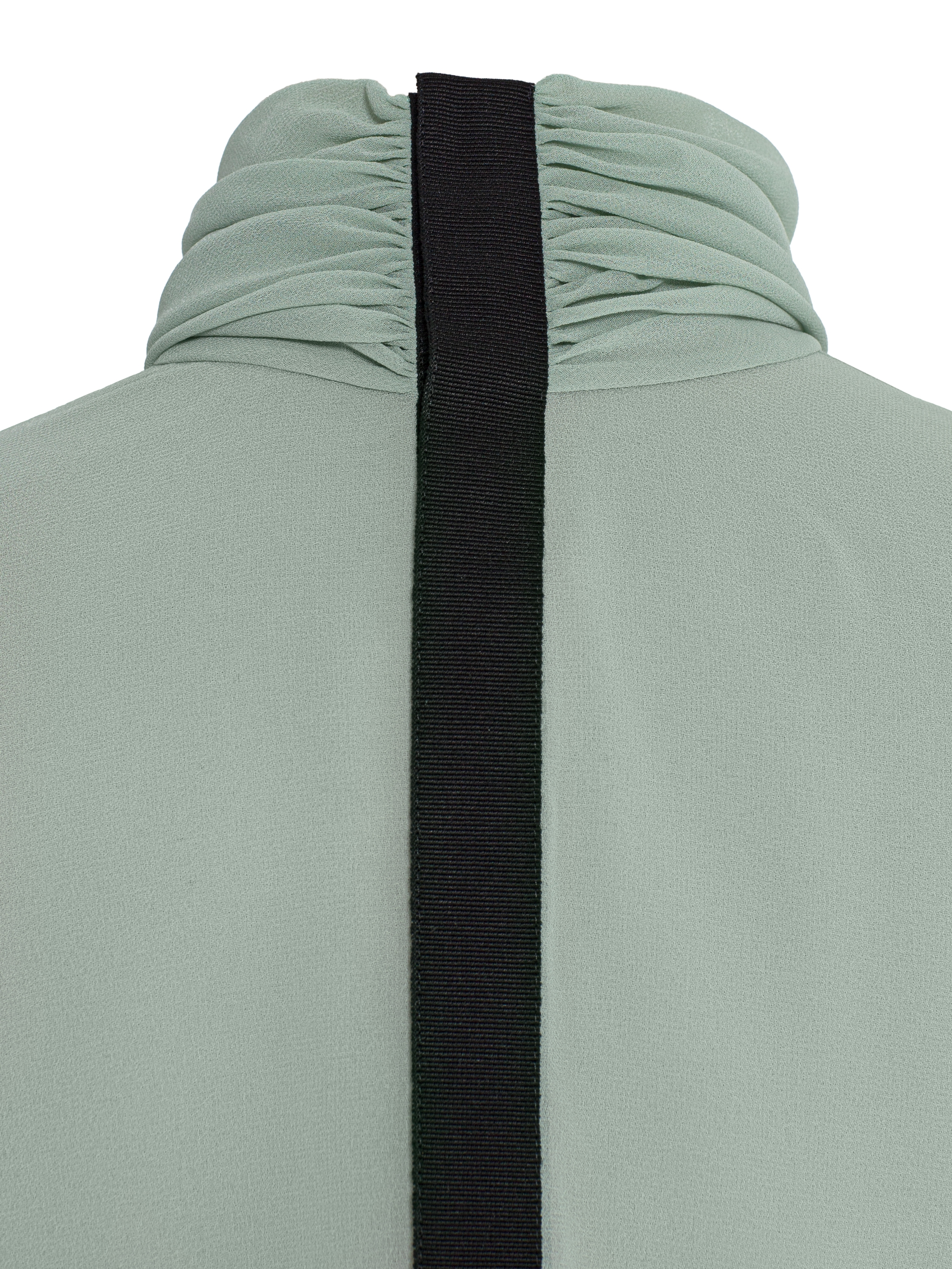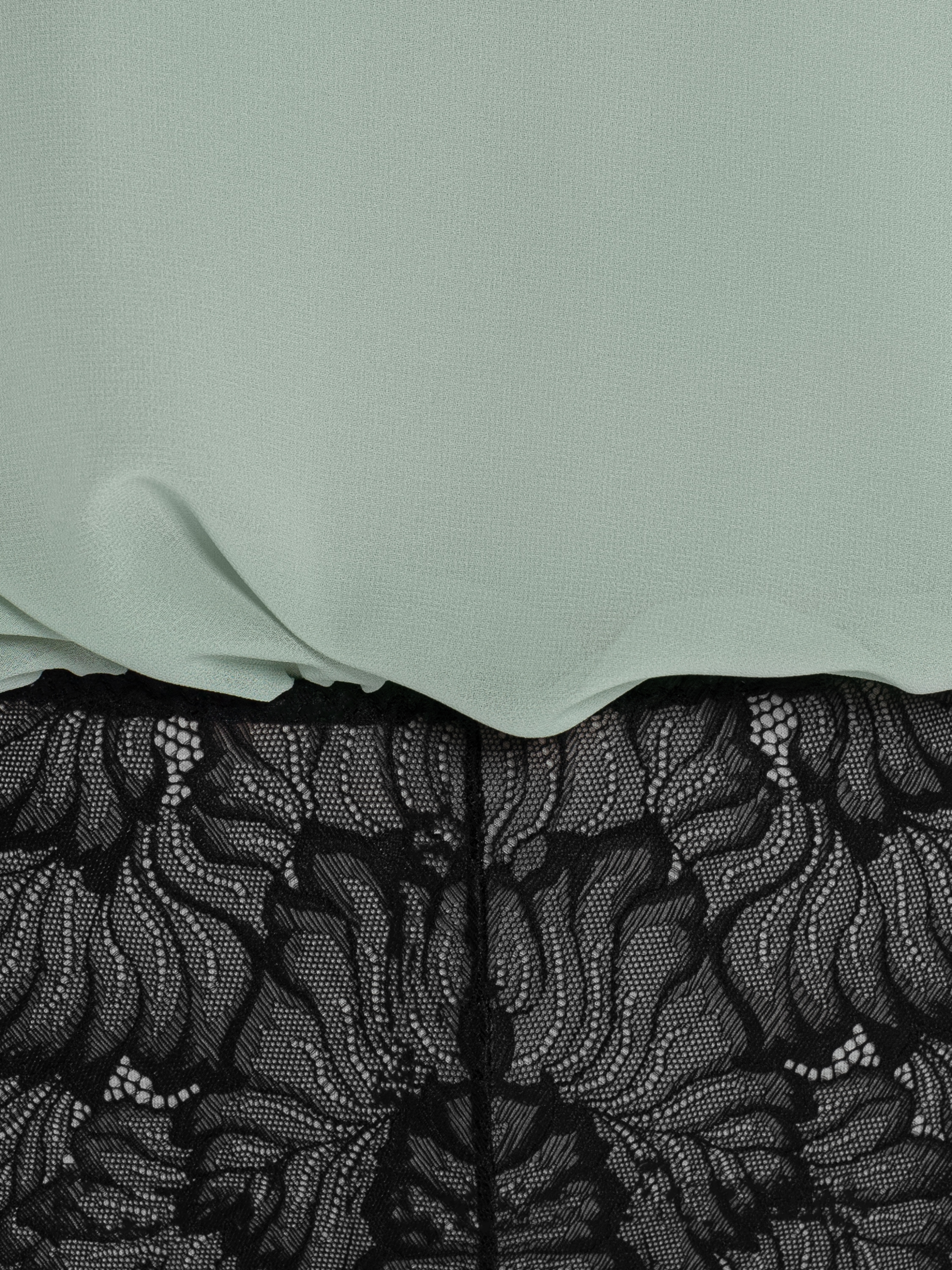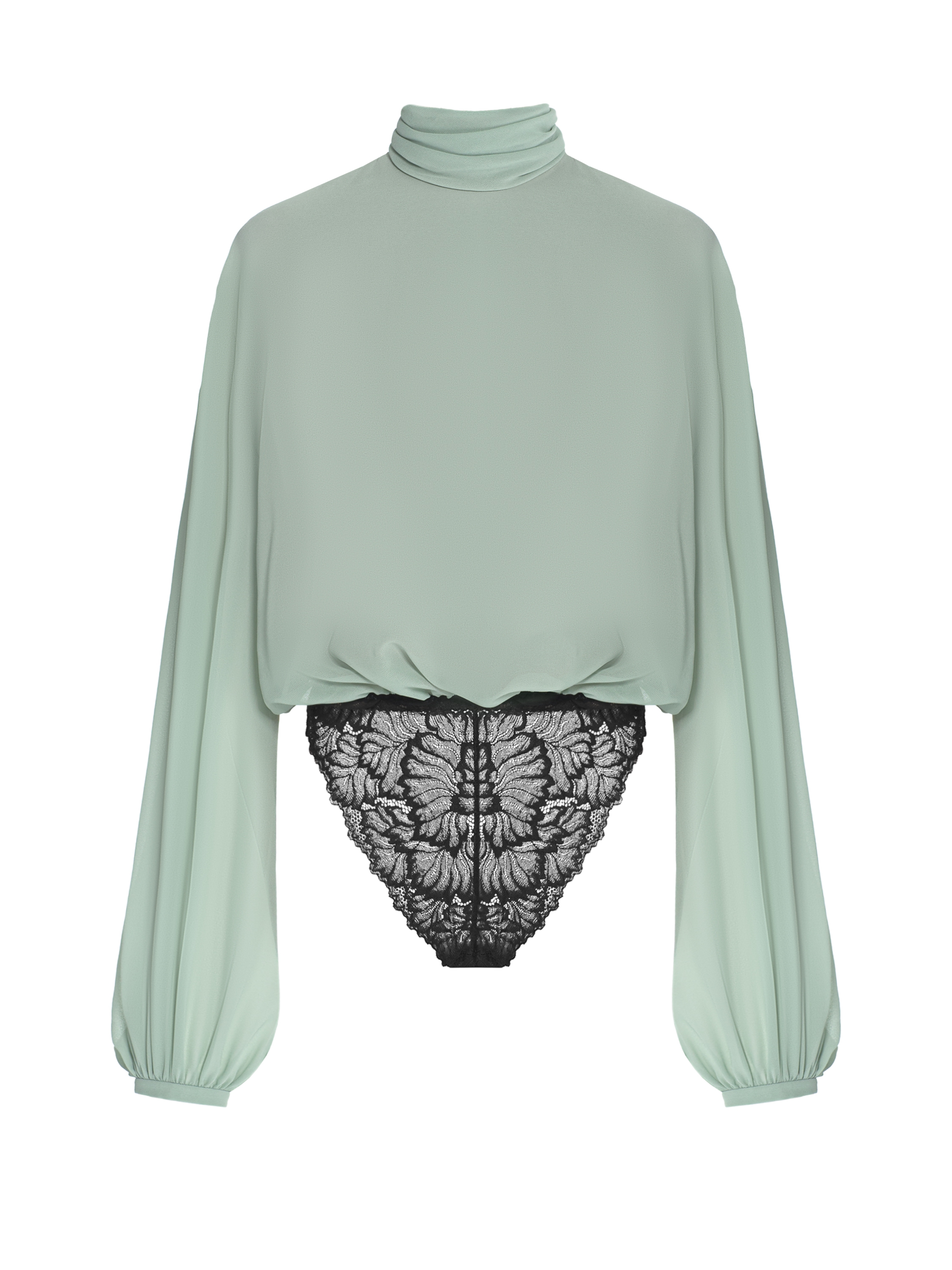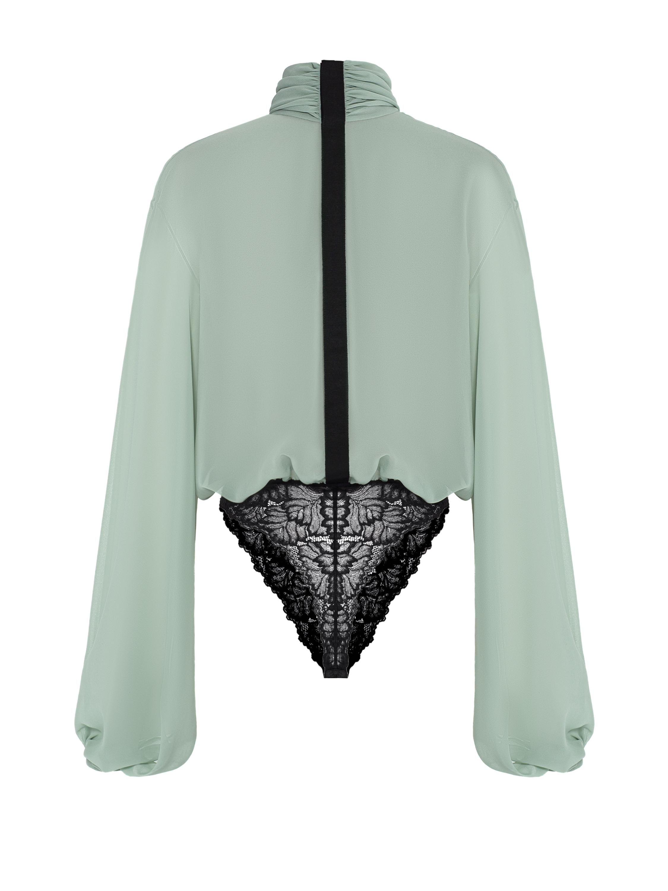 An elegant mint chiffon bodysuit blouse is complemented by a delicate black lace bottom. The minimalistic design with a stand-up collar will become an ideal base for any look.