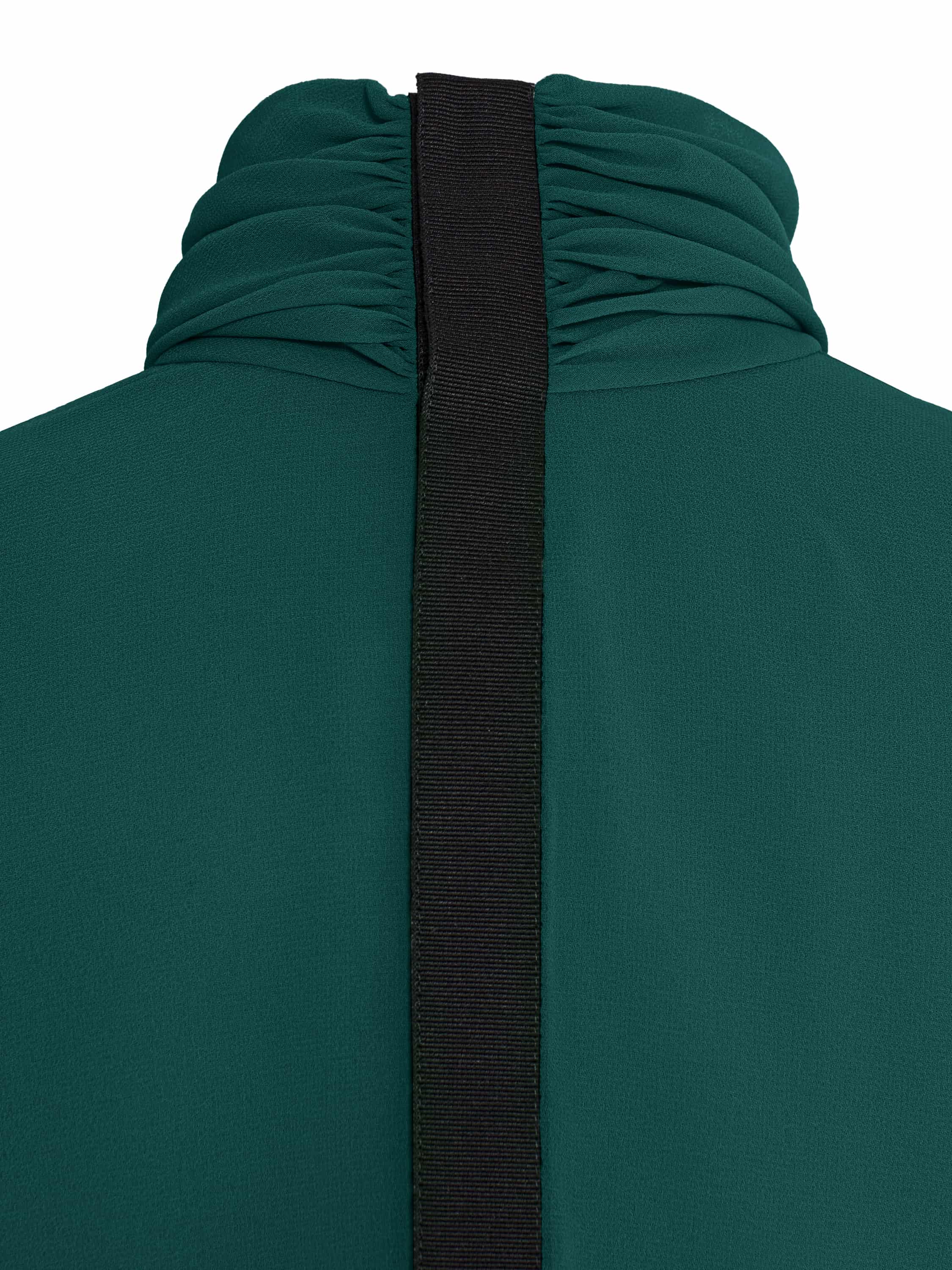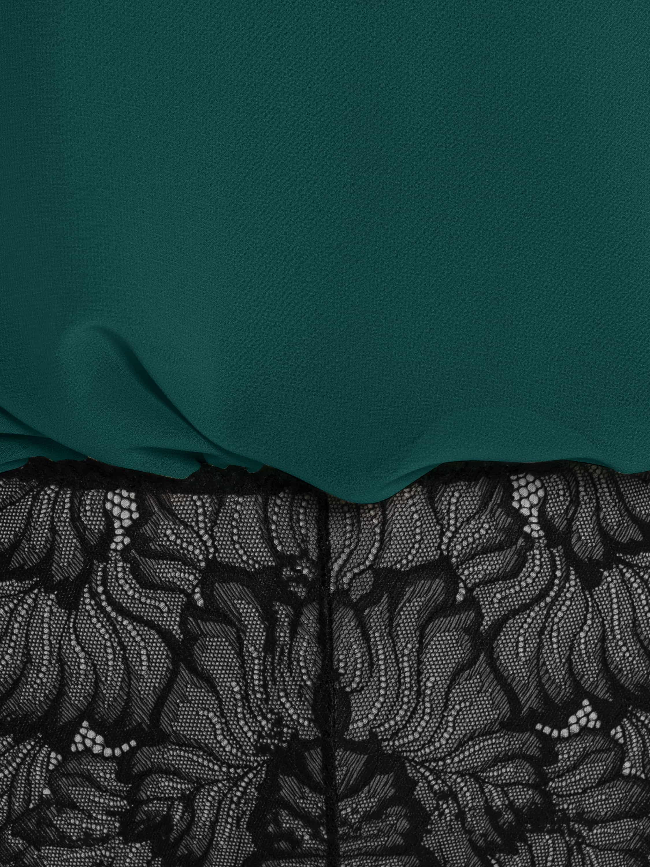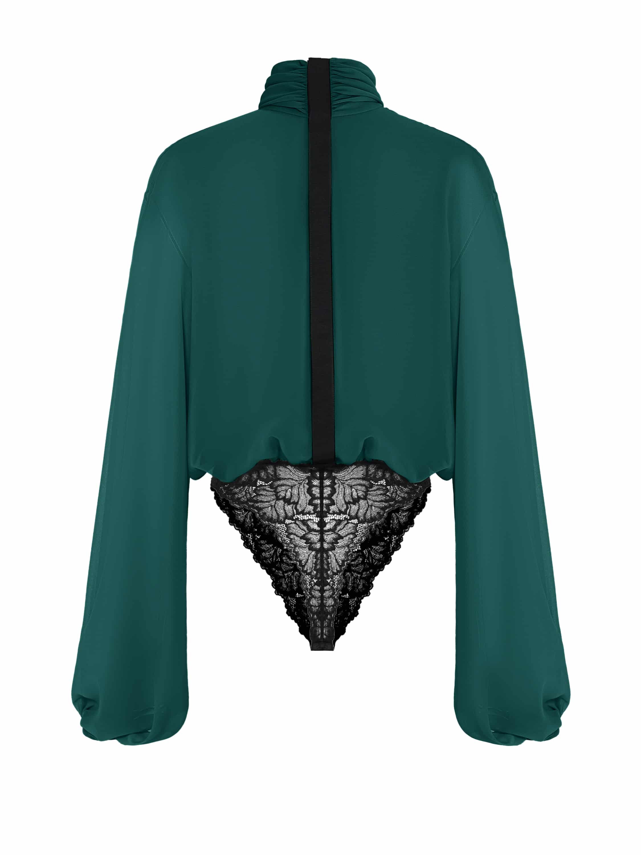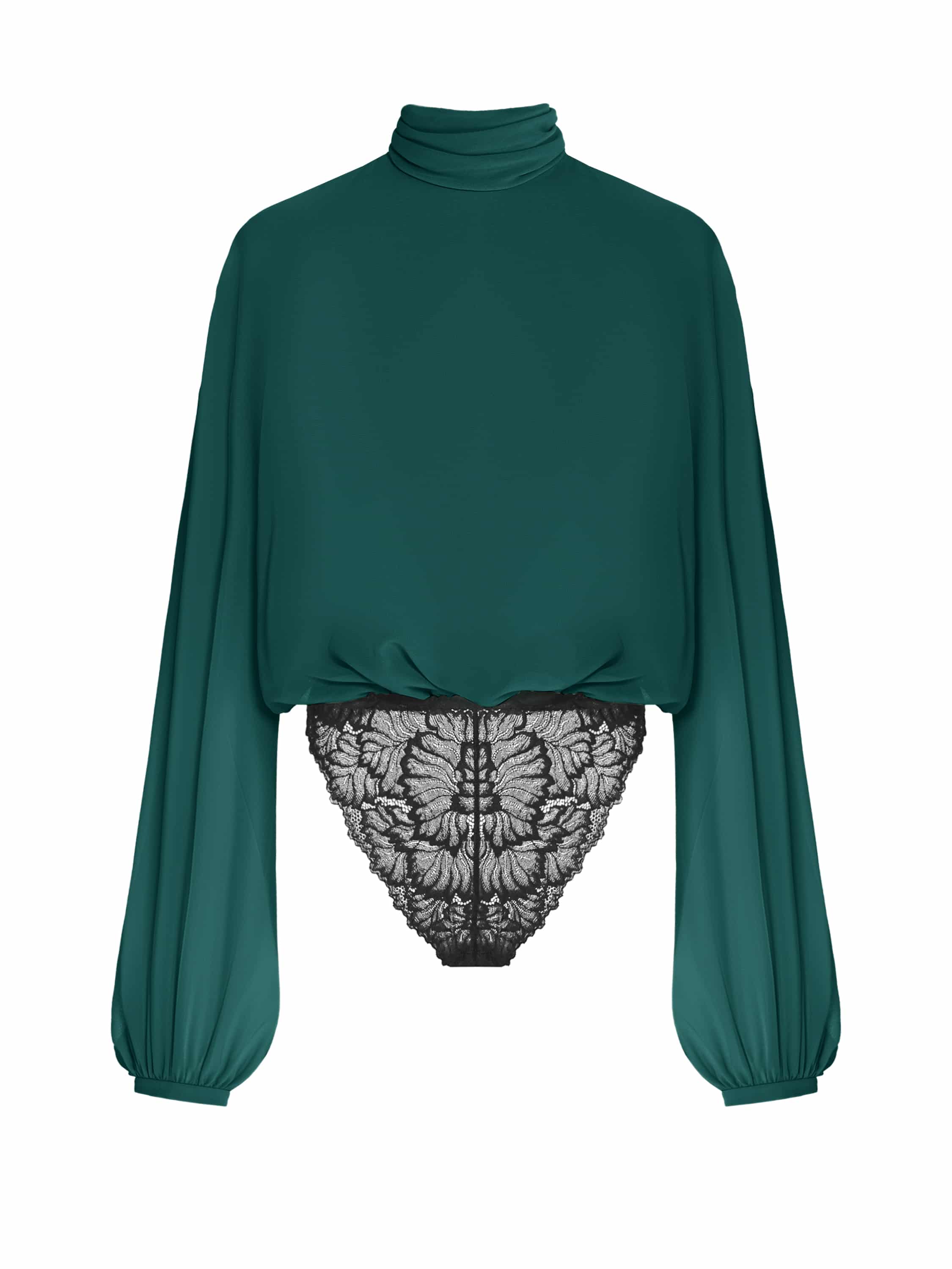 An elegant bodysuit blouse made of dark green chiffon is complemented by a delicate black lace bottom. The laconic model with a stand-up collar will become an ideal base for any outfit.