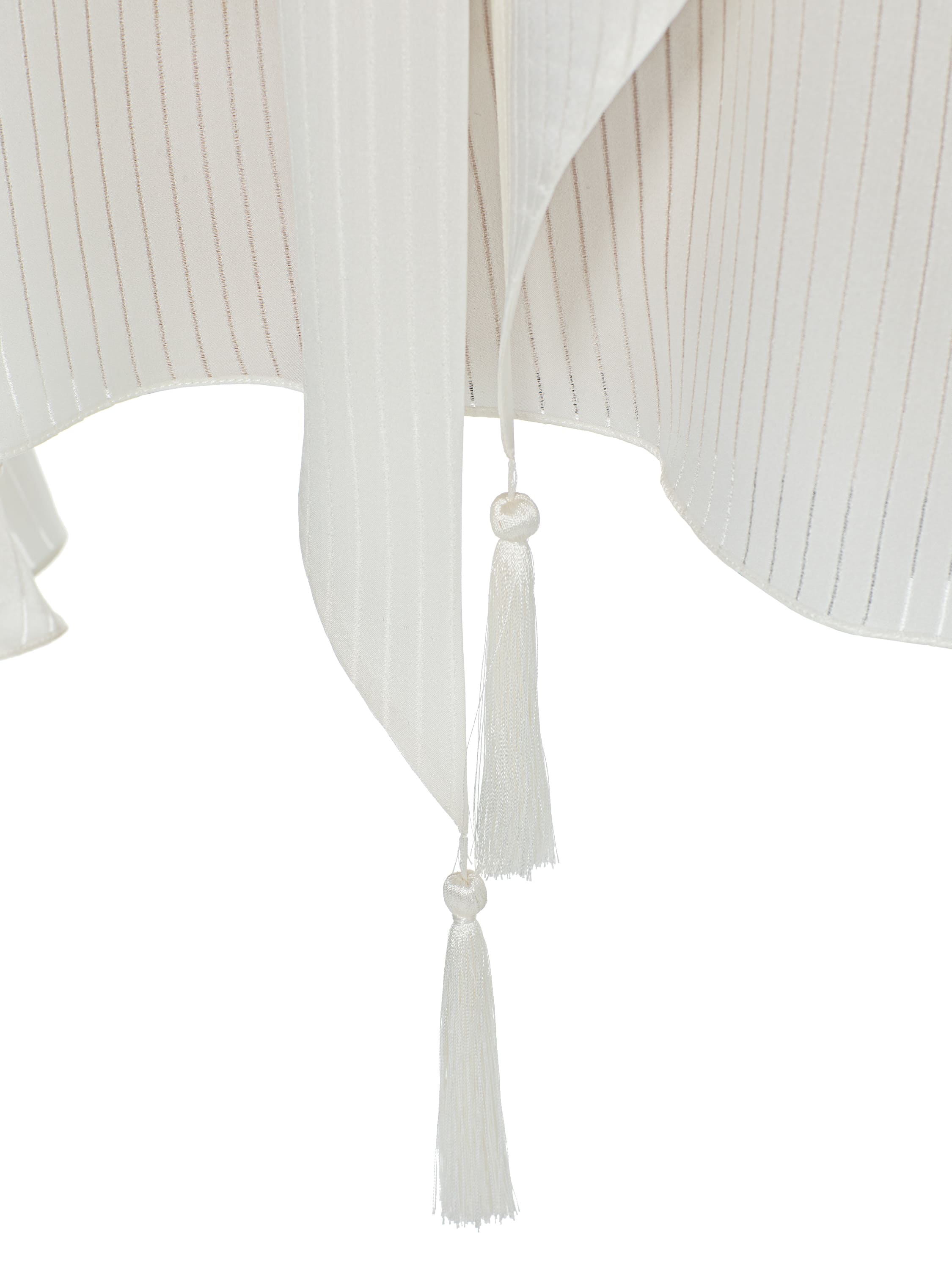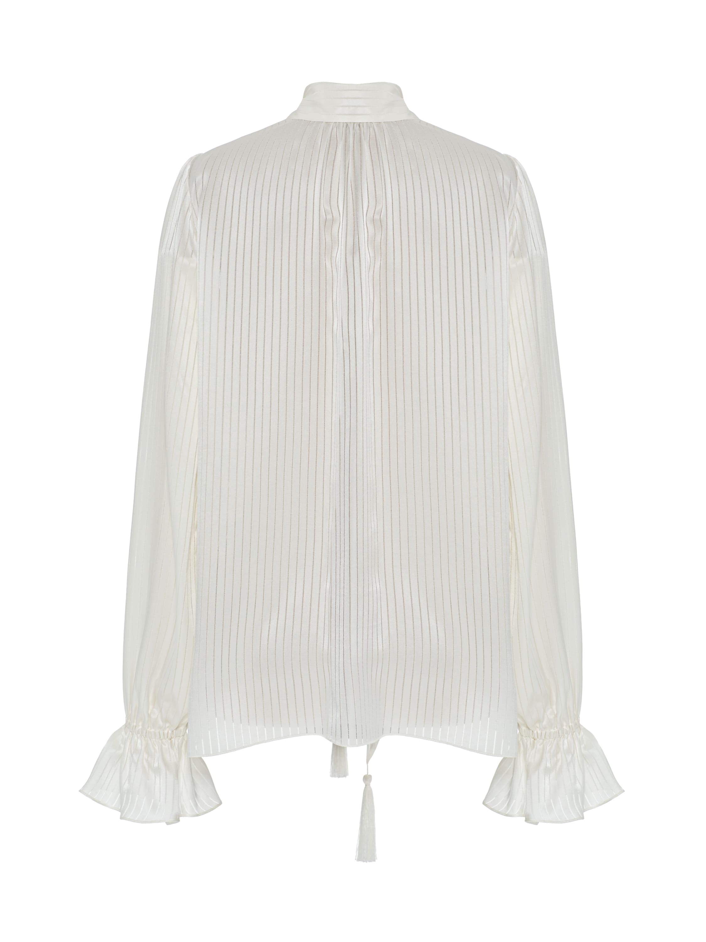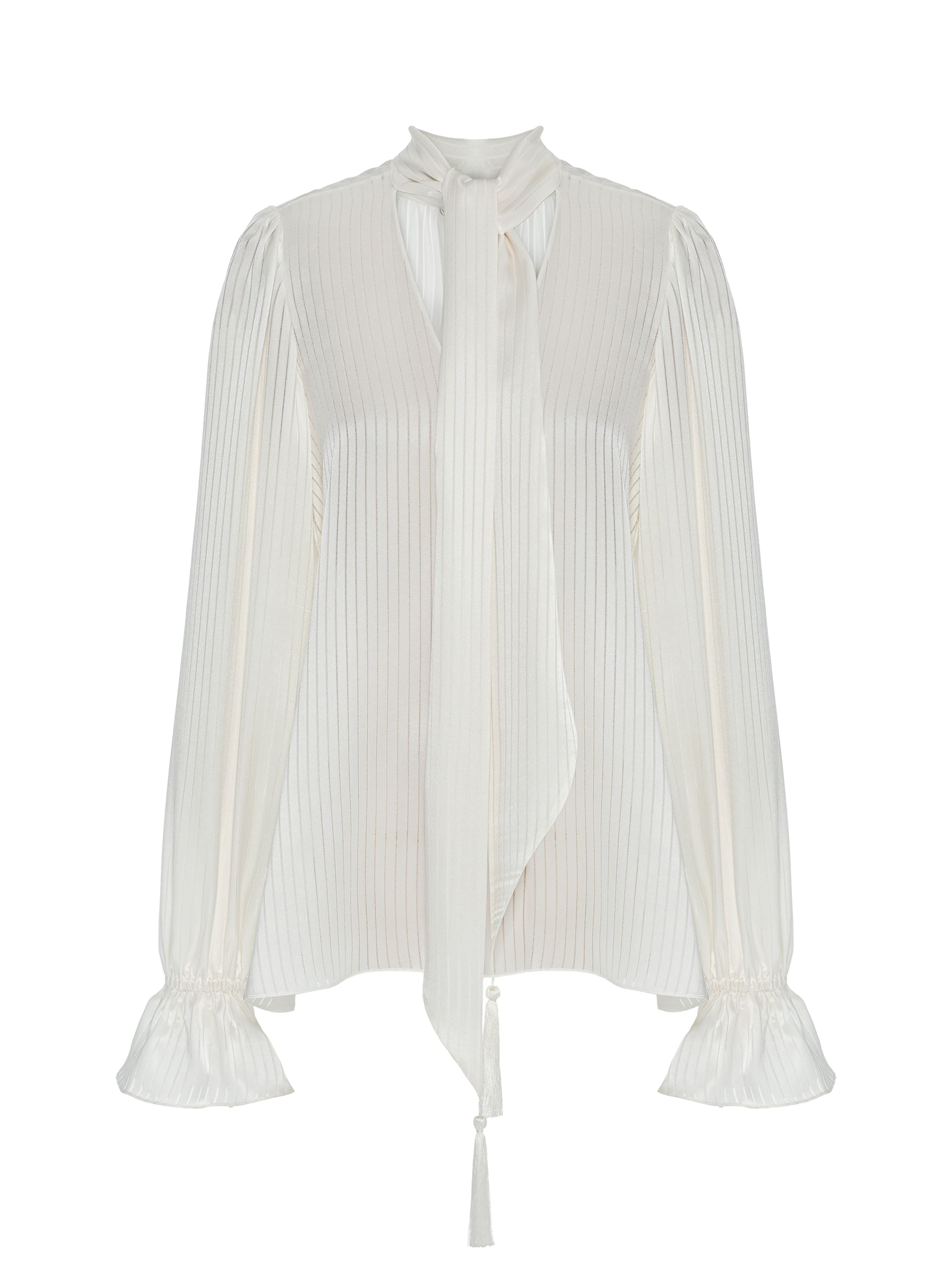 The white blouse with a delicate vertical stripe is made of silk fabric. The romantic piece is complemented by ties with tassels.