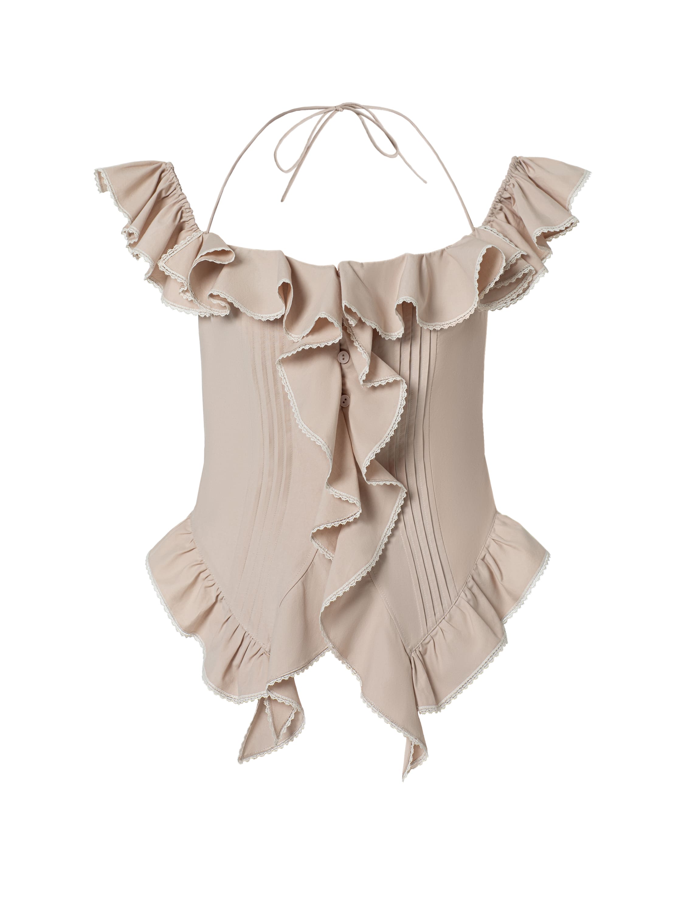 A beige off‑shoulder top made of soft, body‑friendly cotton fabric. The model is decorated with romantic ruffles and lace trim. Adjustable ties.