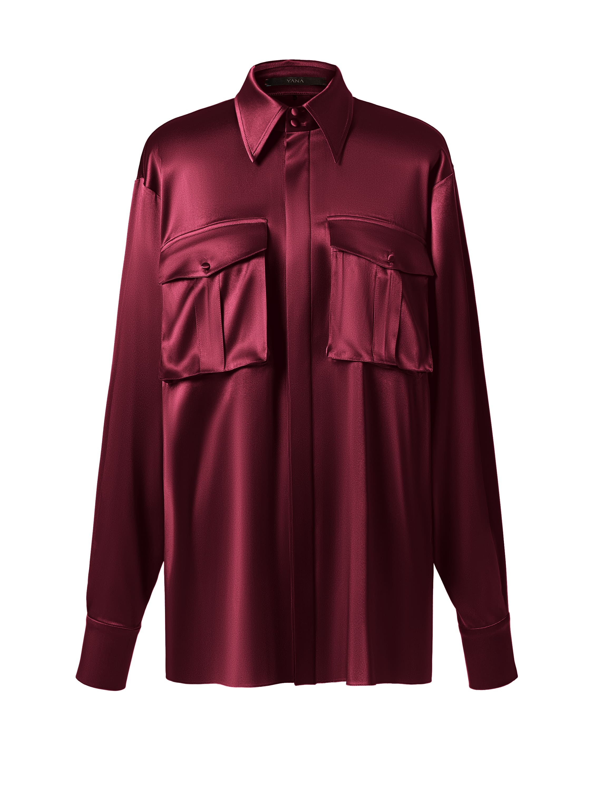A deep wine‑colored blouse made of delicate silk fabric. The model features a turn‑down collar, a concealed placket closure, and two patch pockets.