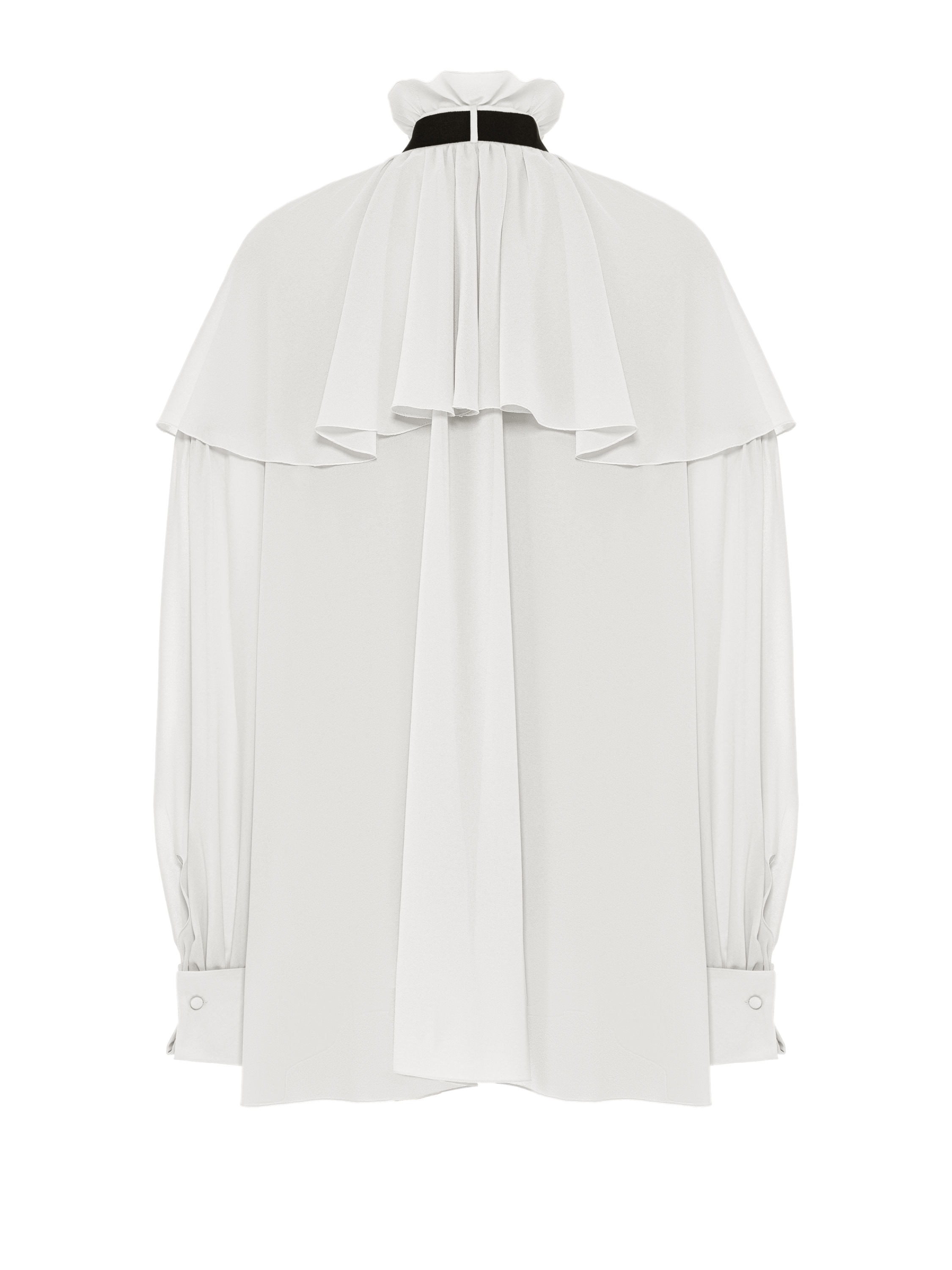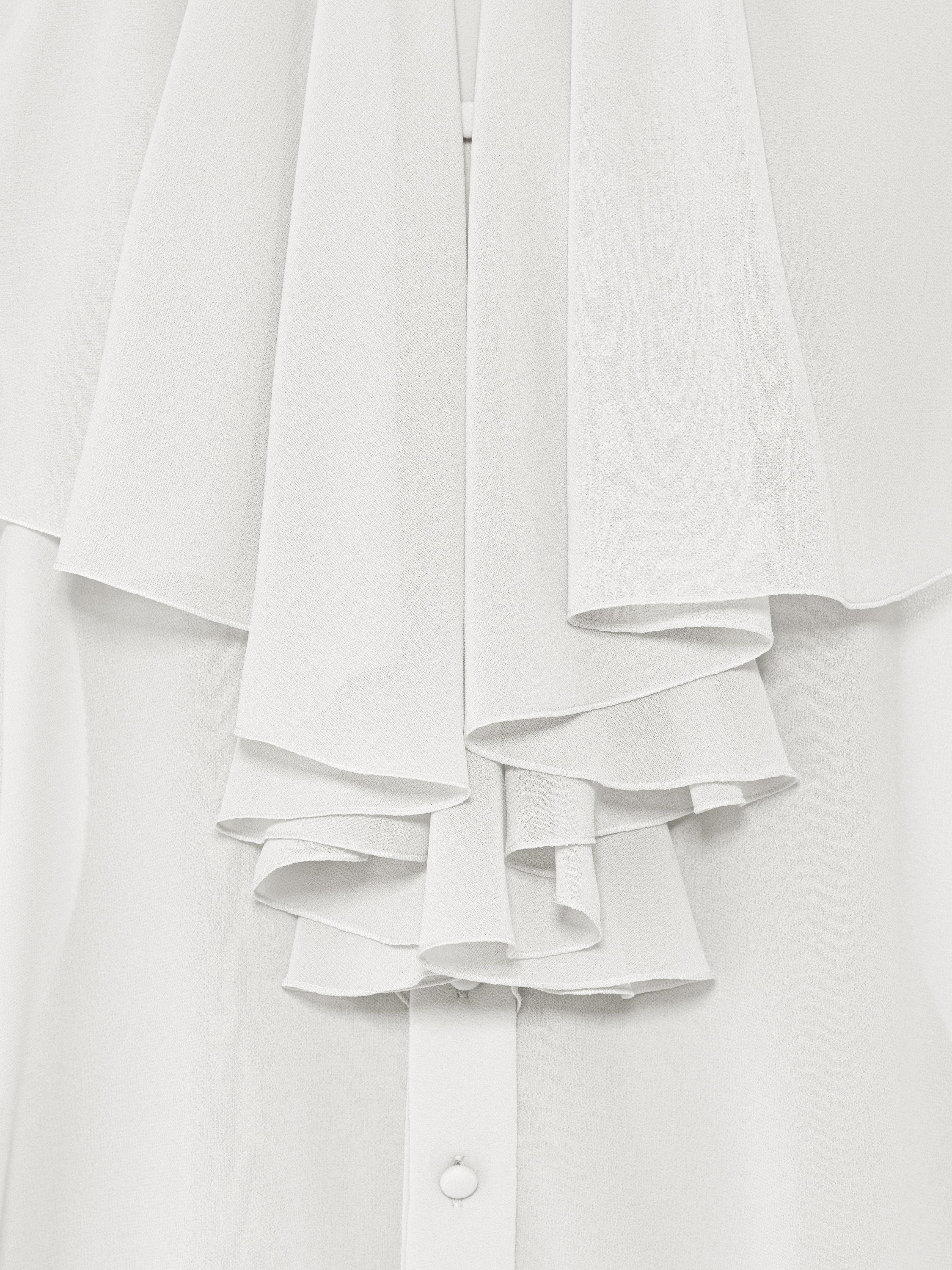 A milk-colored blouse made of airy chiffon is the perfect way to create a striking and original look. The laconic cut, inspired by the form of cardinals, is embodied in the details: a stand-up collar with ruffles, wide cuffs, cufflinks. The model is complemented by a relaxed black bow.