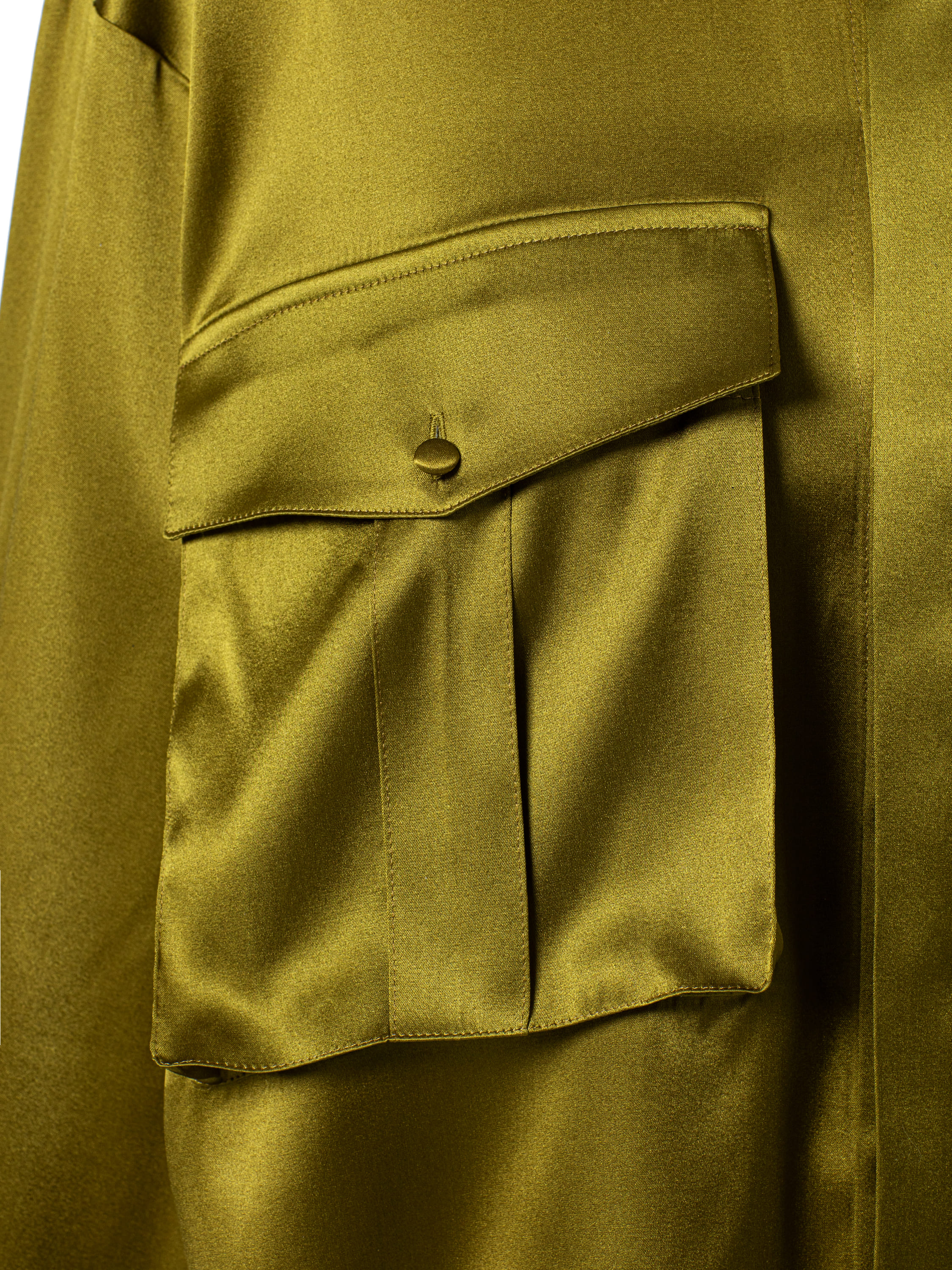 An olive‑green blouse made of delicate silk fabric. The model features a turn‑down collar, a concealed placket closure, and two patch pockets.