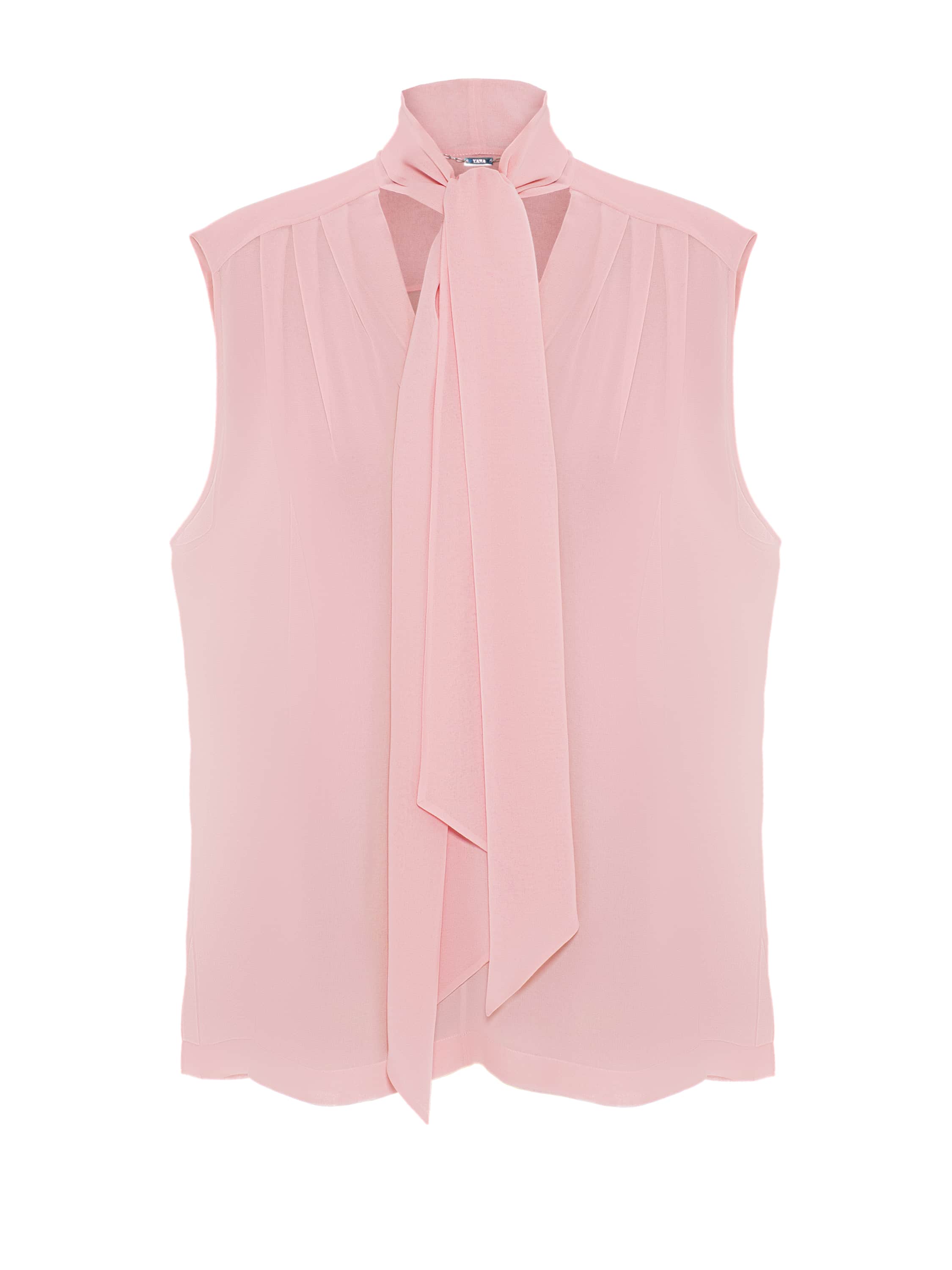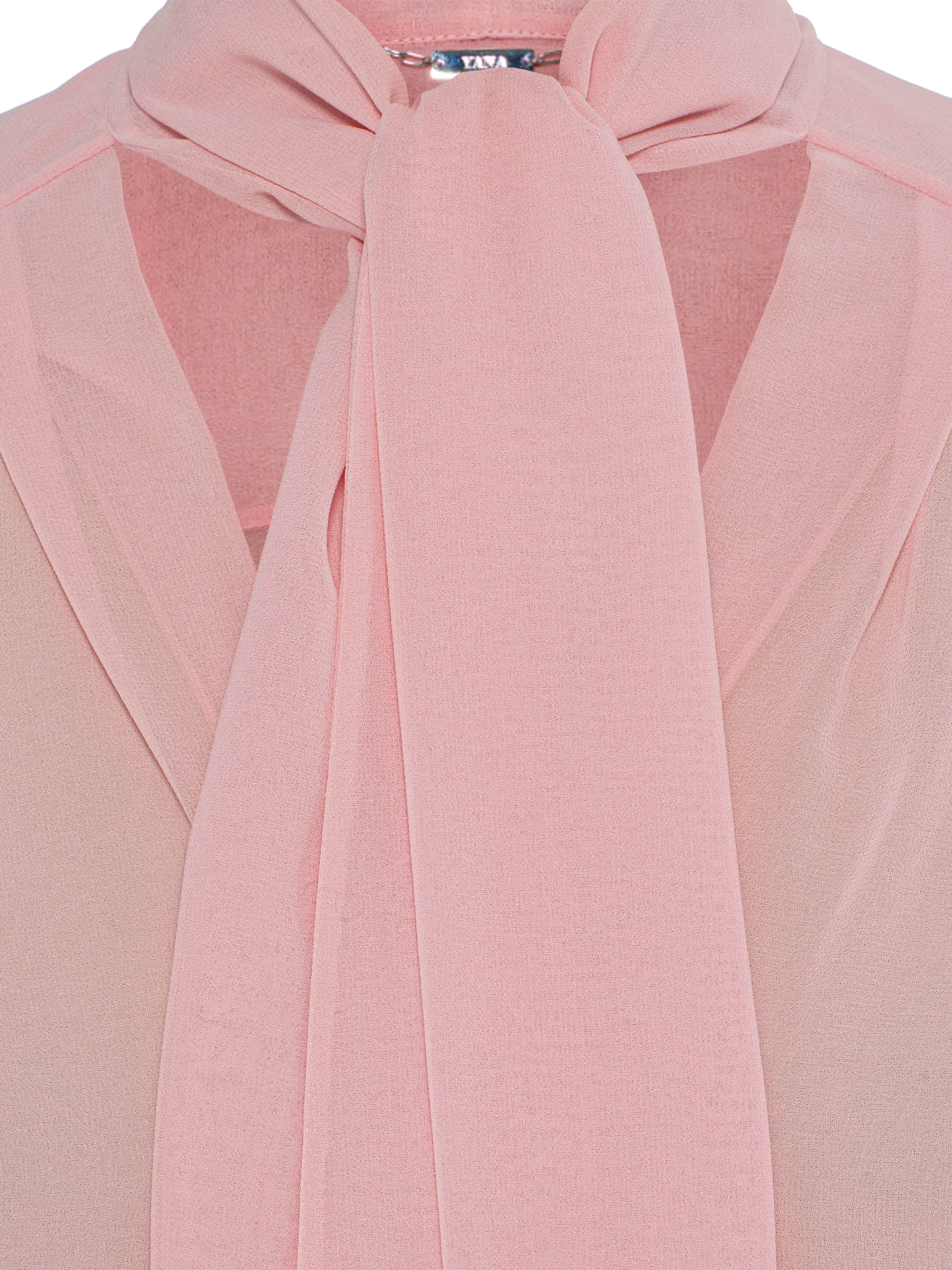 The pink blouse with tie-up collar is made from lightweight sheer chiffon. The model does not limit styling options and can be easily combined with any basic wardrobe pieces.