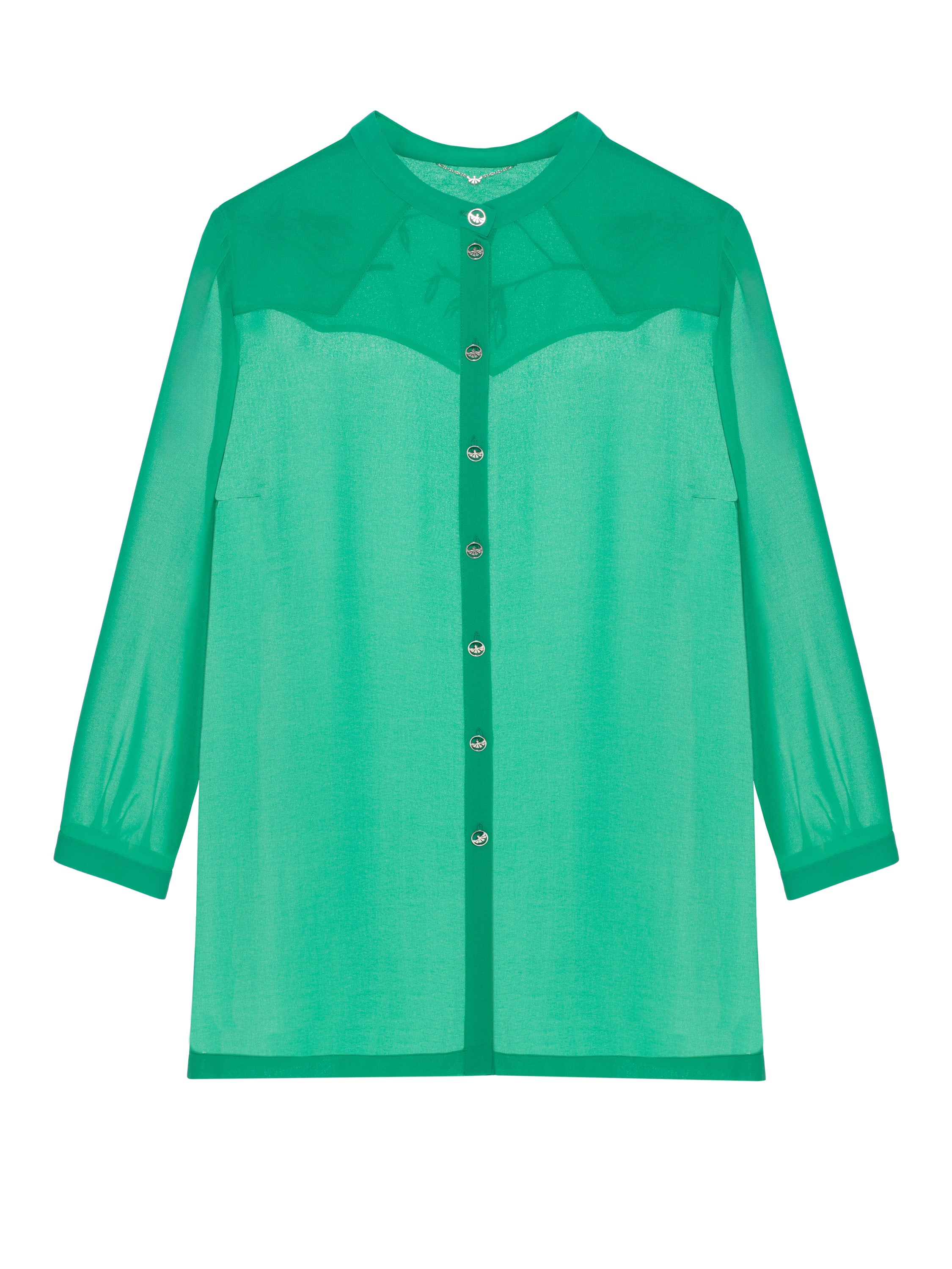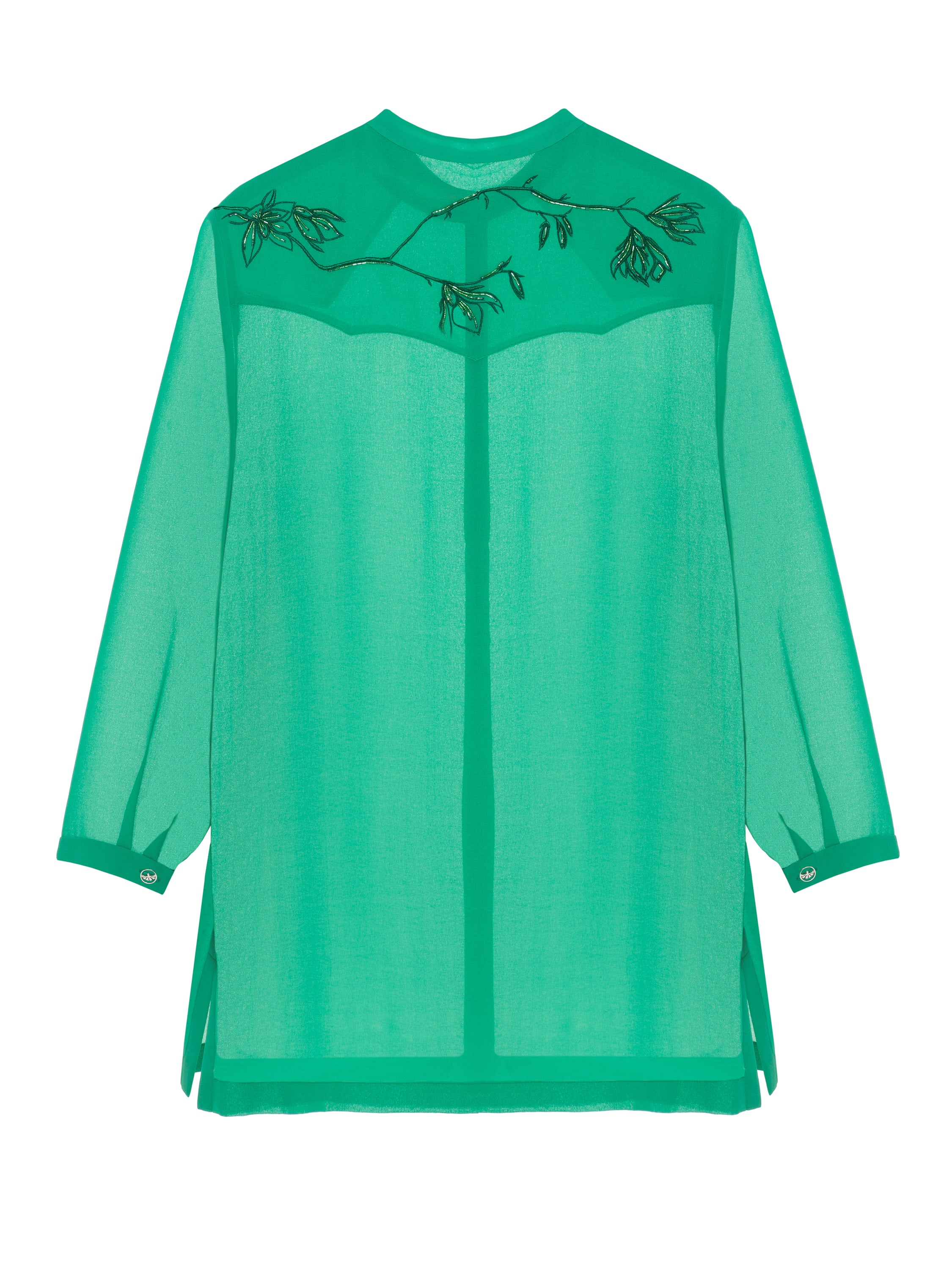 A bright green chiffon blouse will become a vibrant accent in your look. The model is complemented by delicate embroidery on the back.
