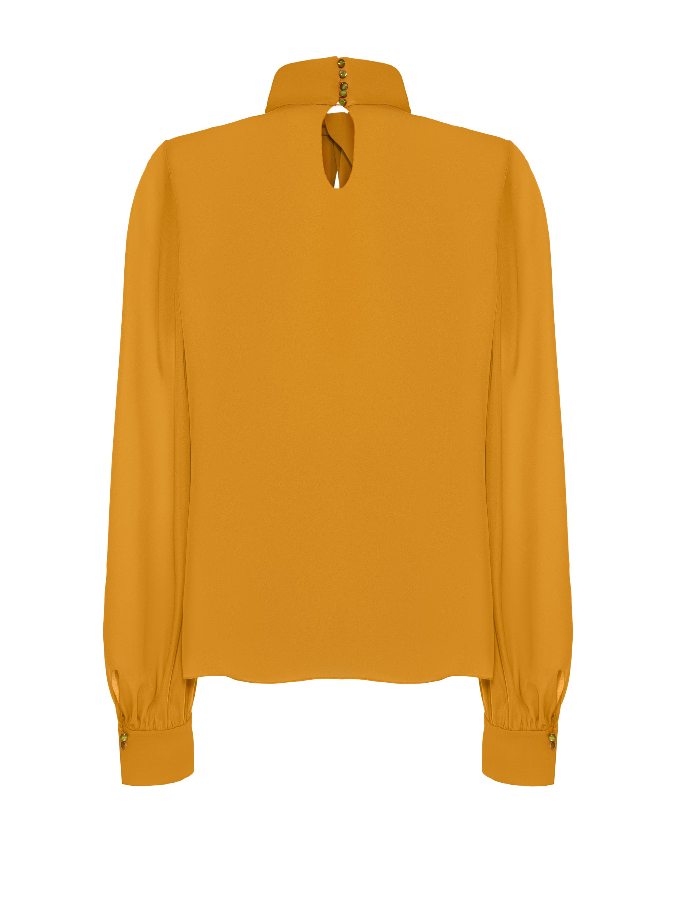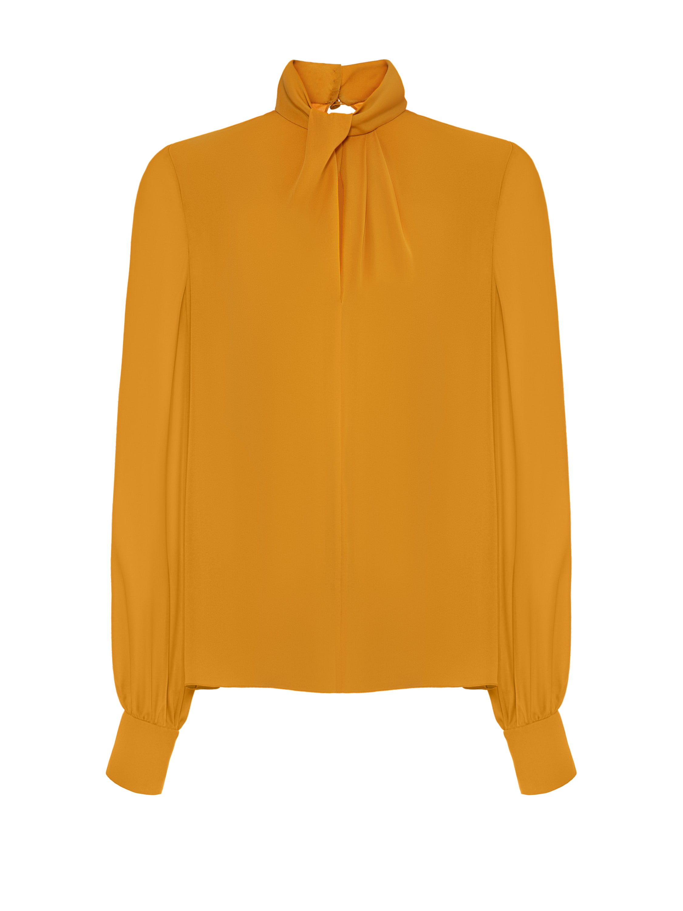 The yellow silk blouse will become a bright accent in an everyday look. The basic model looks elegant due to the stand-up collar with understated draping.