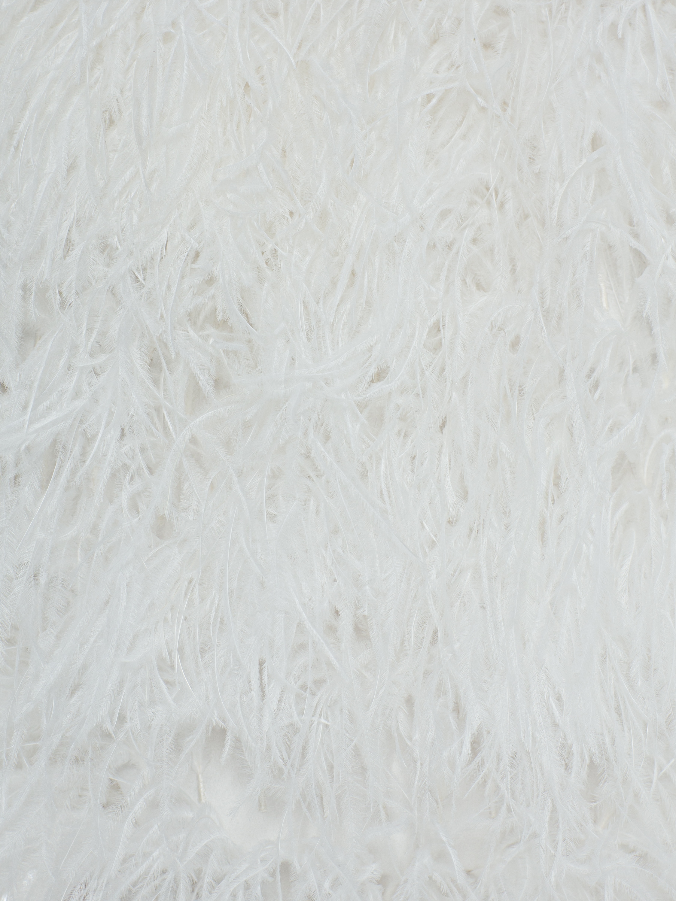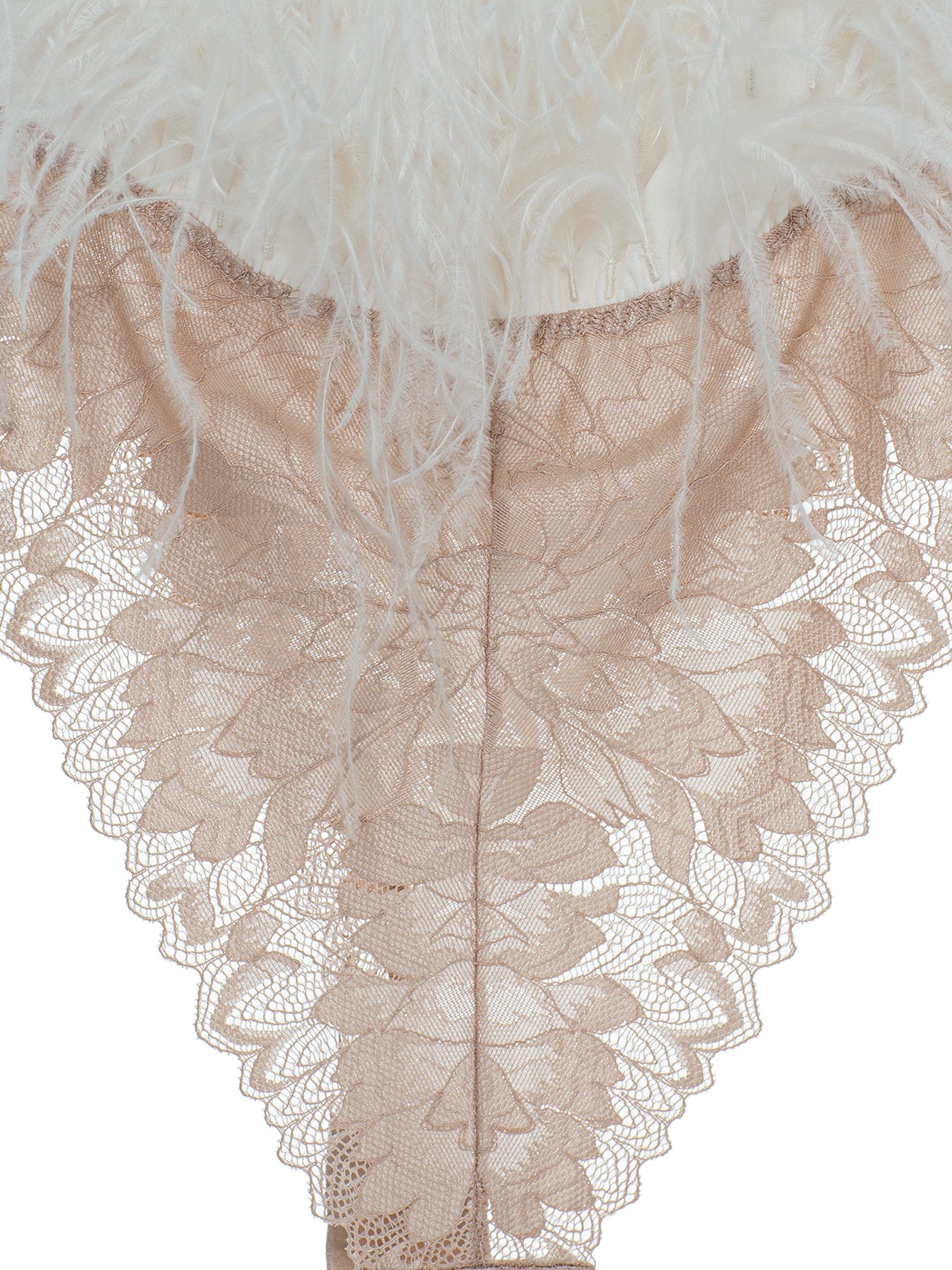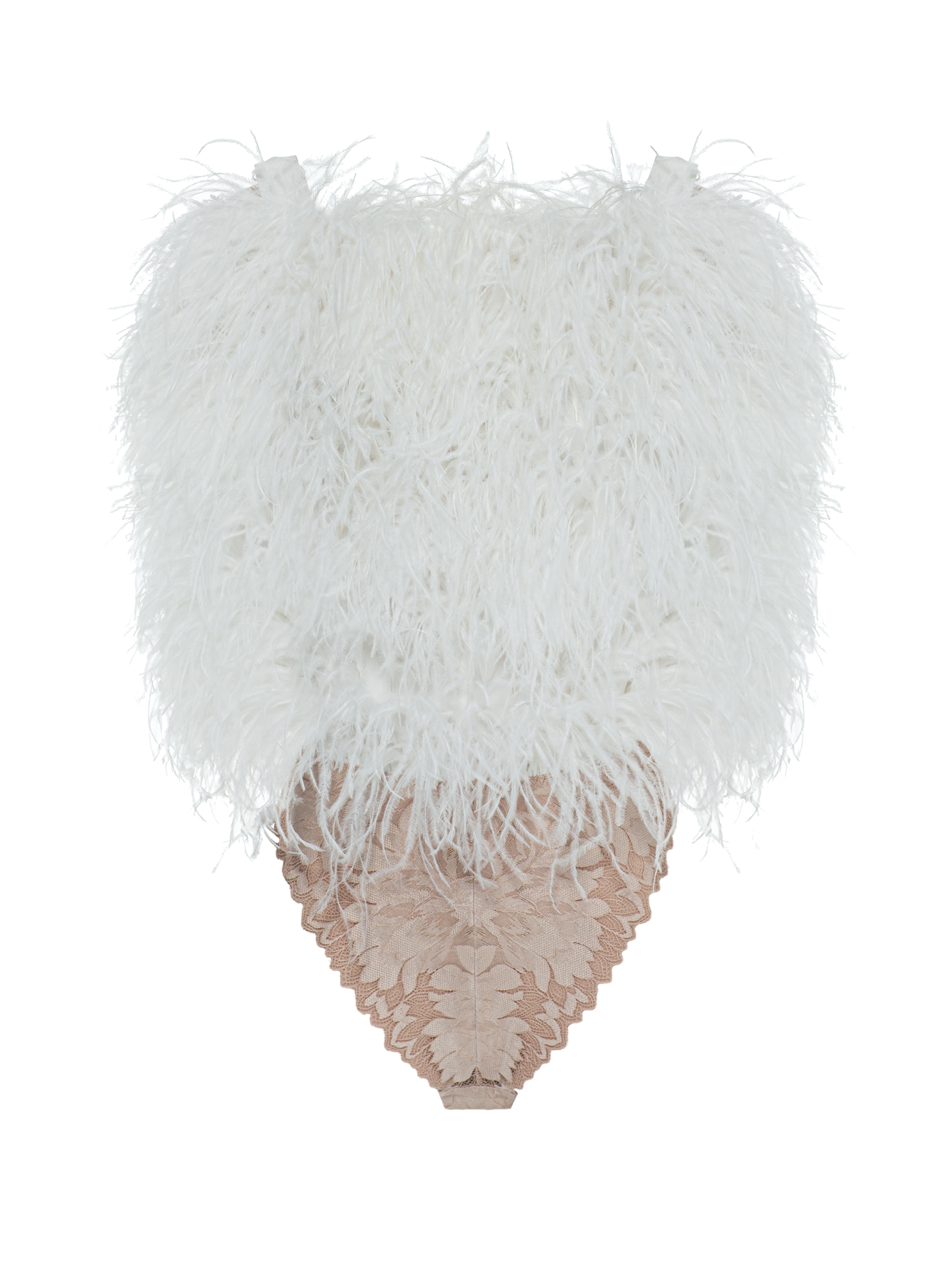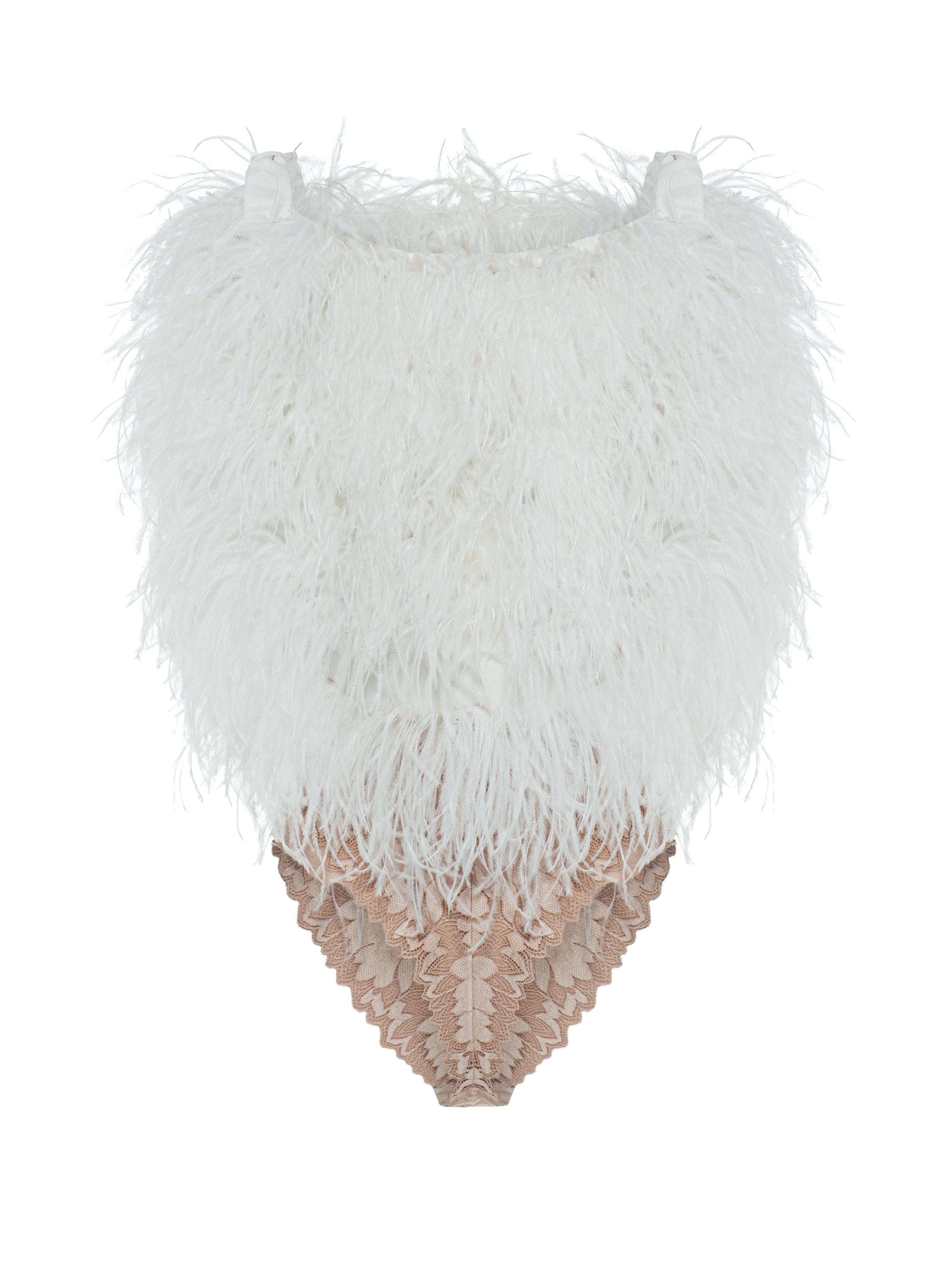 The bodysuit is made of chiffon, hand-embroidered with white ostrich feathers. The bottom of the piece is made of beige lace. Straps with bows. The craftsmen of the YANA Fashion House spent 65 hours of handwork decorating the piece.