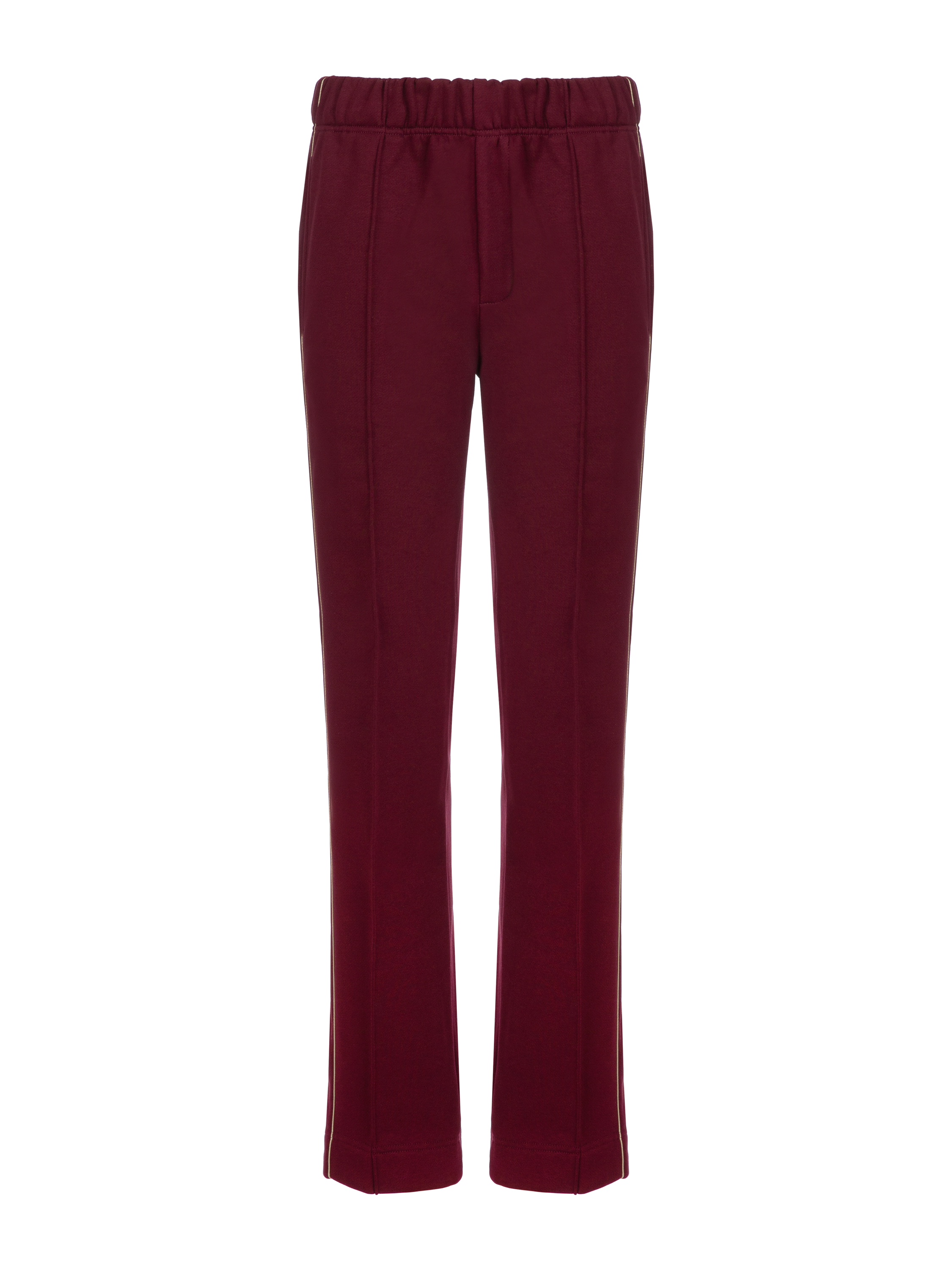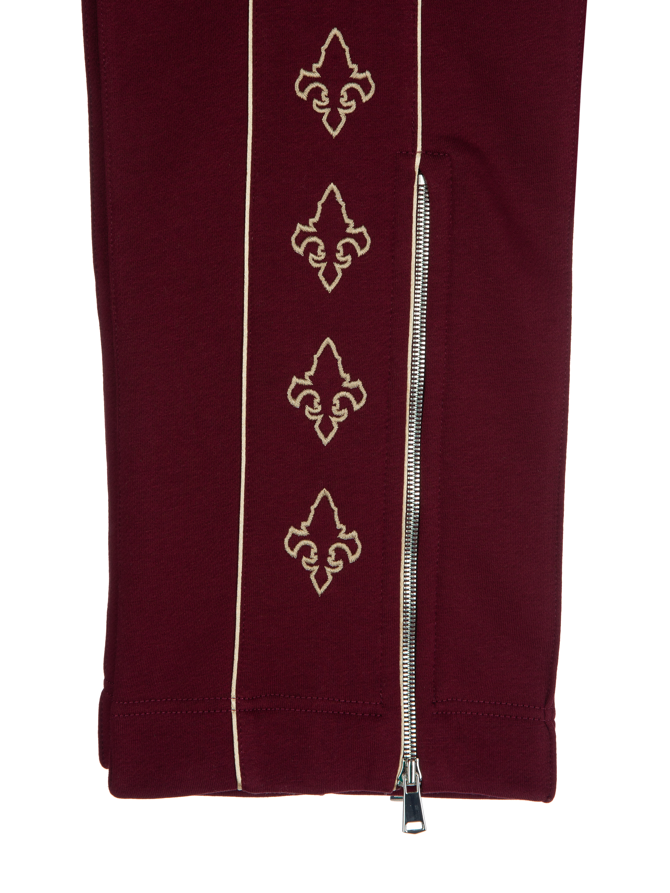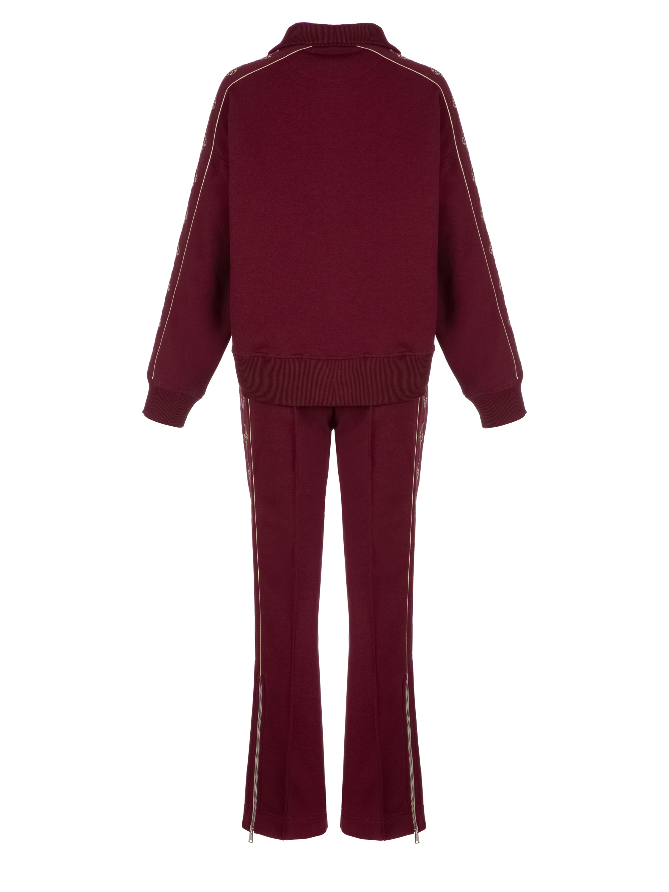The knitted suit is made of burgundy jersey and consists of a cropped sweatshirt with a stand-up collar and zipper and sweatpants. The cuffs and collar are finished with a wide elastic band. The sweatshirt is decorated with beige embroidery in the form of heraldic lilies on the sleeves. The trousers are complemented with side stripes and zippers at the bottom.