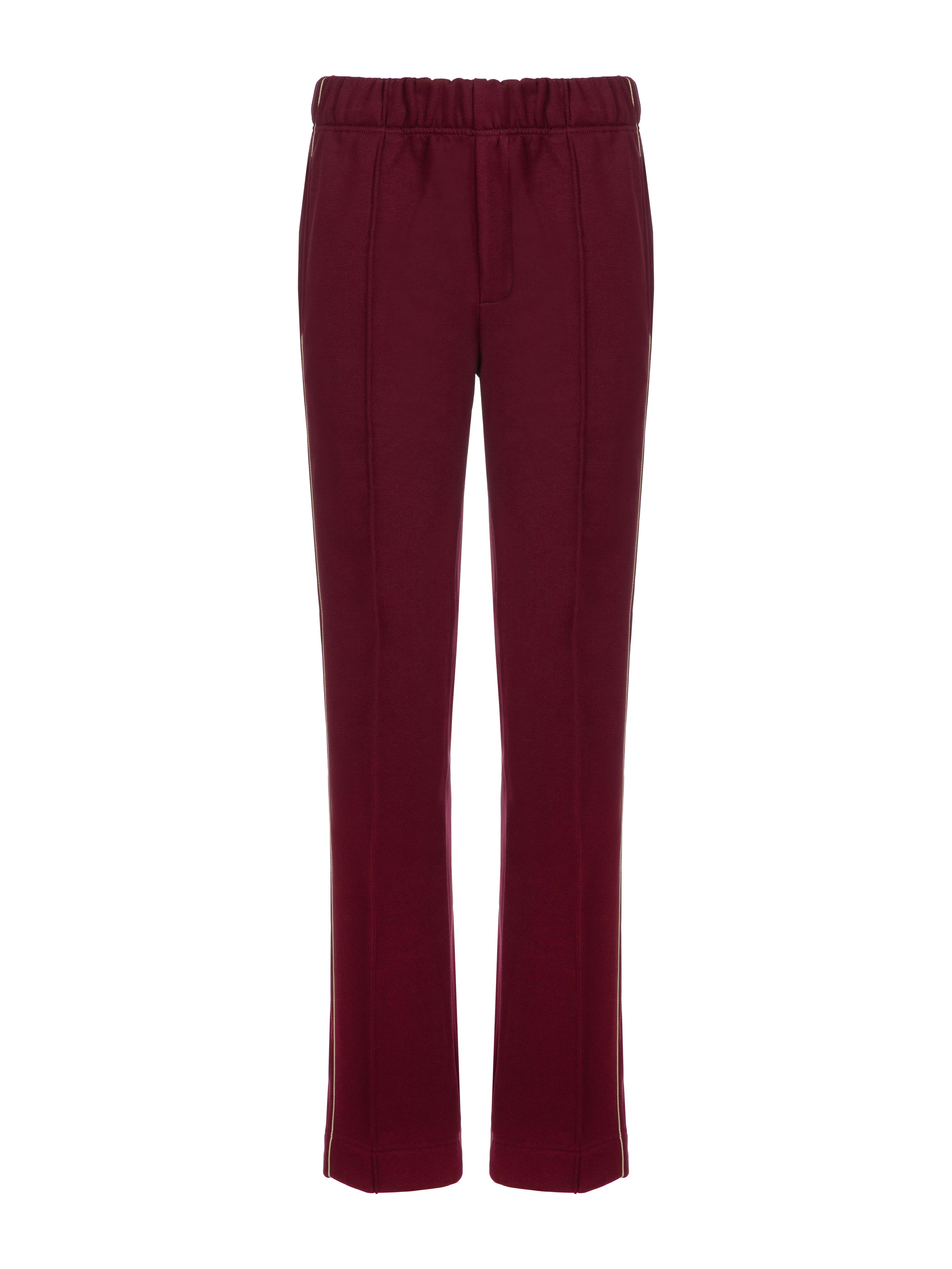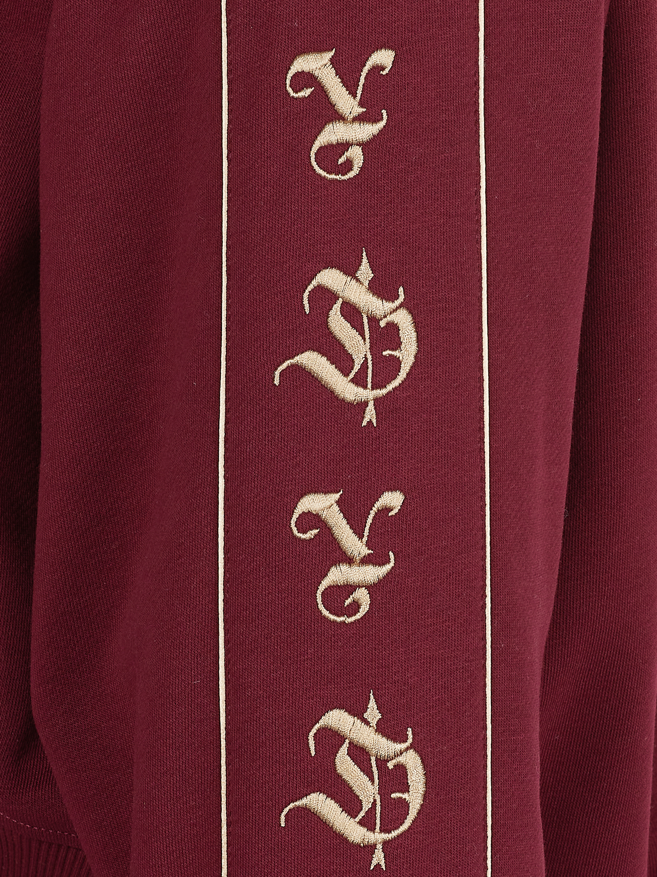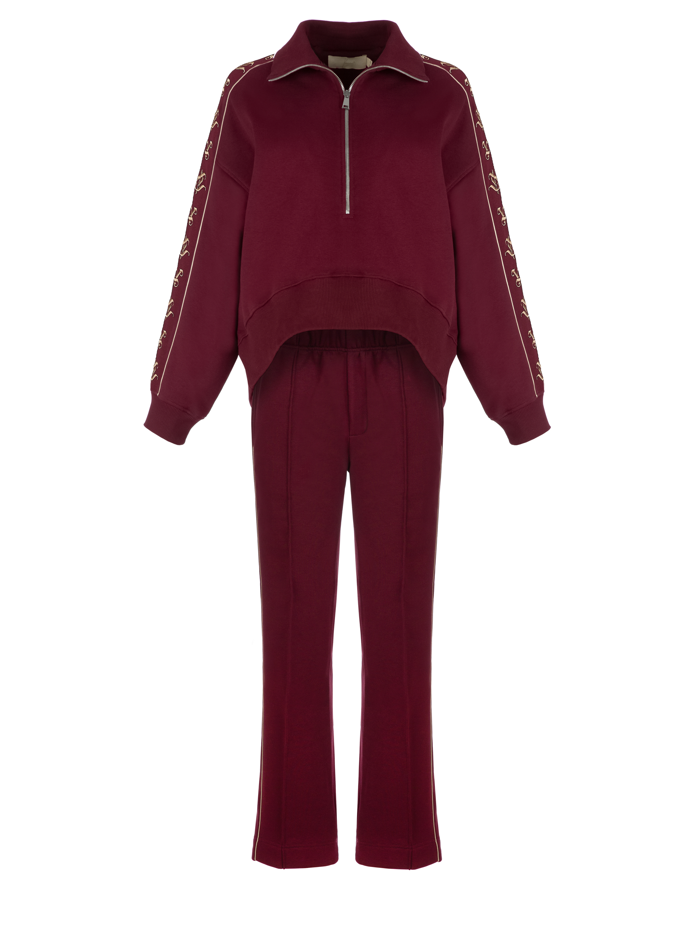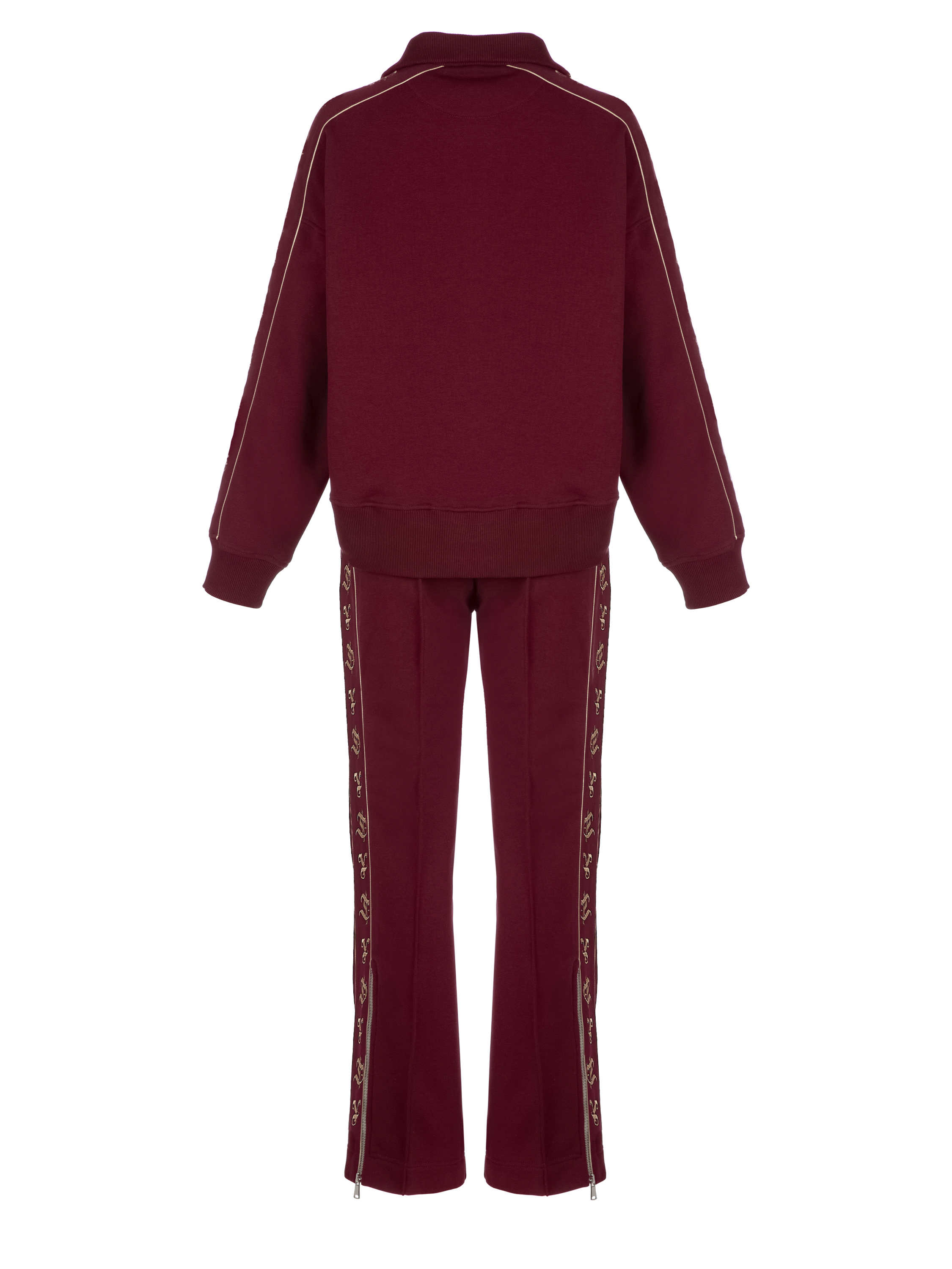 The knitwear suit is made of burgundy jersey and consists of a cropped sweatshirt with a stand-up collar and zipper and track pants. The cuffs and collar are finished with a wide elastic band. The sweatshirt is decorated with beige YD embroidery on the sleeves. The trousers are complemented with side stripes and zippers at the bottom.