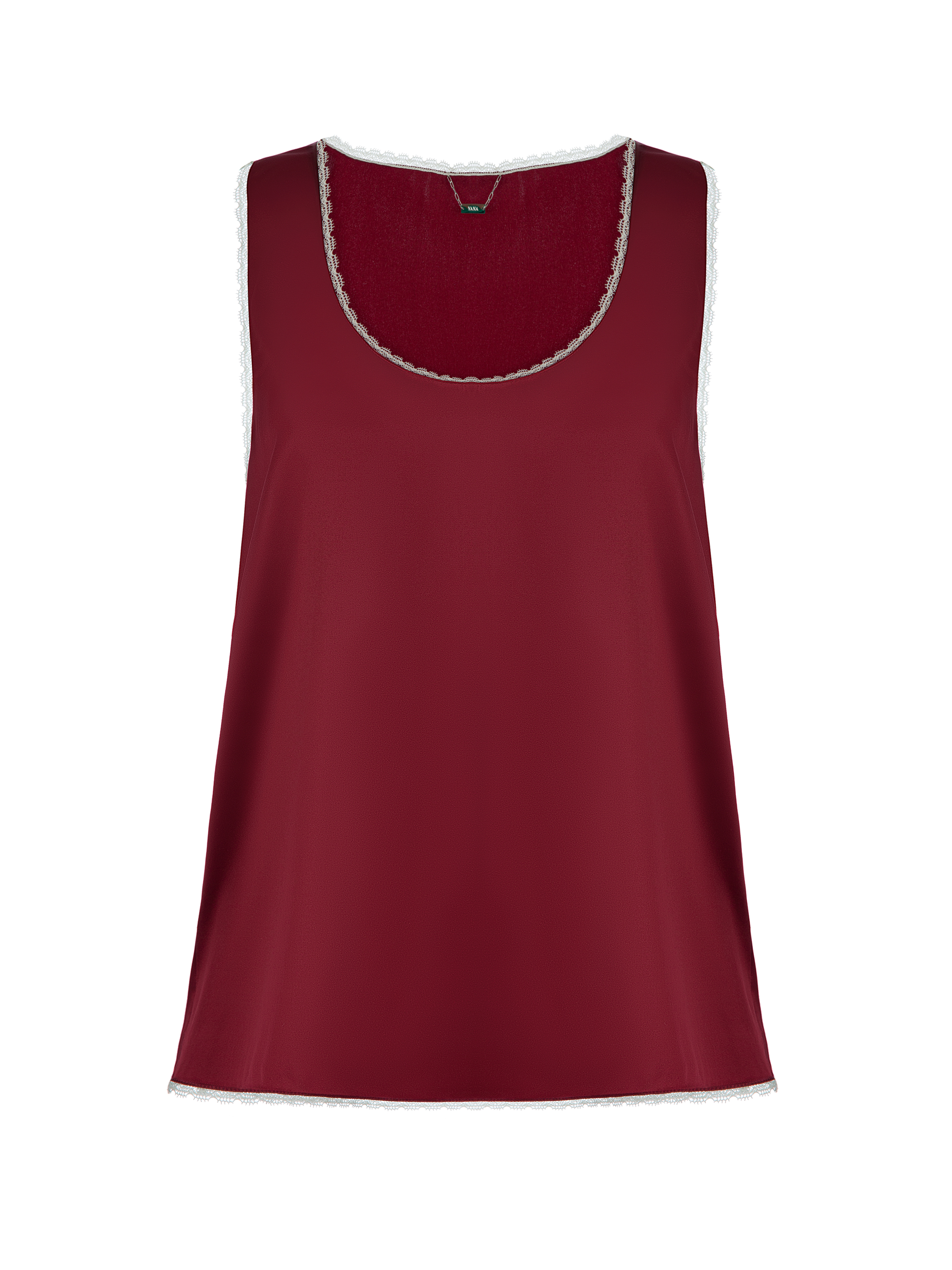A burgundy top with a round neckline is made of natural silk. The piece is decorated with white lace trim.