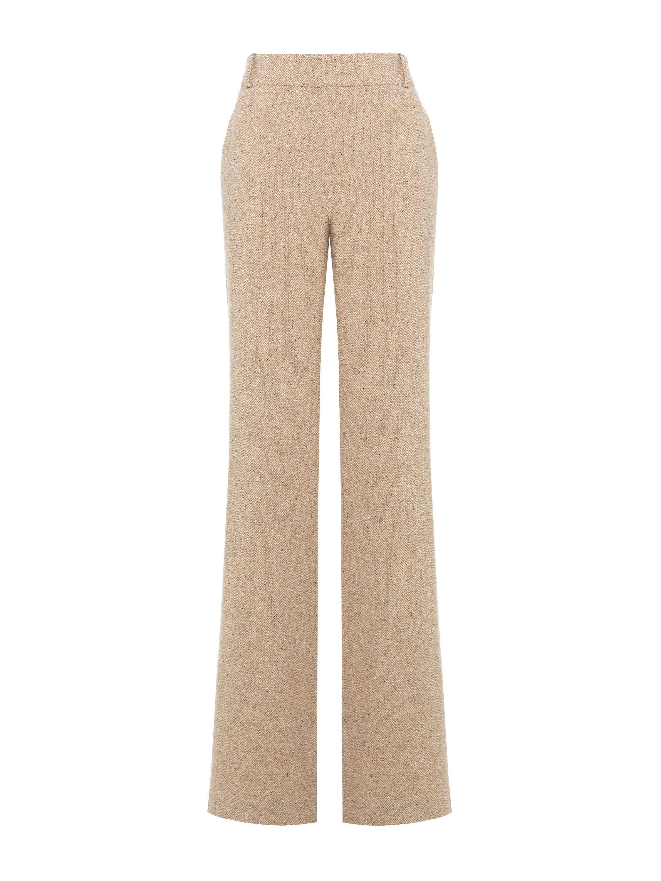 Beige trousers are made of wool suiting fabric with a delicate herringbone pattern. The straight-cut high-waisted model perfectly accentuates the waistline.
