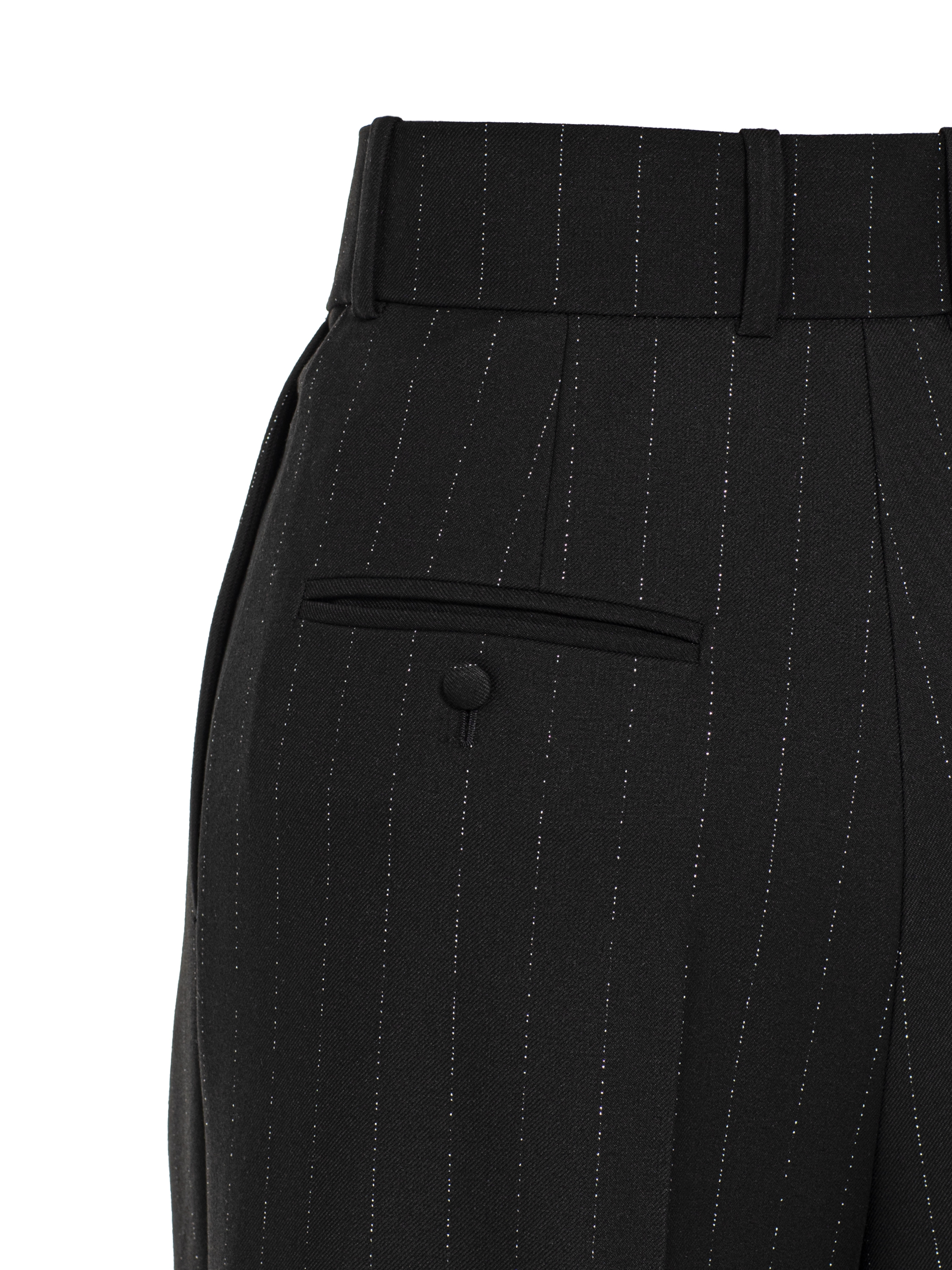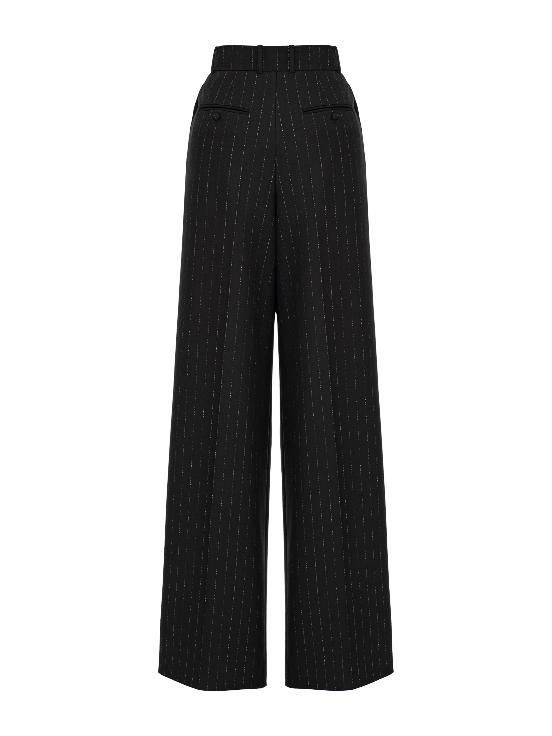 Classic black palazzo trousers with a vertical stripe create a slim, elongated silhouette. Front pleats add dynamism to the piece, while pressed creases bring in an element of formality.