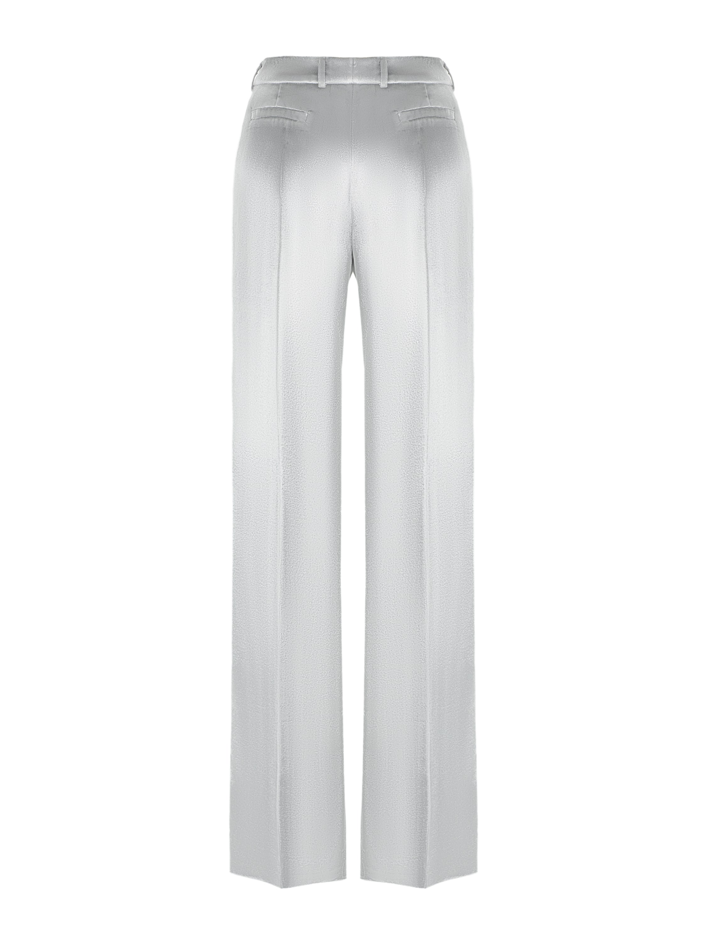 Straight-leg silver velvet trousers will become an original accent in the look. The model with a classic fit will pair well with both elongated and cropped tops.