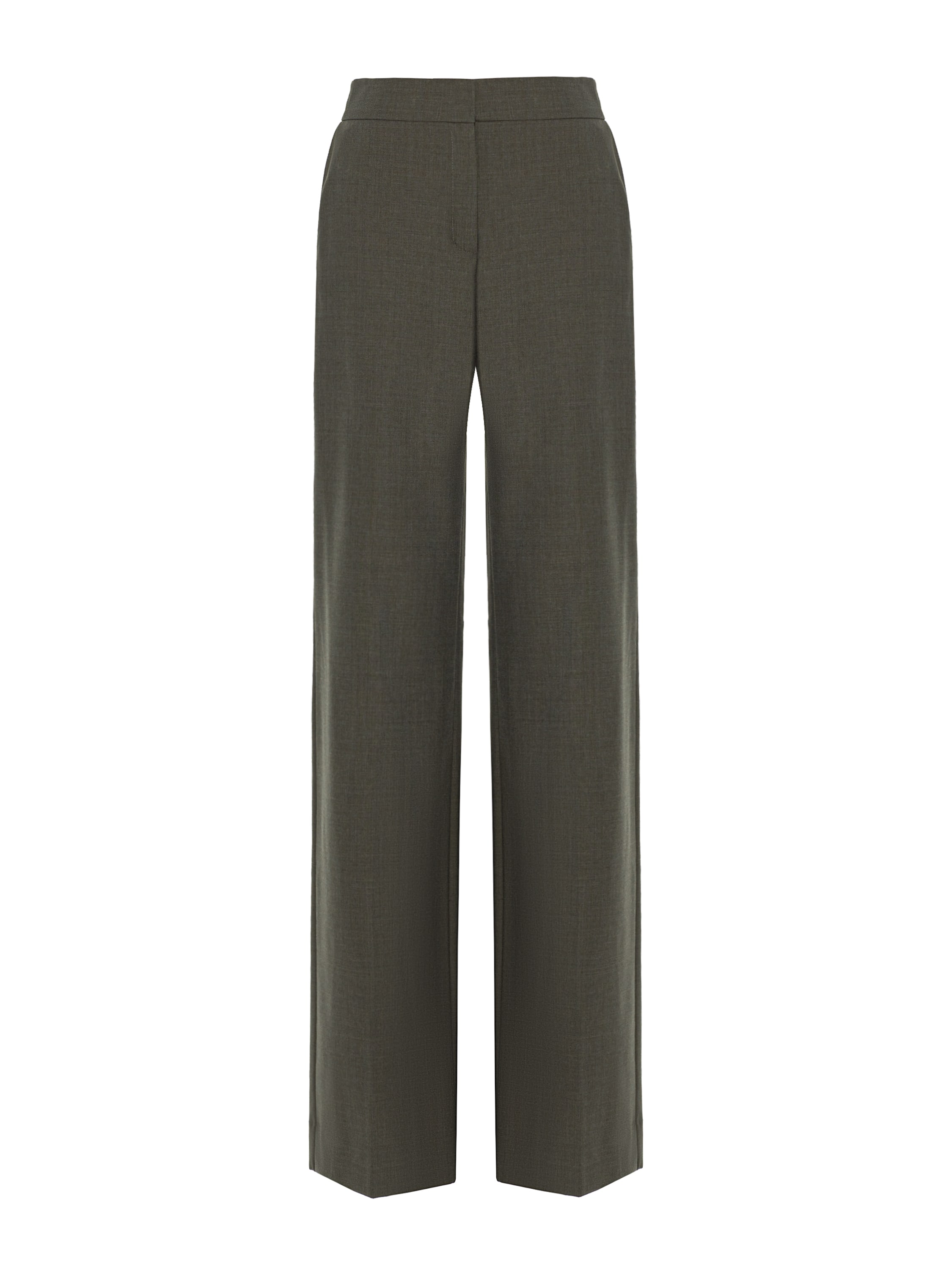 Straight-leg trousers with creases are made of khaki wool suiting fabric. High-rise style.