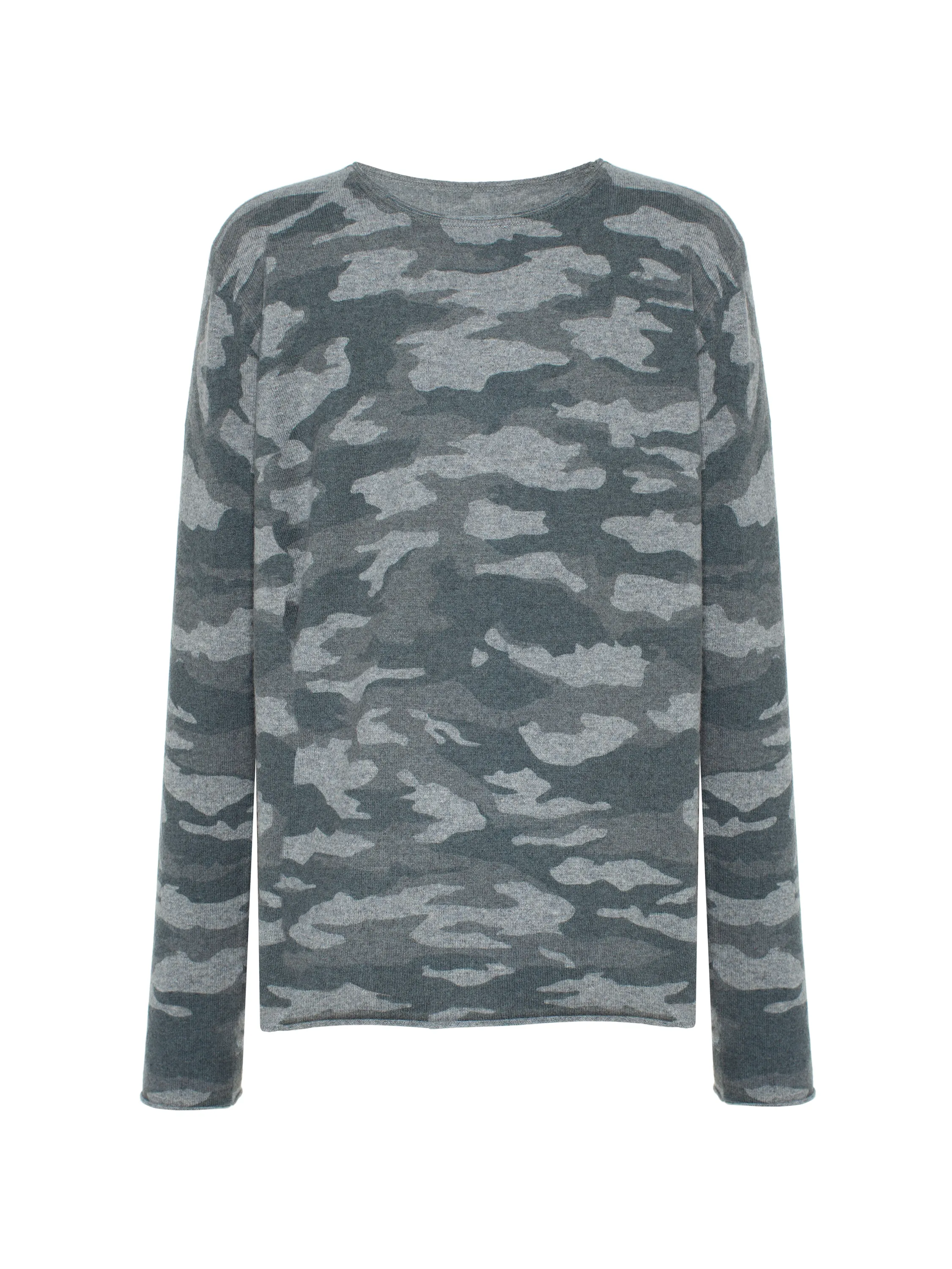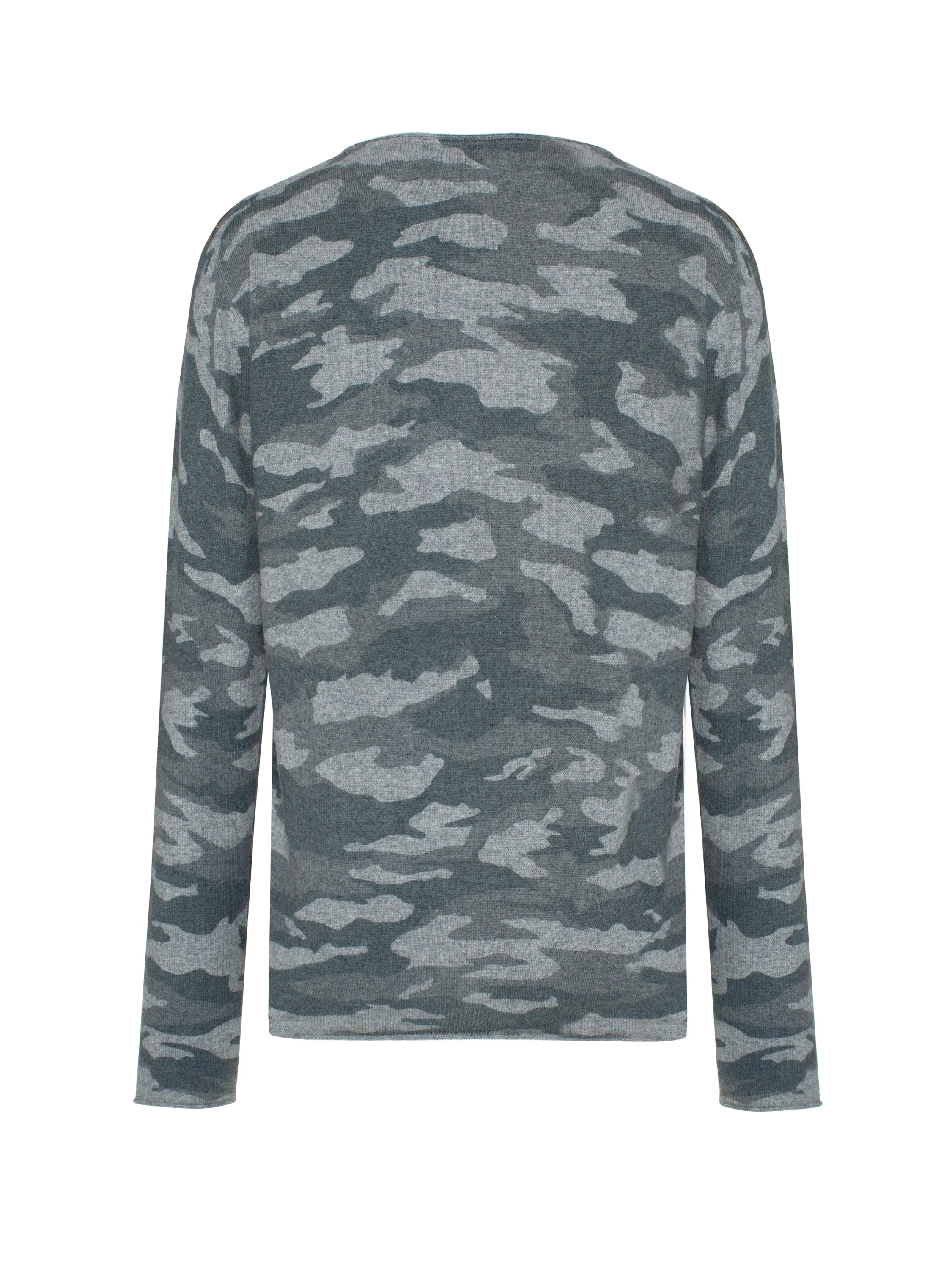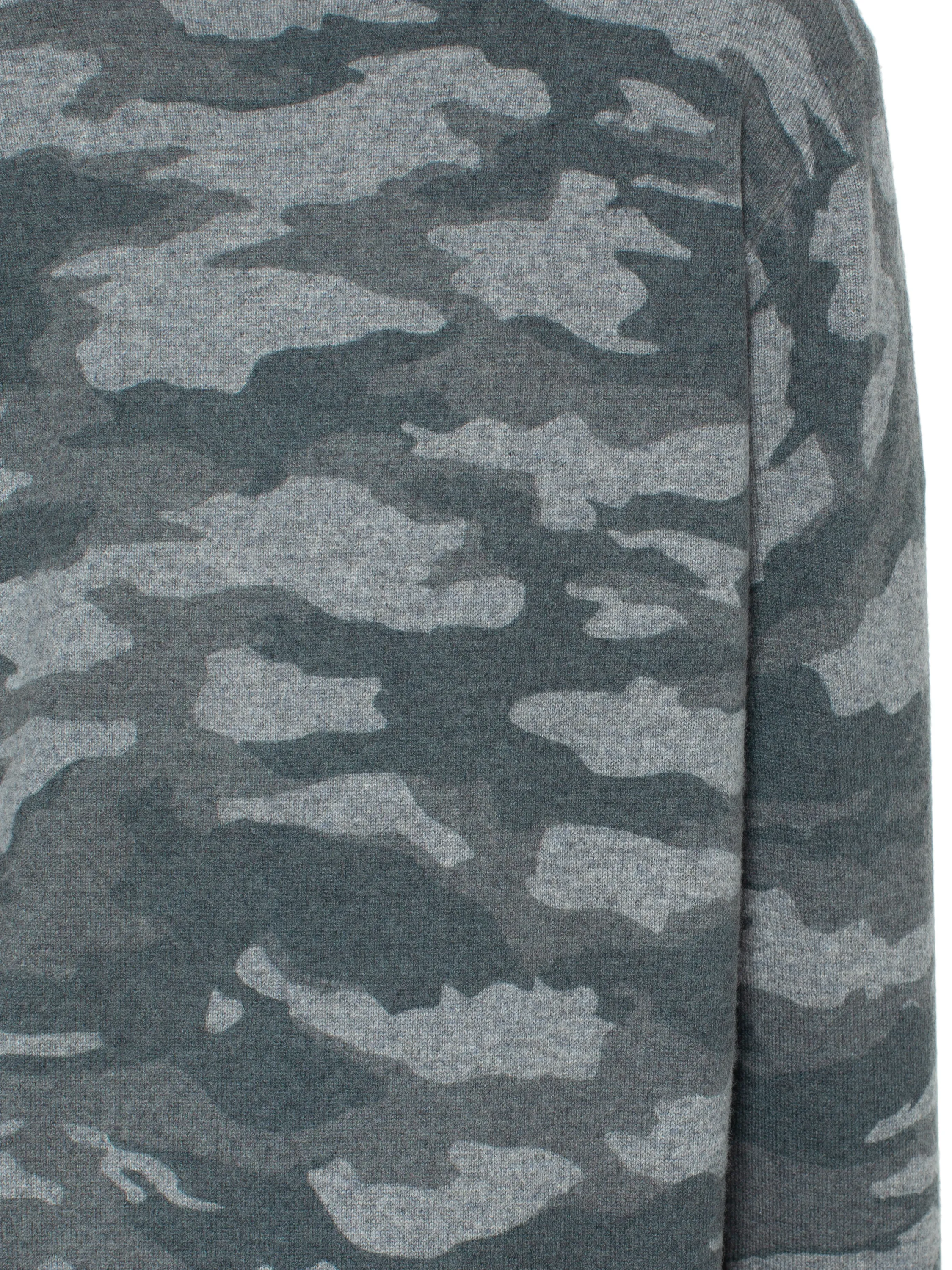 Gray men's sweater made of natural cashmere with a camouflage print is a comfortable everyday option. A model made of this material provides natural thermoregulation, allowing air to pass through and the skin to breathe. The piece is crafted from baby cashmere – a light and fine yarn made from the undercoat of cashmere-breed kids under one year old.