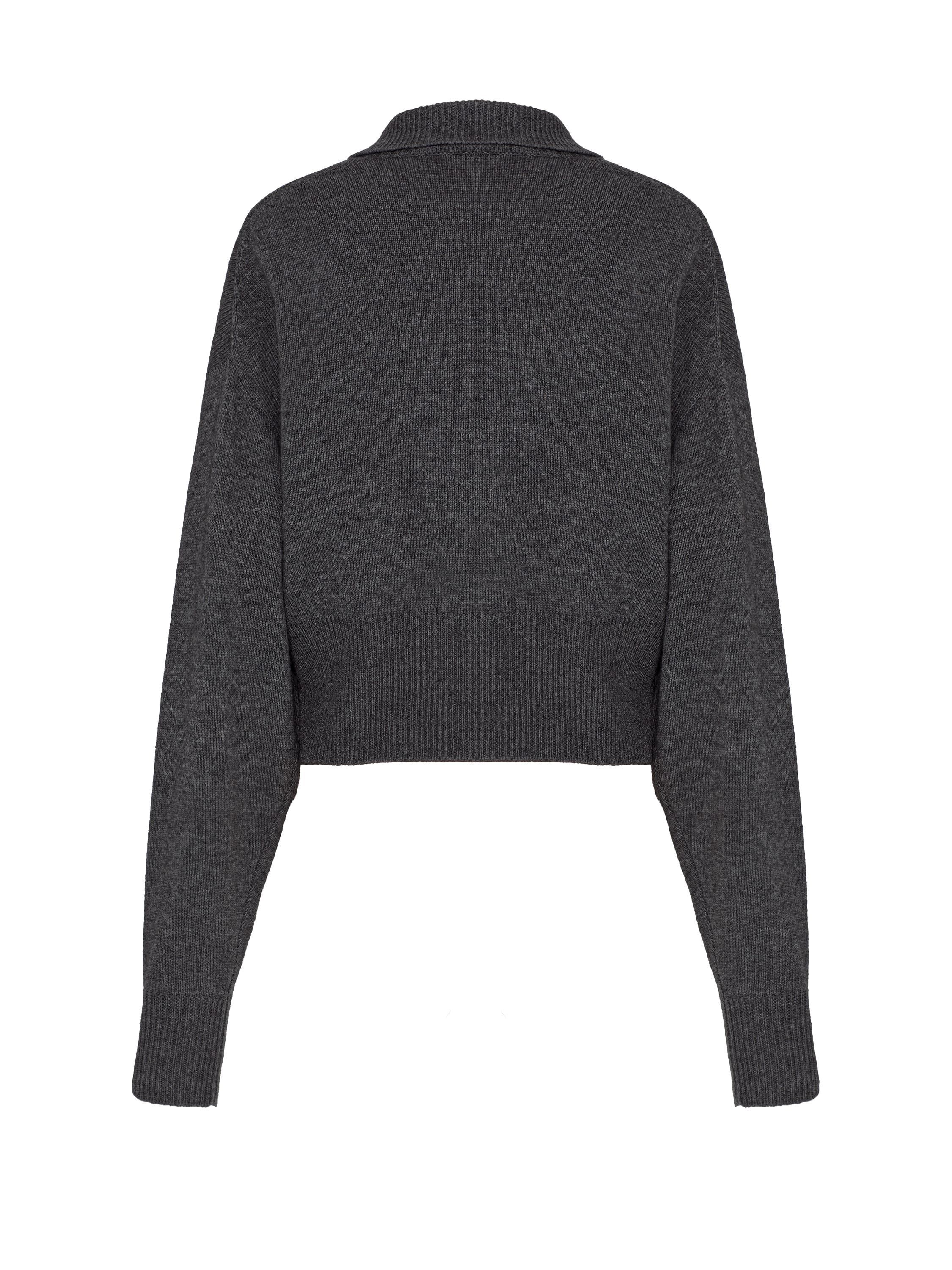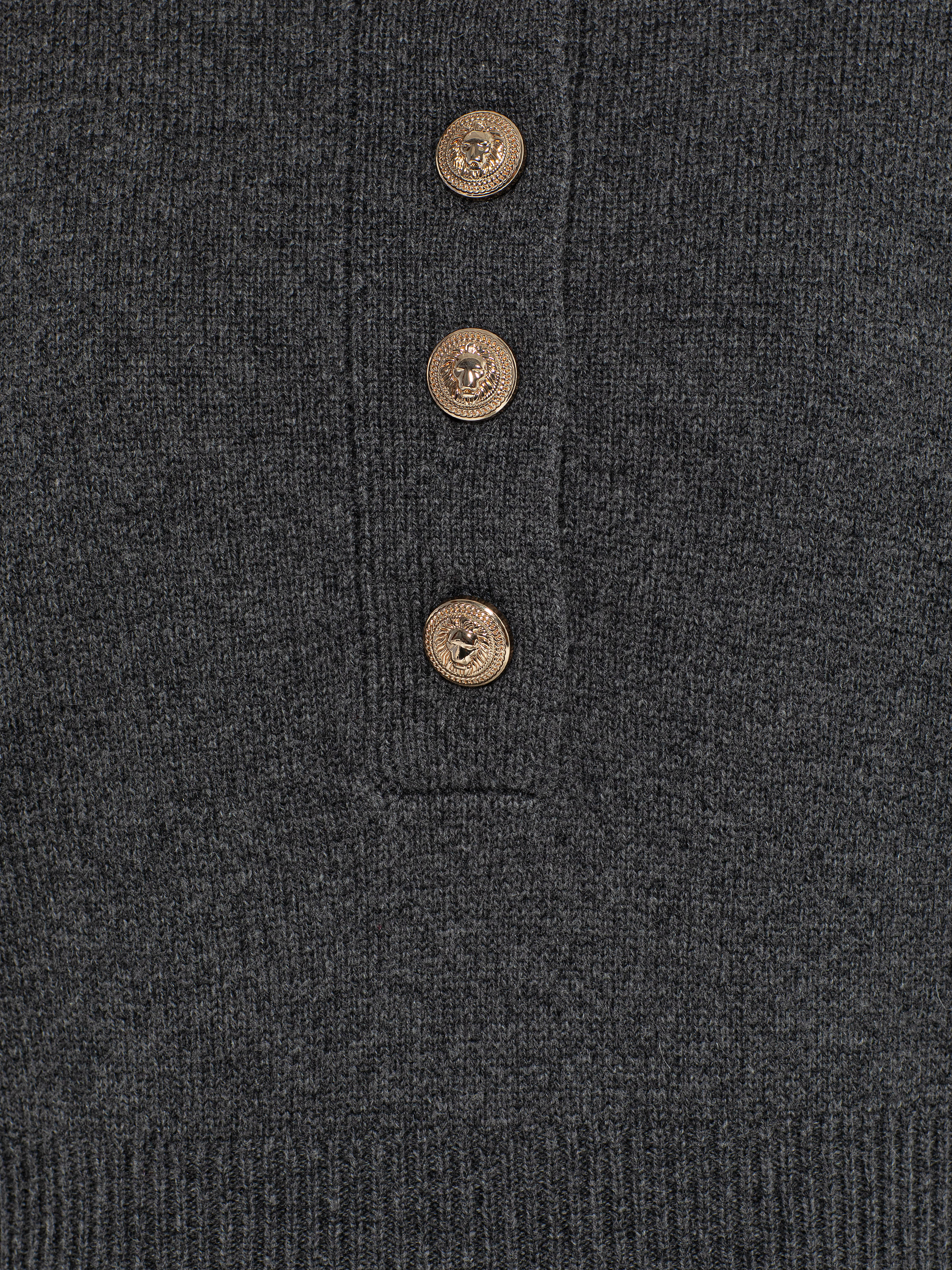 The grey cropped jumper with a stand collar is made of merino wool with added cashmere. The design is embellished with striking gold-tone buttons.