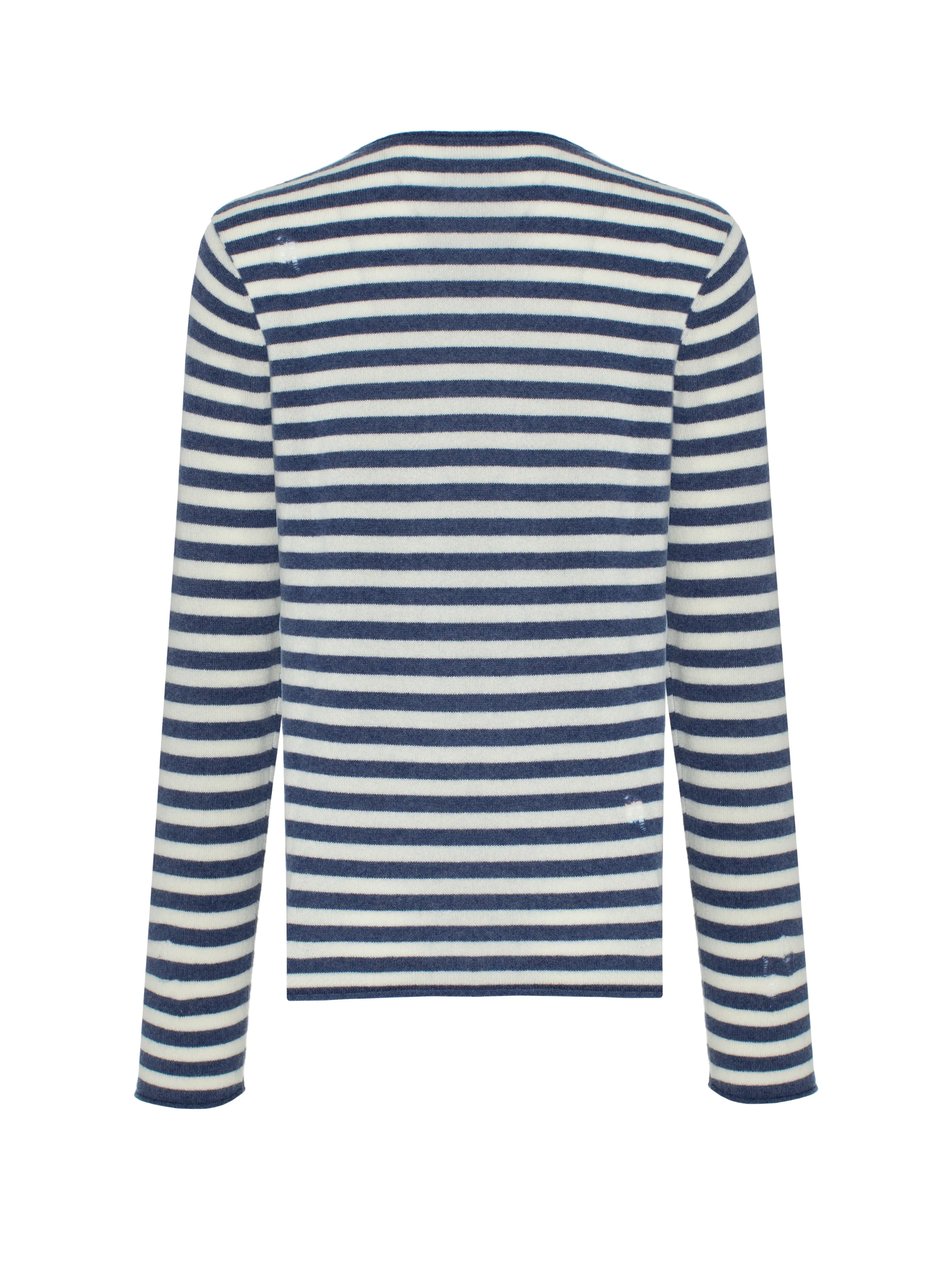 The men's long-sleeve top in white and blue stripes is made of baby cashmere, a premium-quality yarn from the undercoat of cashmere-breed kids under one year old. The loose-fit model does not restrict movement; the material holds its shape well and practically does not wrinkle. The piece is decorated with ornamental holes on the shoulders.