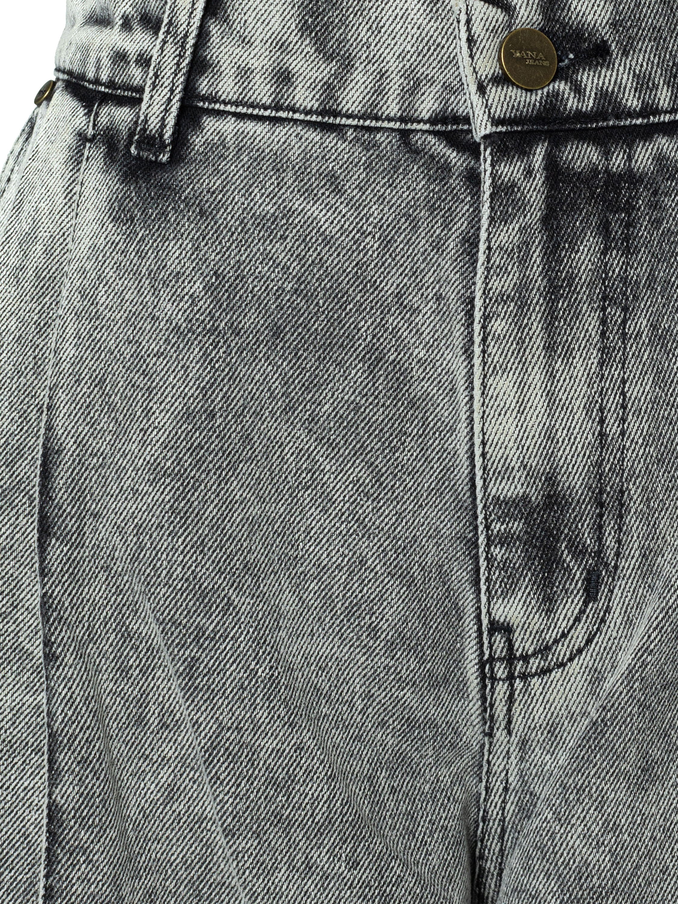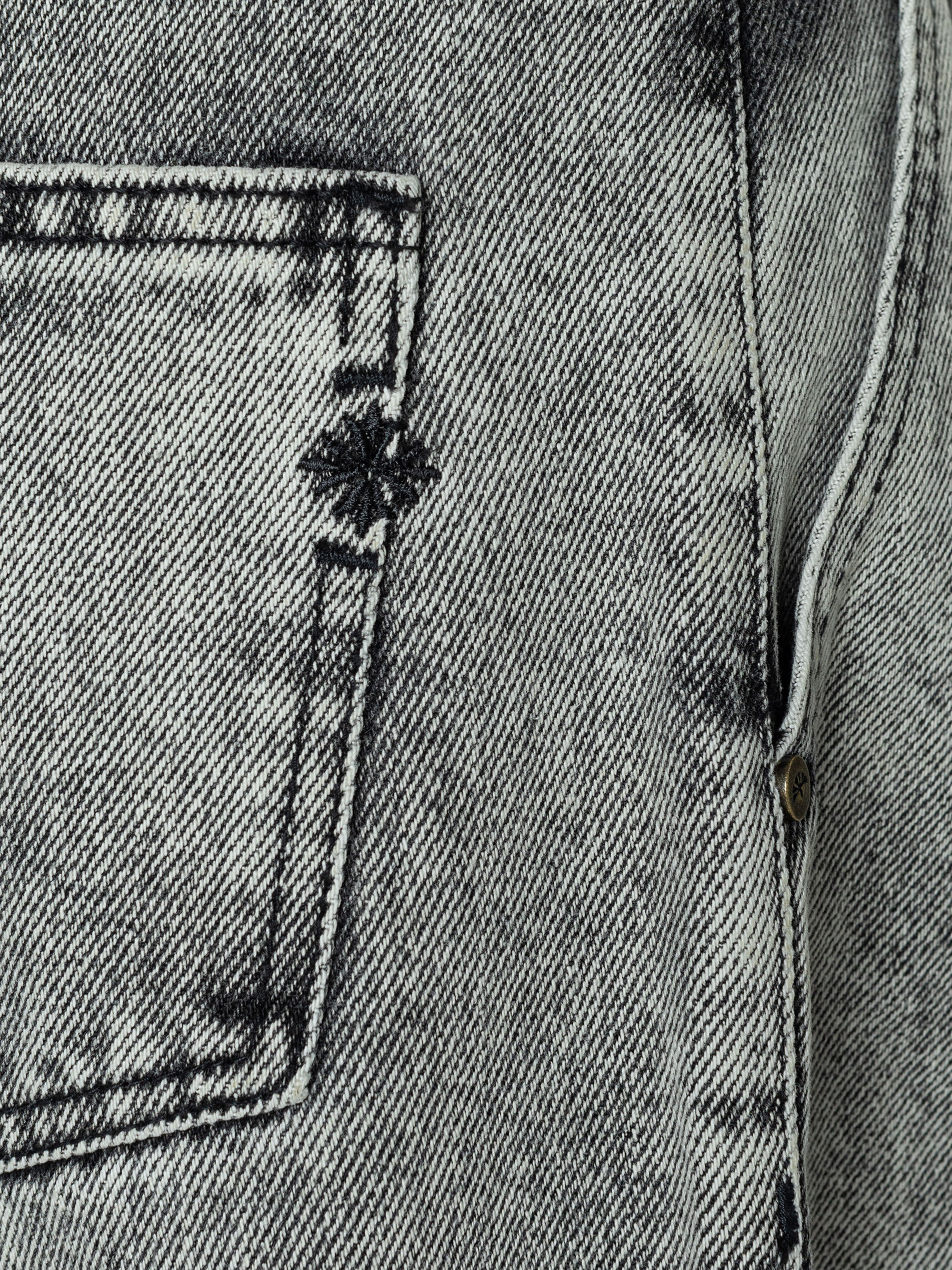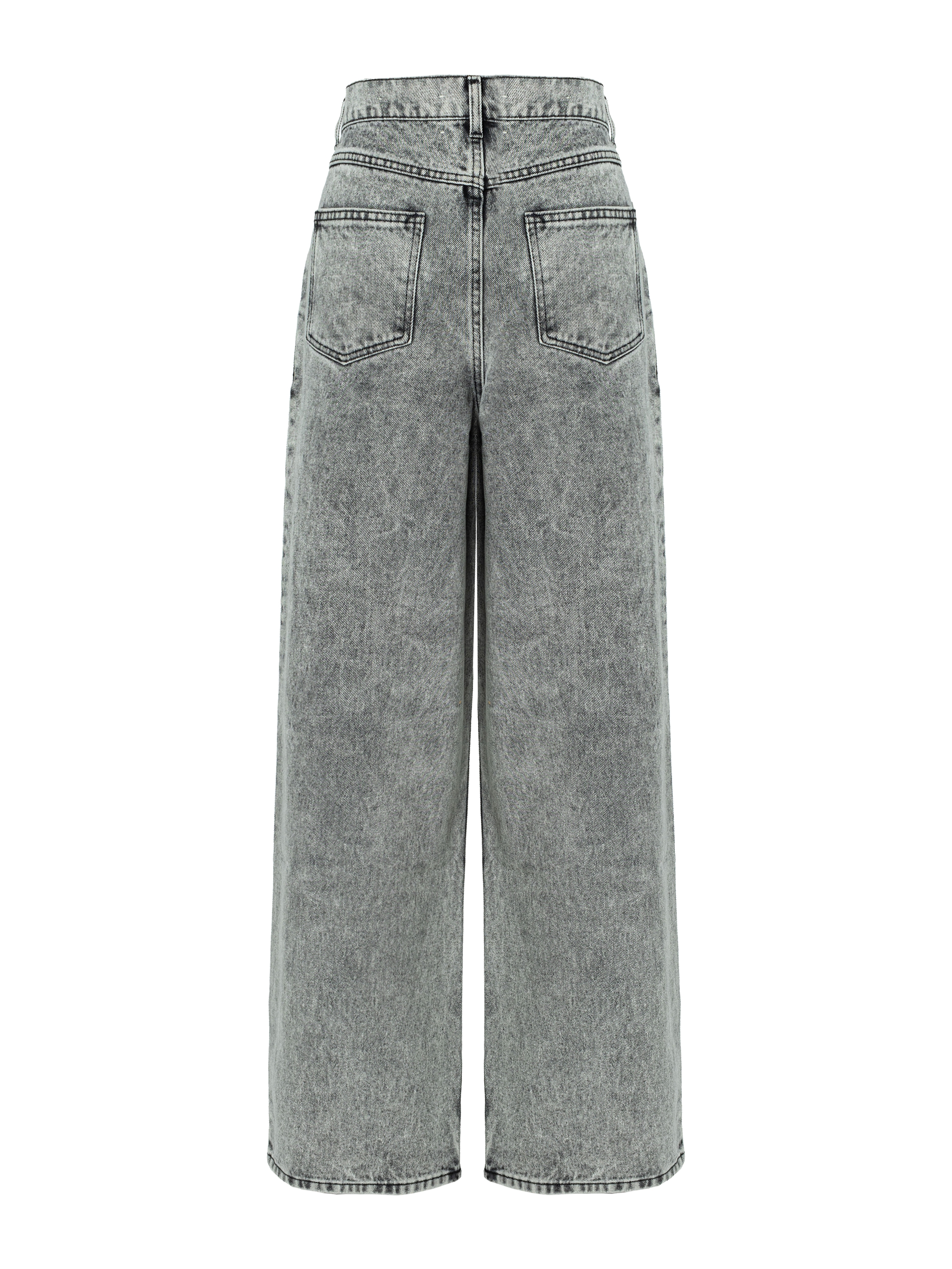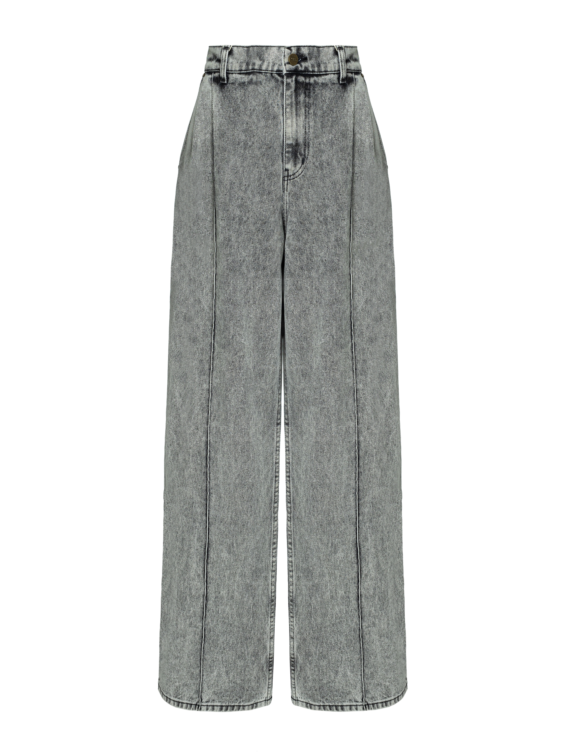 Grey pleated jeans are made of stonewashed denim. The high-waisted model will suit any body type. The belonging to the brand is emphasized by embroidery — an updated logo in the form of a cornflower on the back pocket.