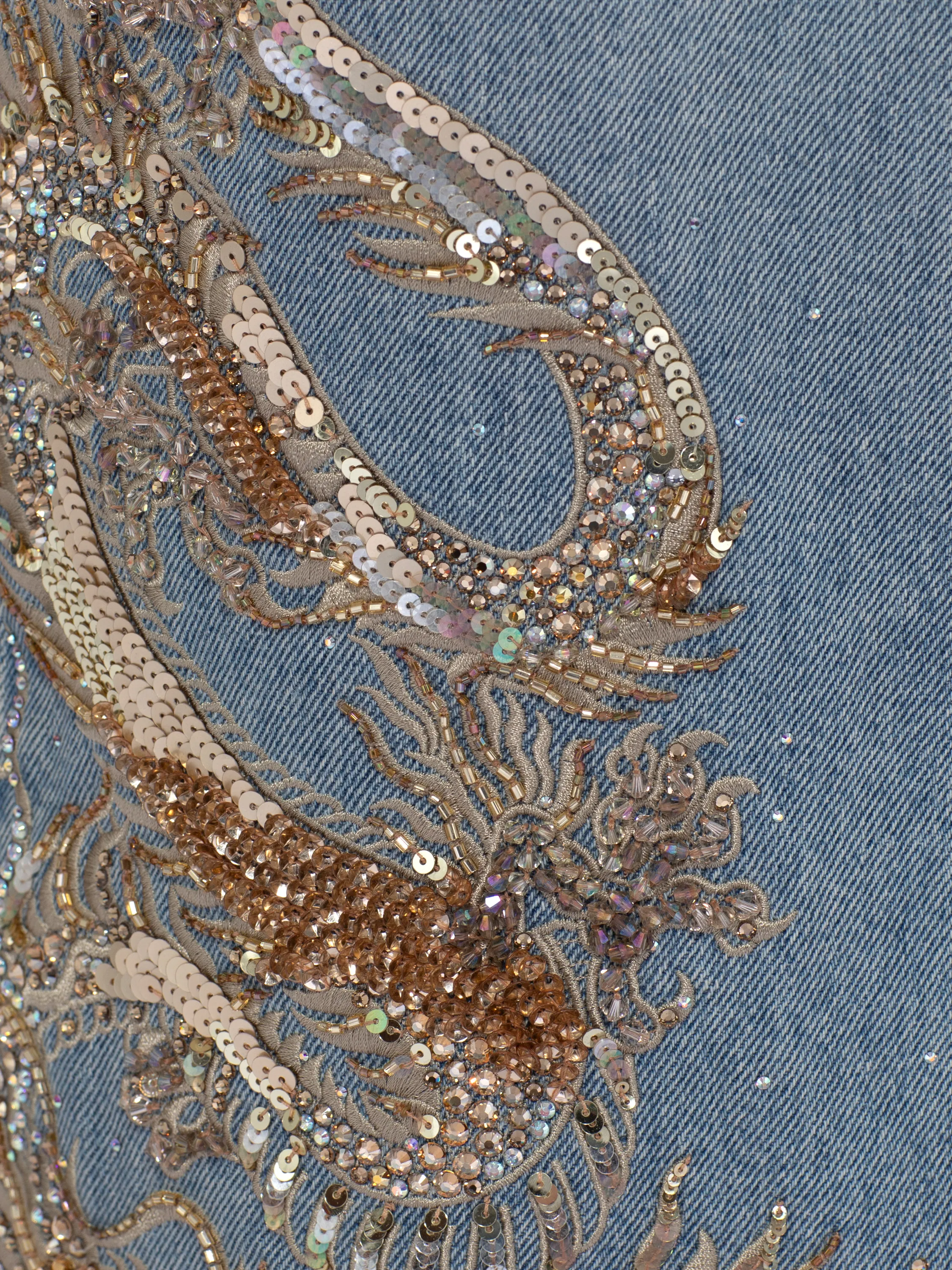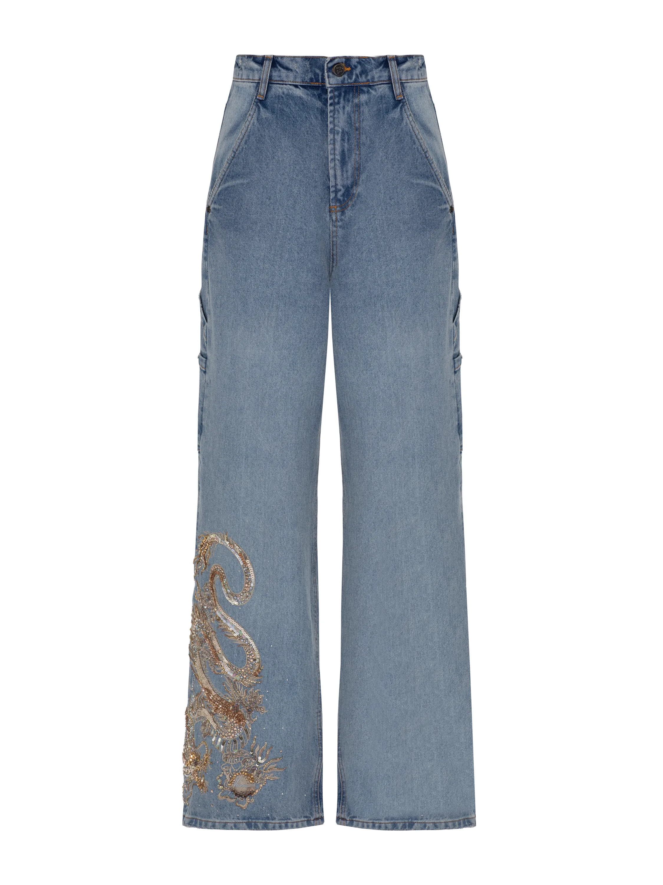 The light blue wide straight-leg jeans are a versatile model that will never go out of style. The high rise visually slims and suits any body type. Side pockets set a relaxed mood, while embroidery with rhinestones, sequins and Swarovski crystals depicting a dragon makes this basic wardrobe item unique.