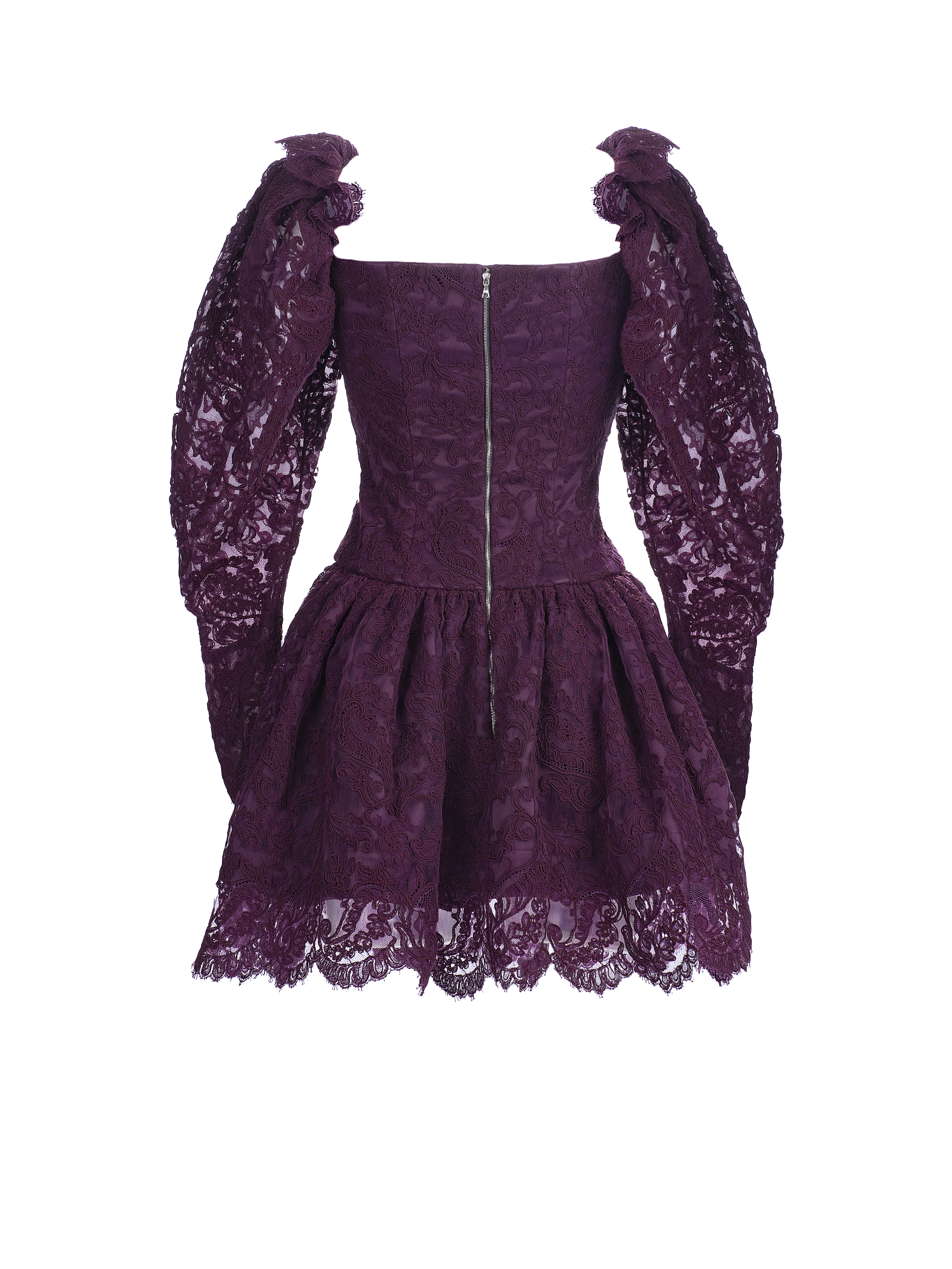 The corset mini dress is made of dark purple lace. It fastens with a zipper at the back. Voluminous long puff sleeves offer two ways of wearing – pulled up or elegantly lowered to bare the shoulders.