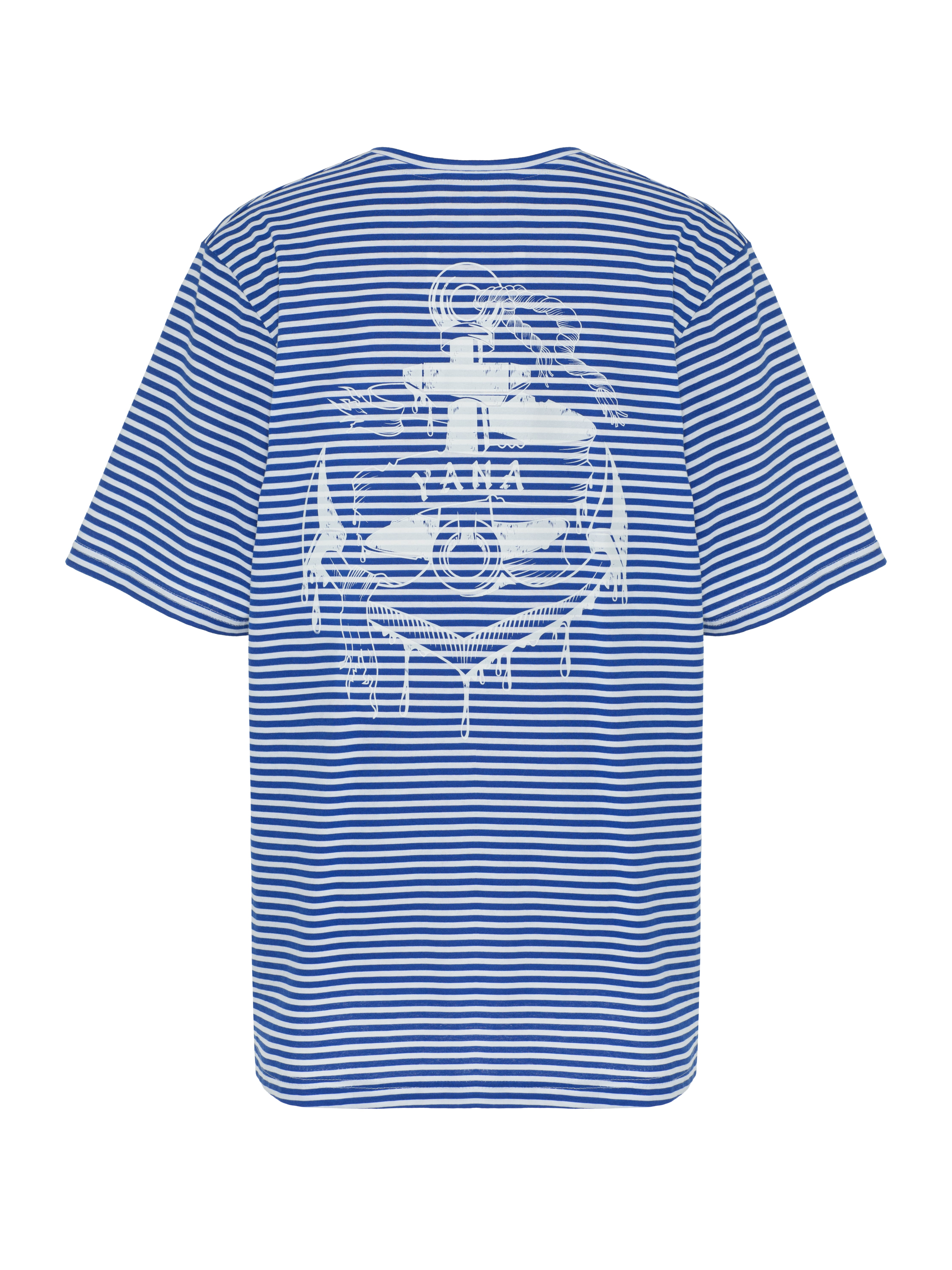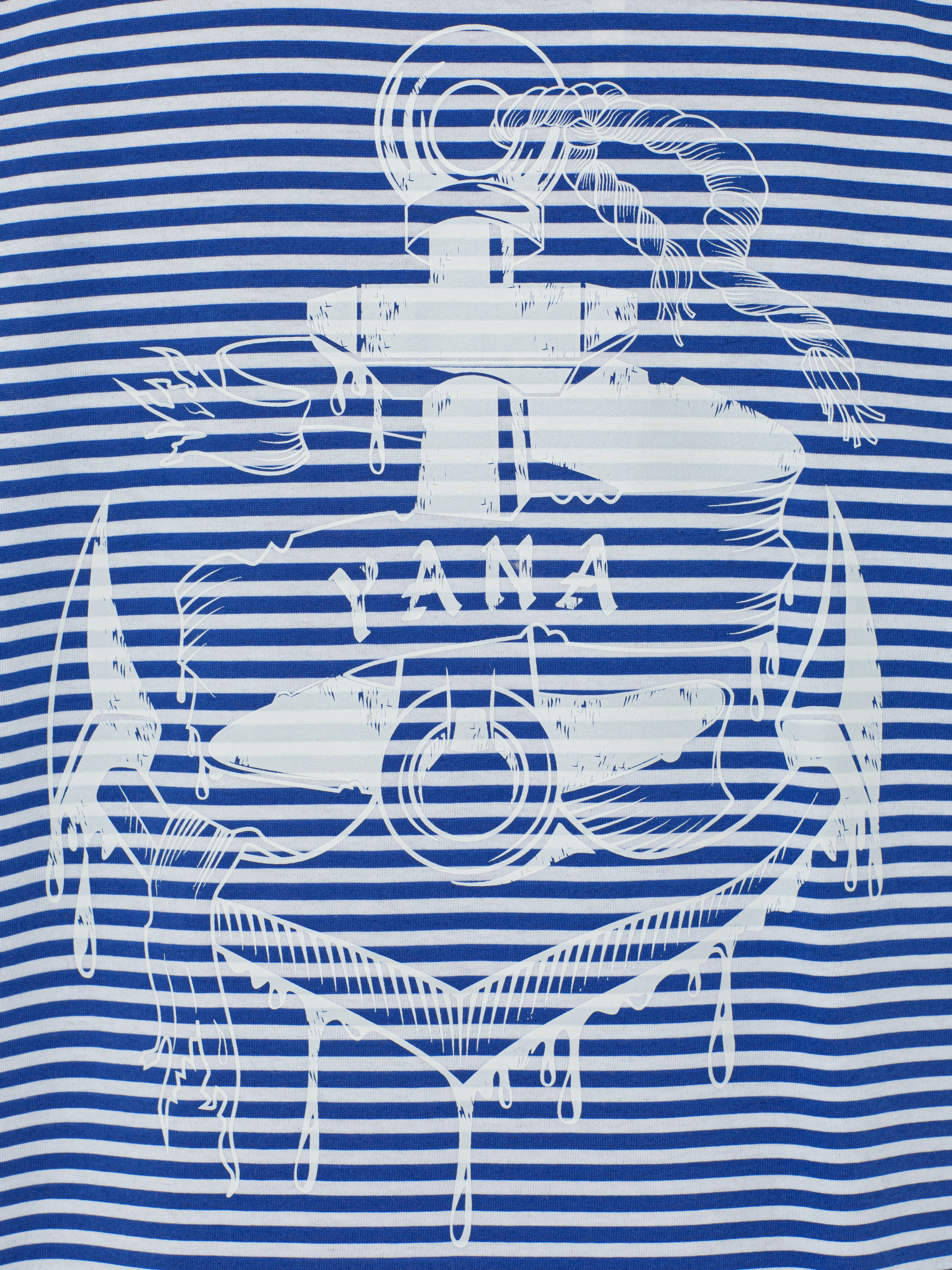 The loose-fit white and blue striped T-shirt is made of cotton fabric. On the back there is a white anchor print. Crew neck.