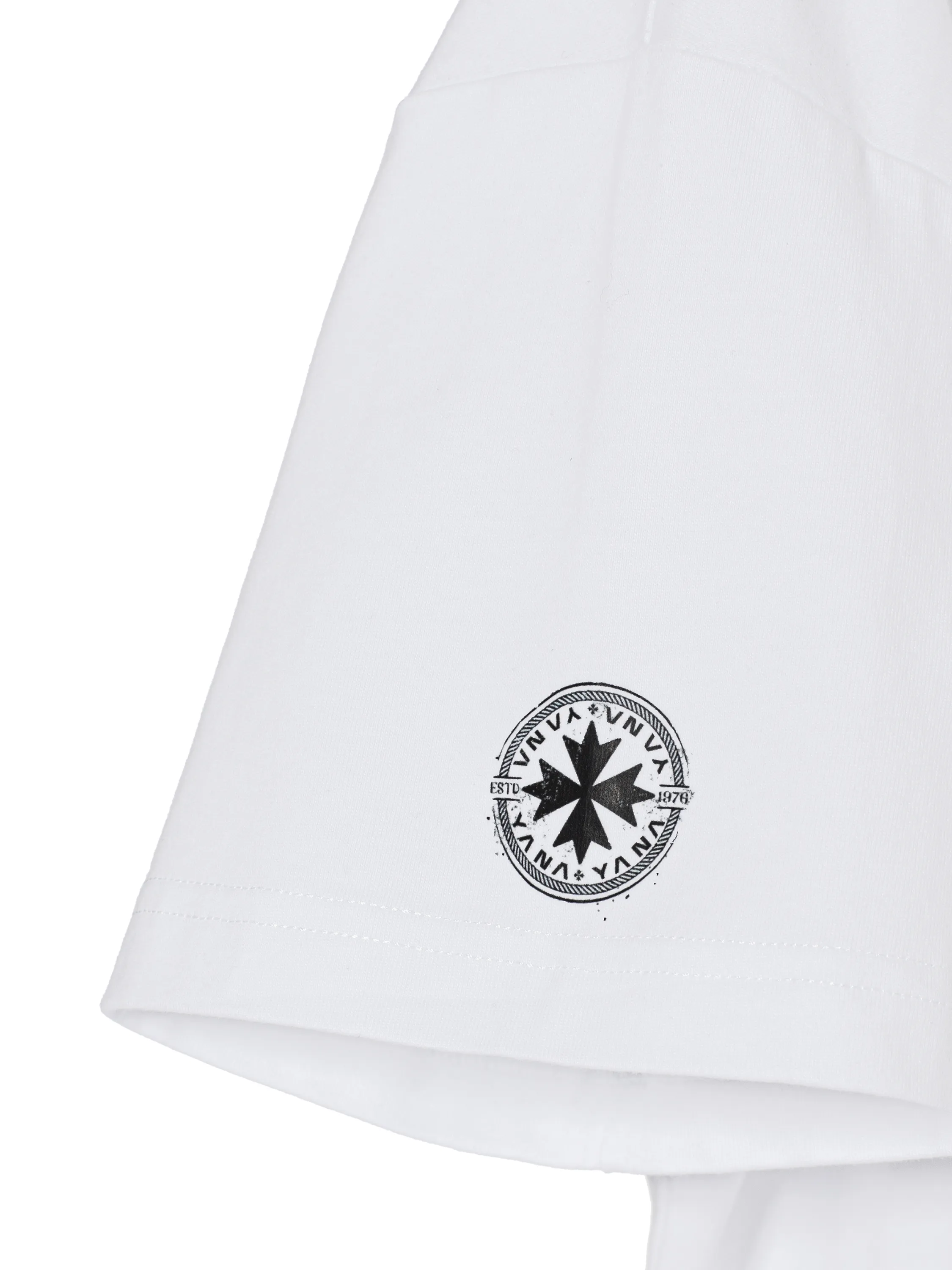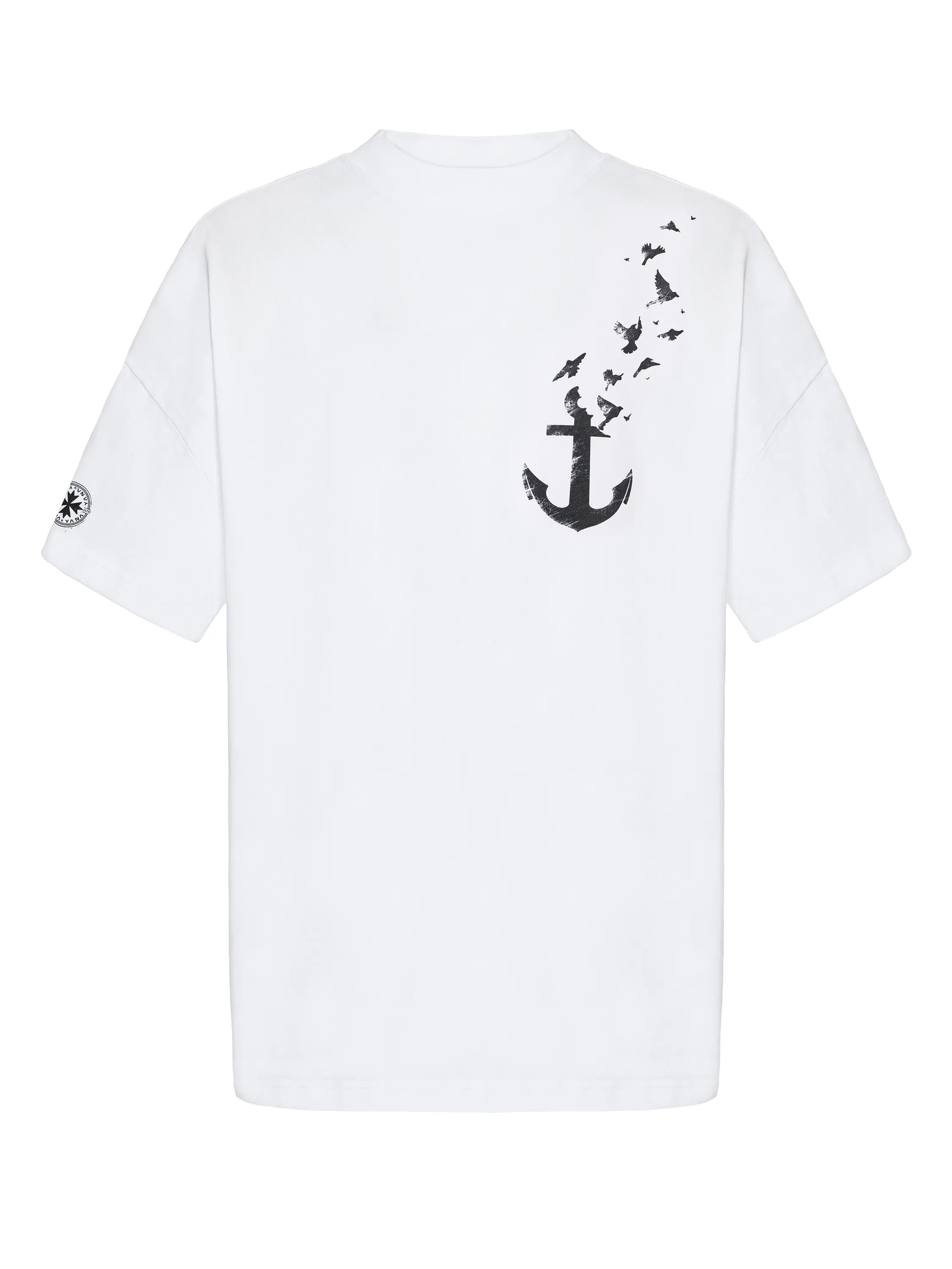 A basic white T-shirt is complemented by a minimalist print in the form of an anchor and black birds on the chest. The item is made of soft natural cotton. The material allows air to pass through well, so the T-shirt will be comfortable even in the hottest weather.