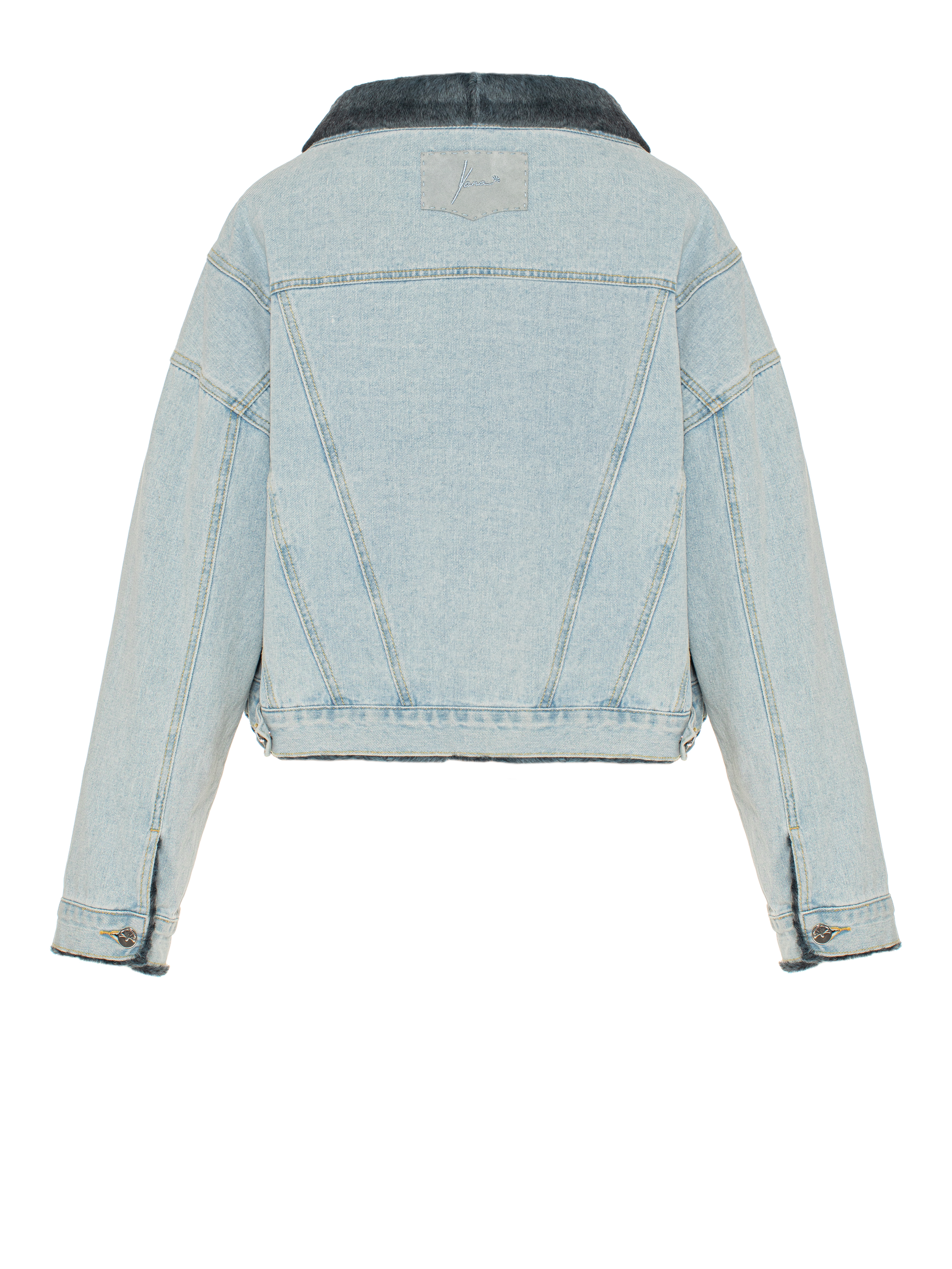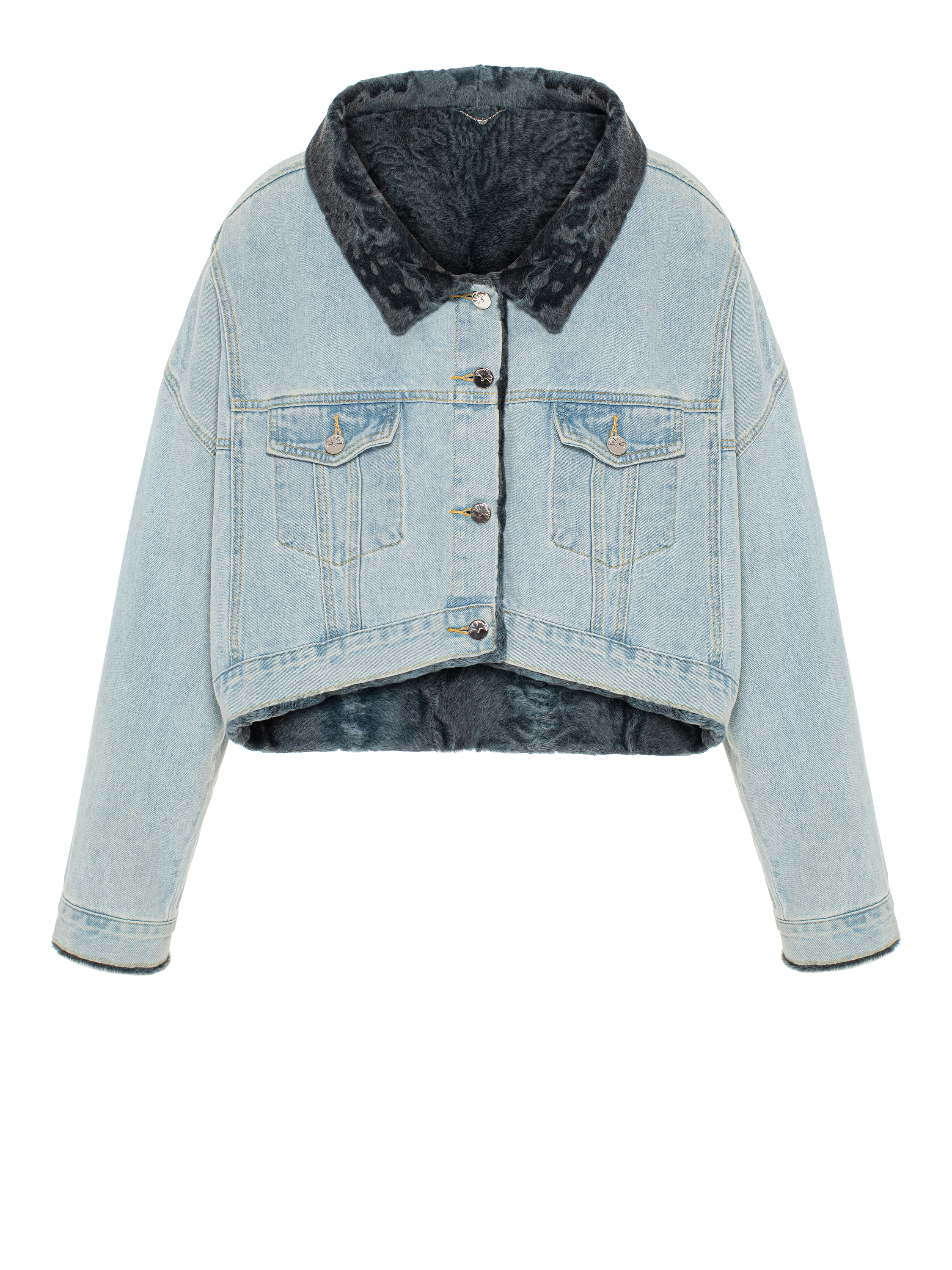 A cropped jacket made of light blue denim with a grey astrakhan lining. The jacket fastens with 925 sterling silver buttons featuring a cornflower motif and is complemented by two patch flap pockets on the chest. Light grey suede patch with brand logo on the back.