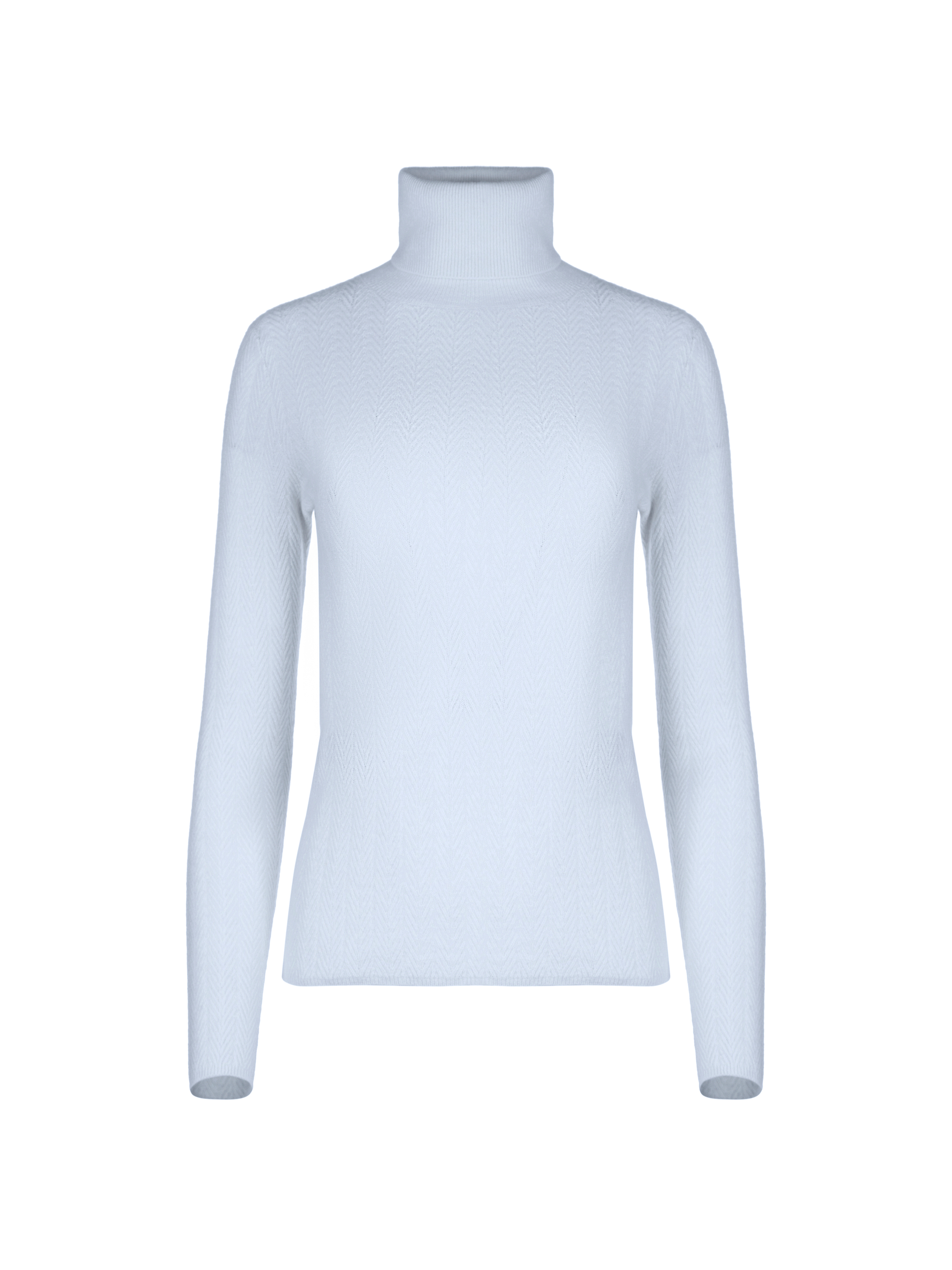 Thanks to the natural herringbone cashmere and the laconic silhouette, the light blue turtleneck will be a successful investment in a basic wardrobe and will give warmth on cold days.