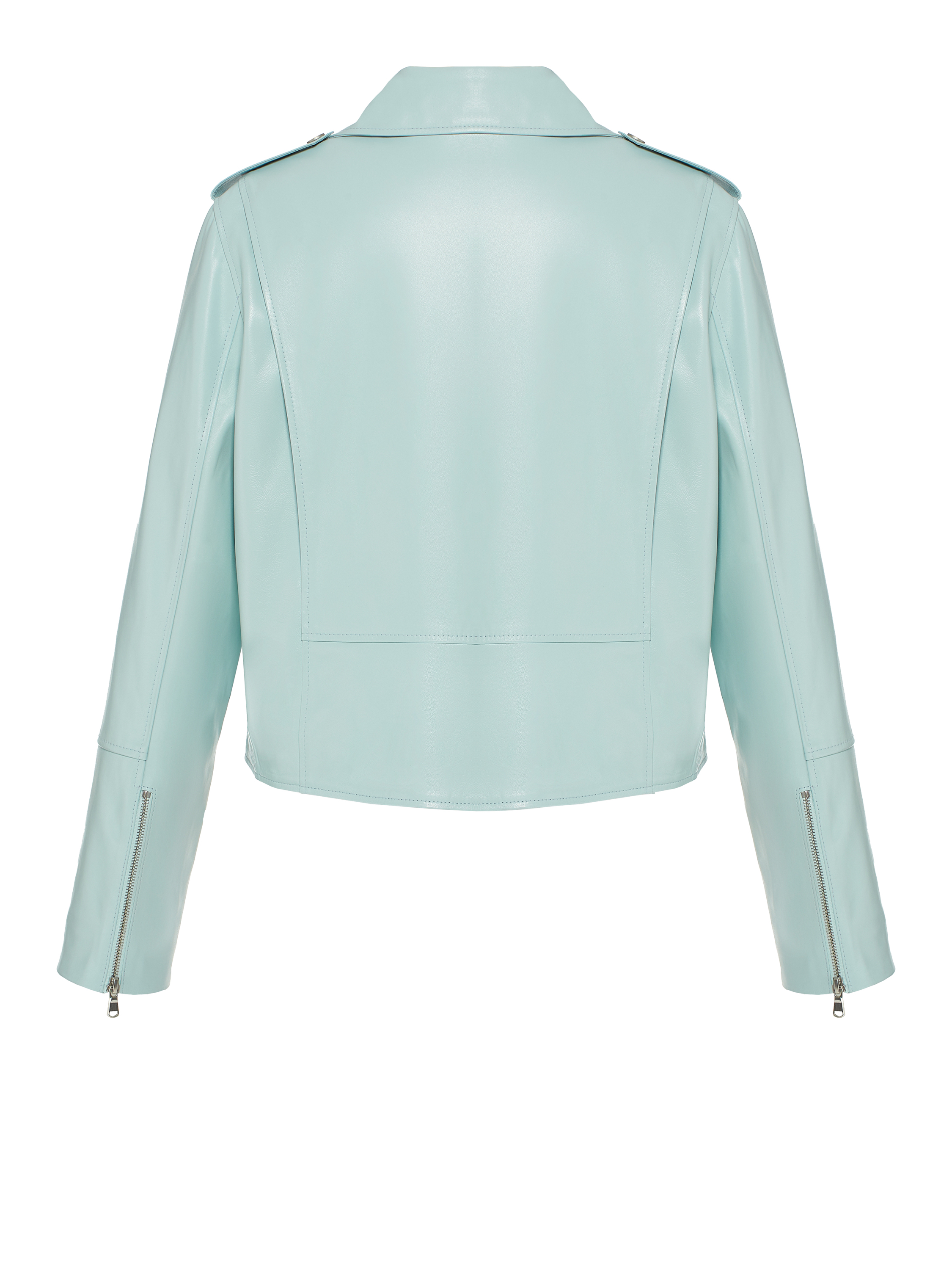 The biker jacket will be the perfect finishing touch for both an evening and an everyday look. The model is made of genuine smooth light blue leather. Three welt zip pockets, one small flap pocket and a belt at the waist. Fastens with a front zipper.