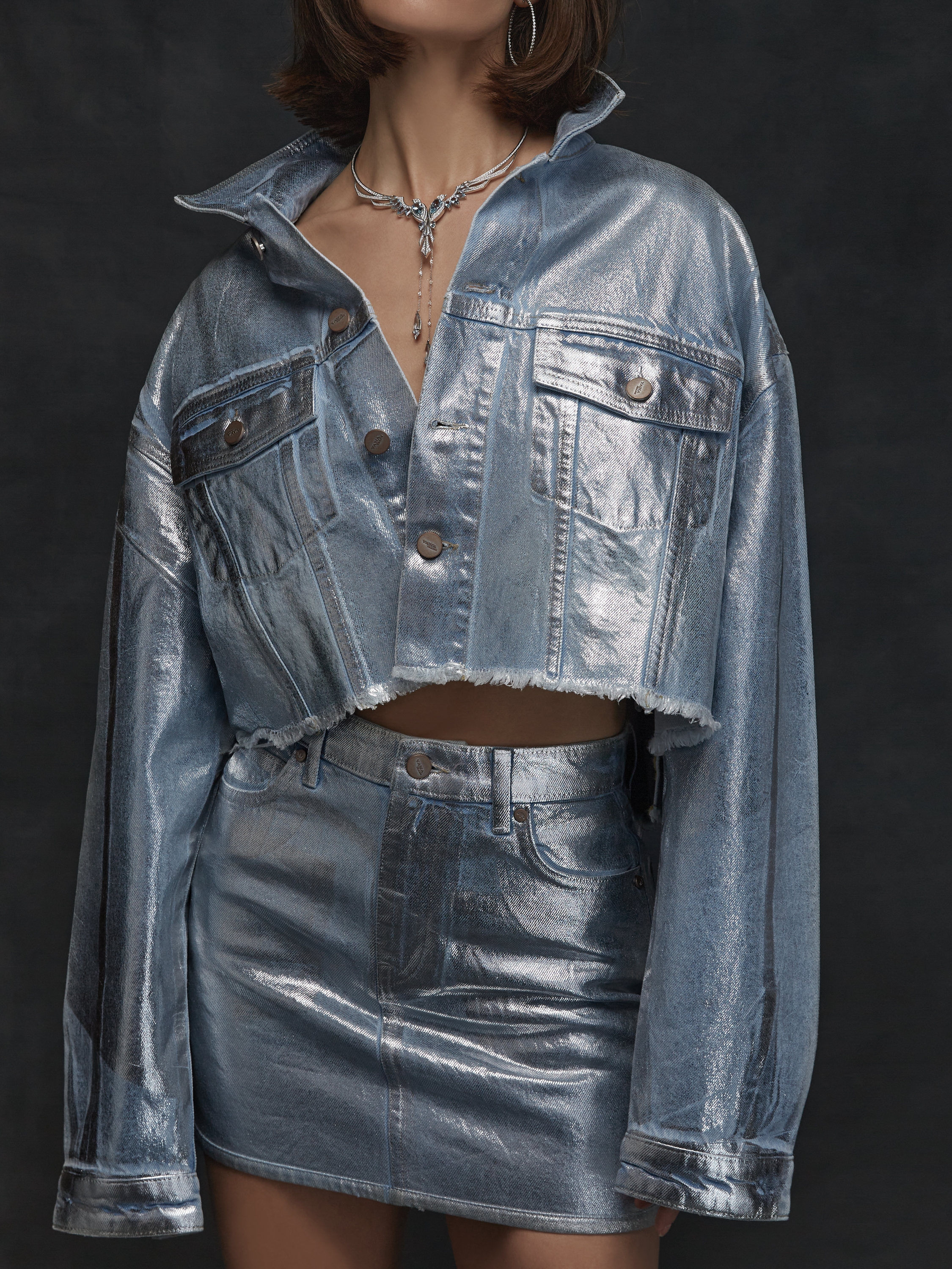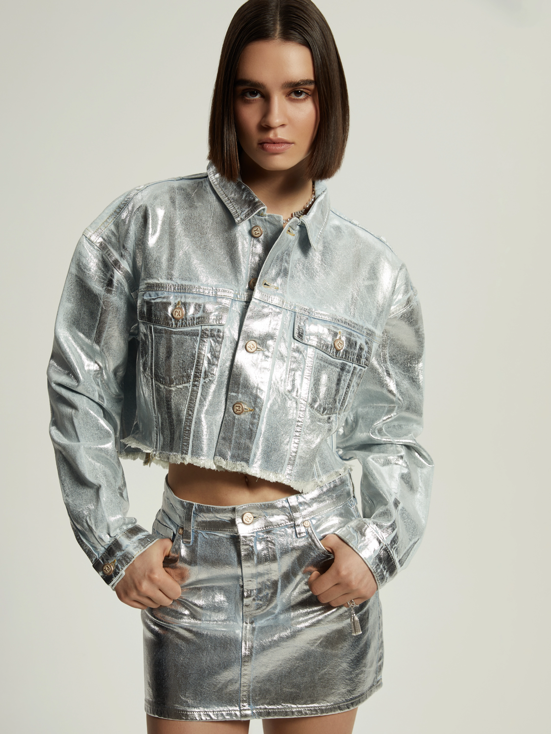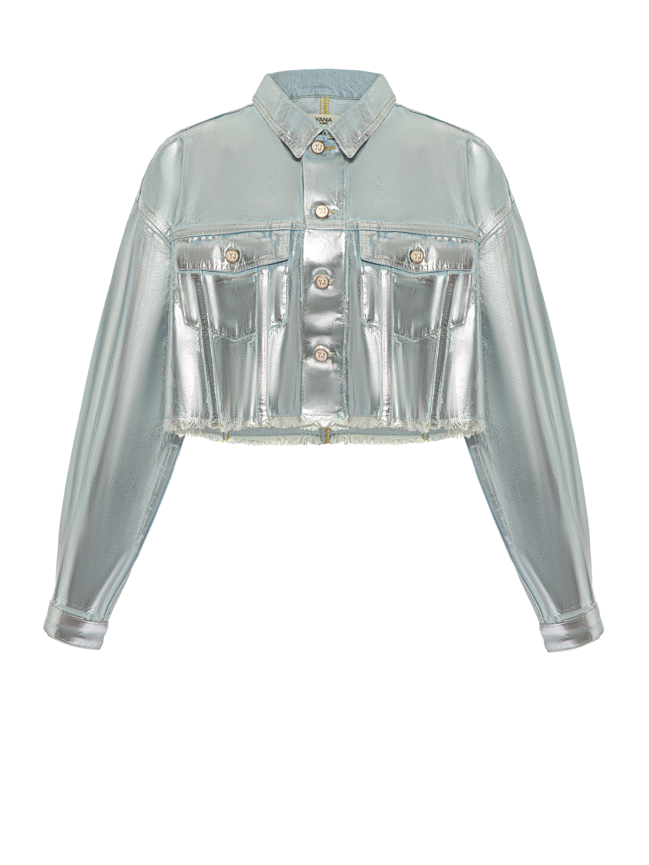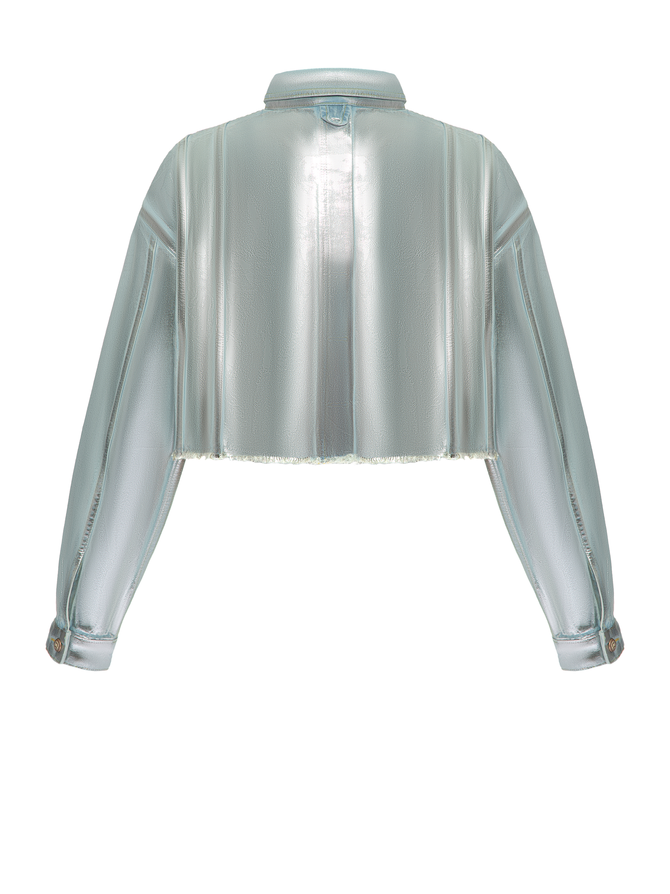 Cropped jacket made of light blue denim with a silver coating, finished with a raw hem. Two patch flap pockets on the chest. Fastens with branded logo buttons. Model measurements: height – 179 cm, 85/59/92.