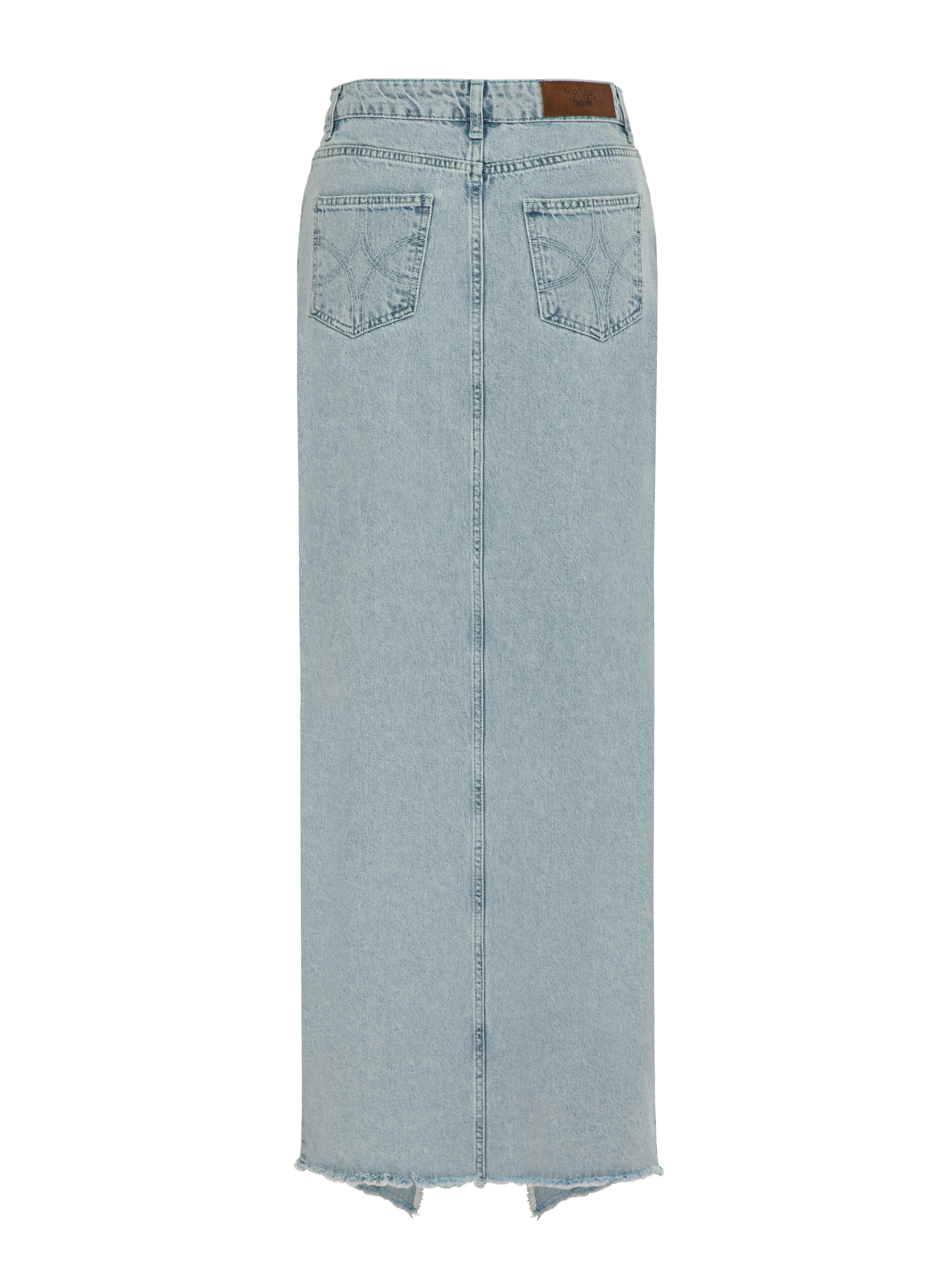 Maxi denim skirt from the Yana Jeans line is made of light blue pure cotton and complemented by an asymmetric closure, raw edges and a high slit at the front. Length of the item: 109.5 cm. Waist circumference: XS — 67 cm, S — 71 cm, M — 75 cm, L — 79 cm, XL — 83 cm.