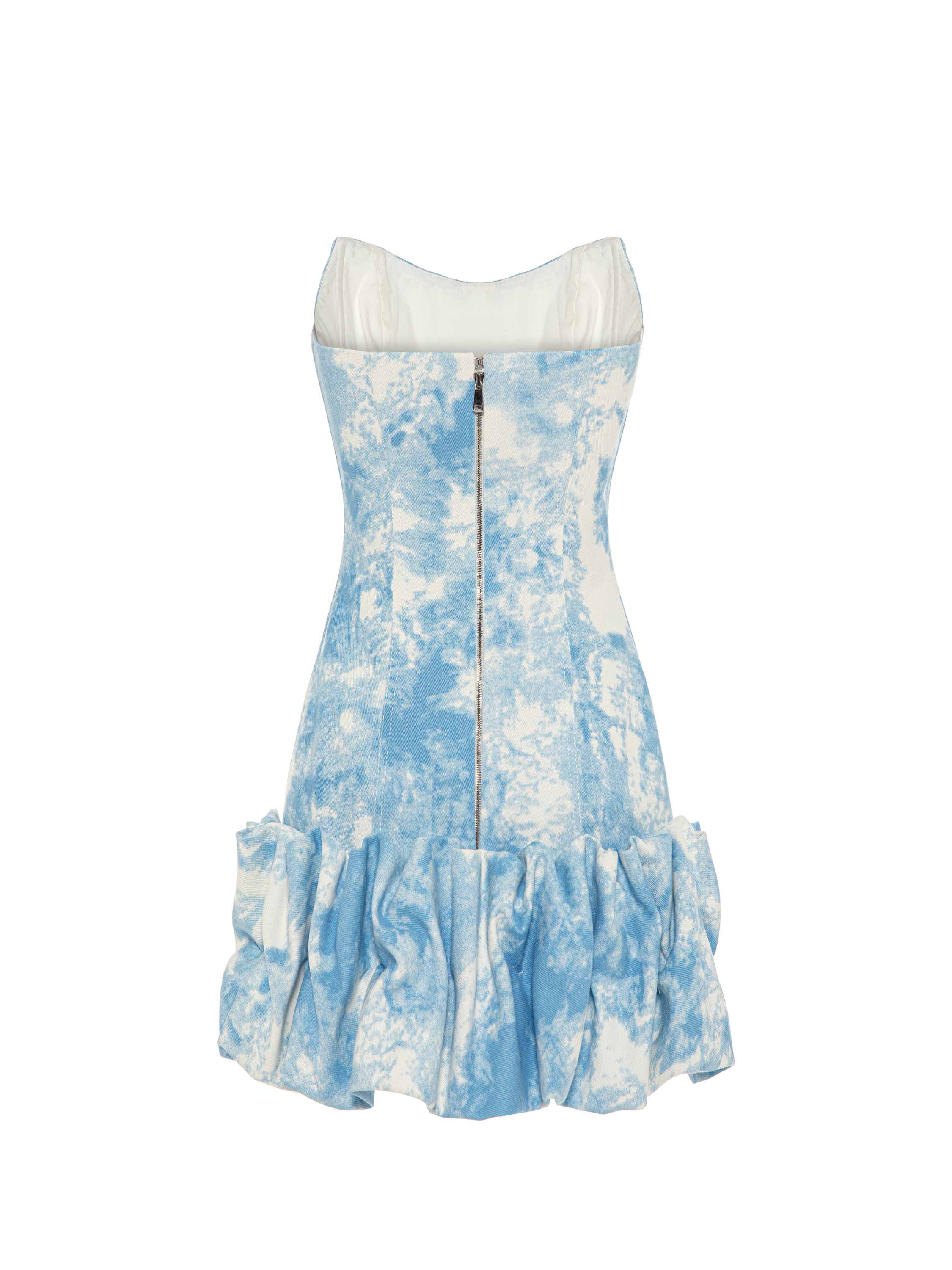 A light blue off-the-shoulder mini dress is made of denim dyed in a tie-dye technique. The model is complemented by a shaped neckline and puffed hem. Fastens with a zipper at the back.