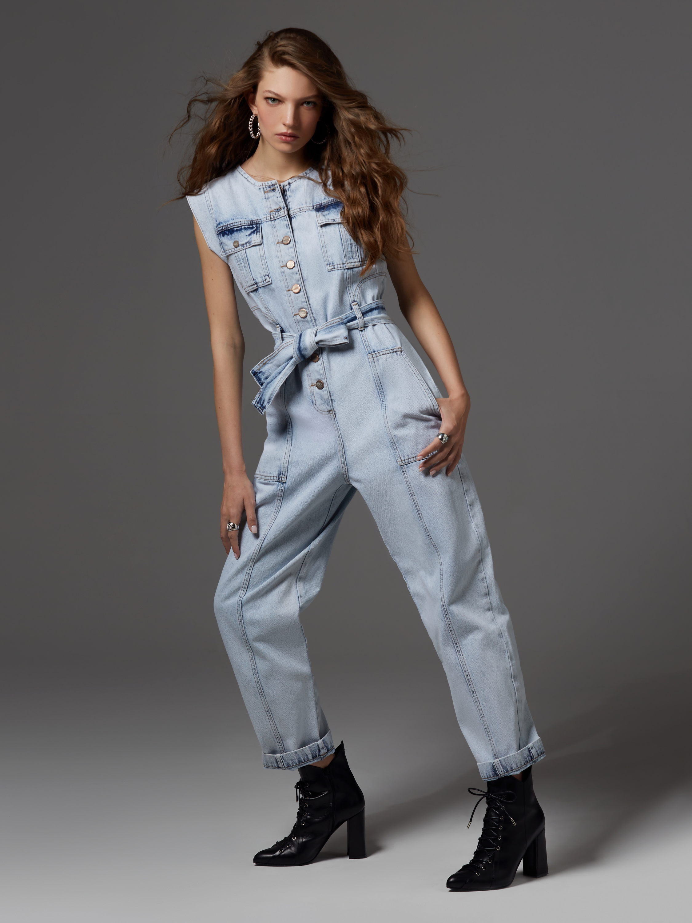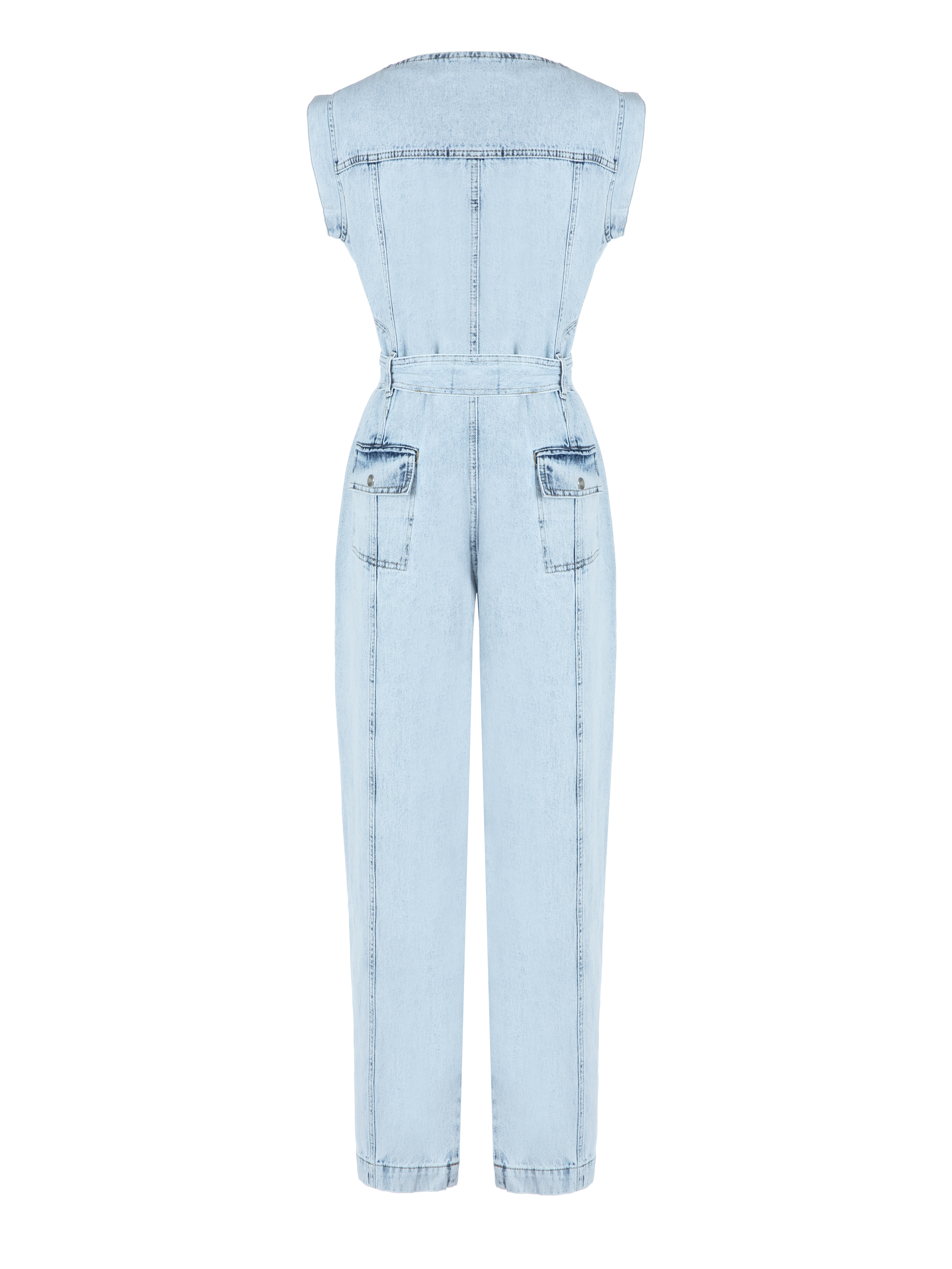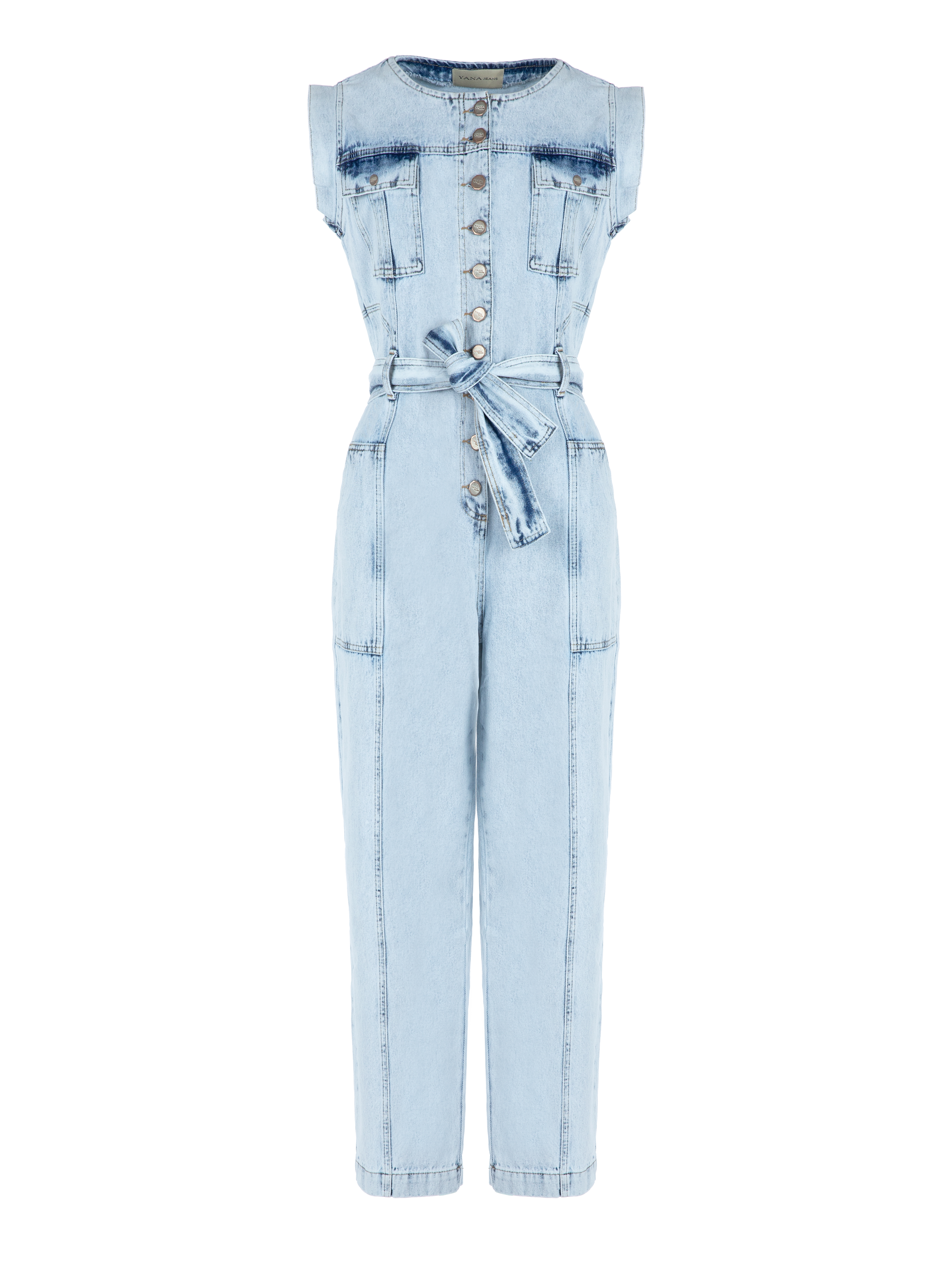 The light blue sleeveless jumpsuit is made of denim. The model fastens with buttons at the front and is complemented by a belt and patch pockets at the front and back. Pair it with Yana Shoes footwear and Yana Jewellery accessories.