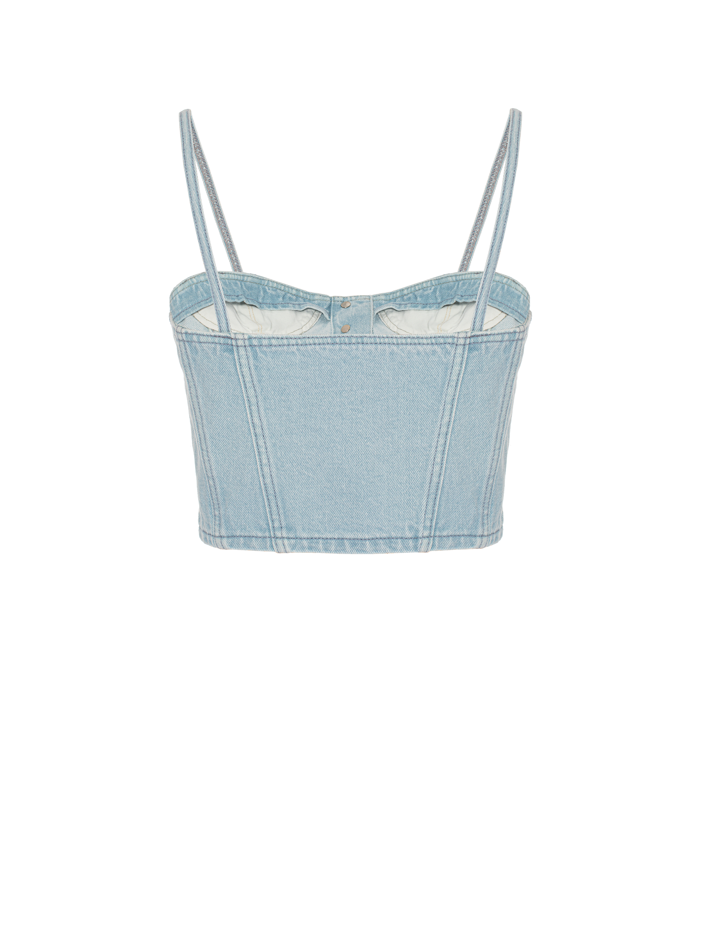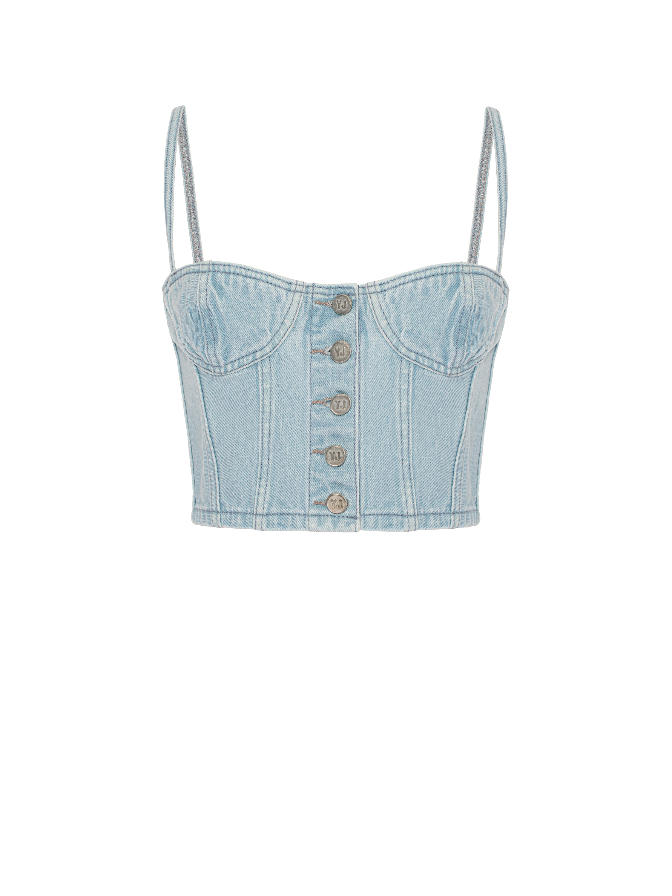 The corset top with thin straps is made of light blue denim. It fastens with branded logo buttons at the front.