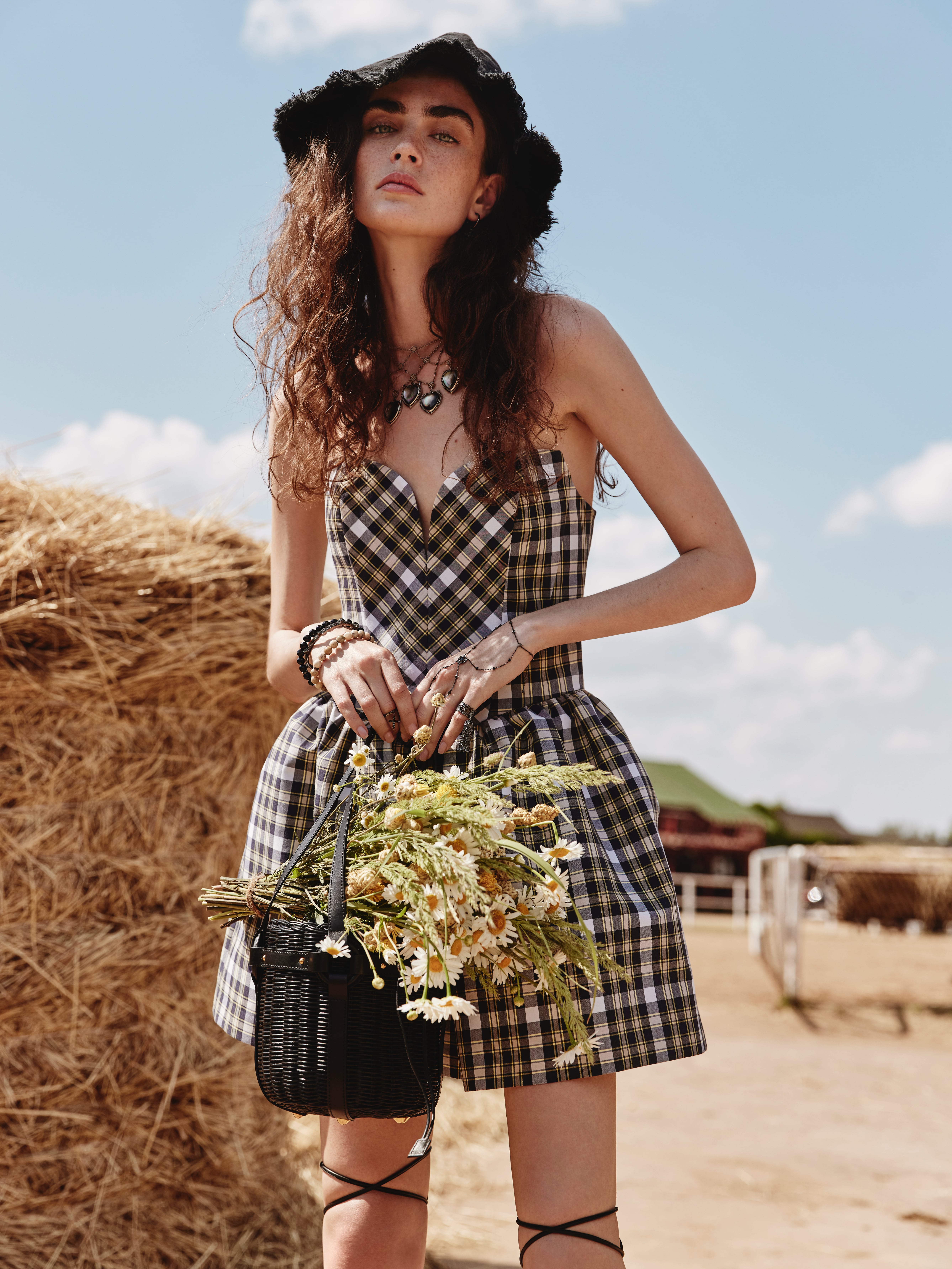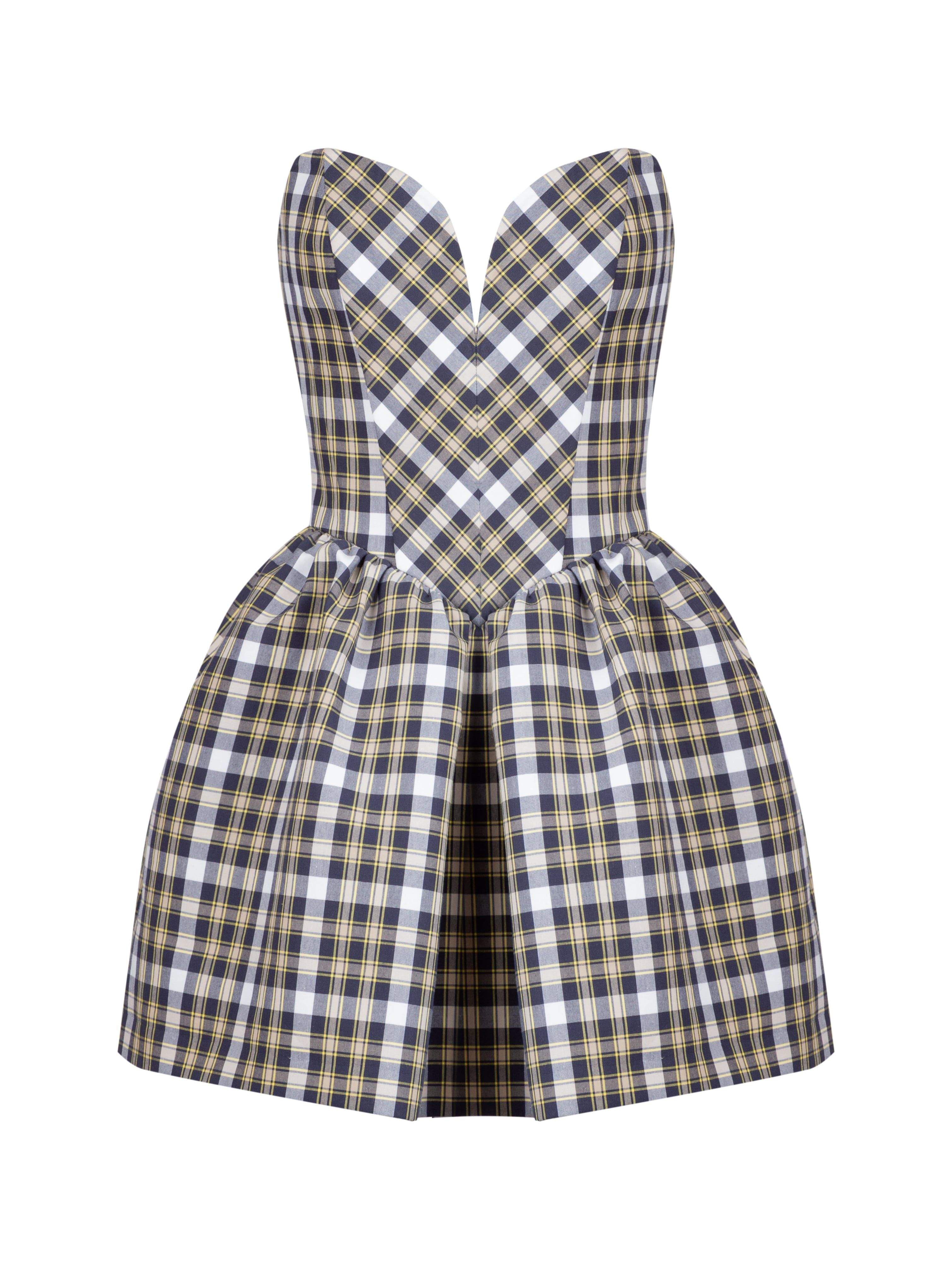 A blue-and-yellow checked mini dress with an open shoulder line, a full skirt and a heart-shaped neckline is the embodiment of femininity and elegance. The model is made of natural cotton and complemented with a gold zipper at the back.