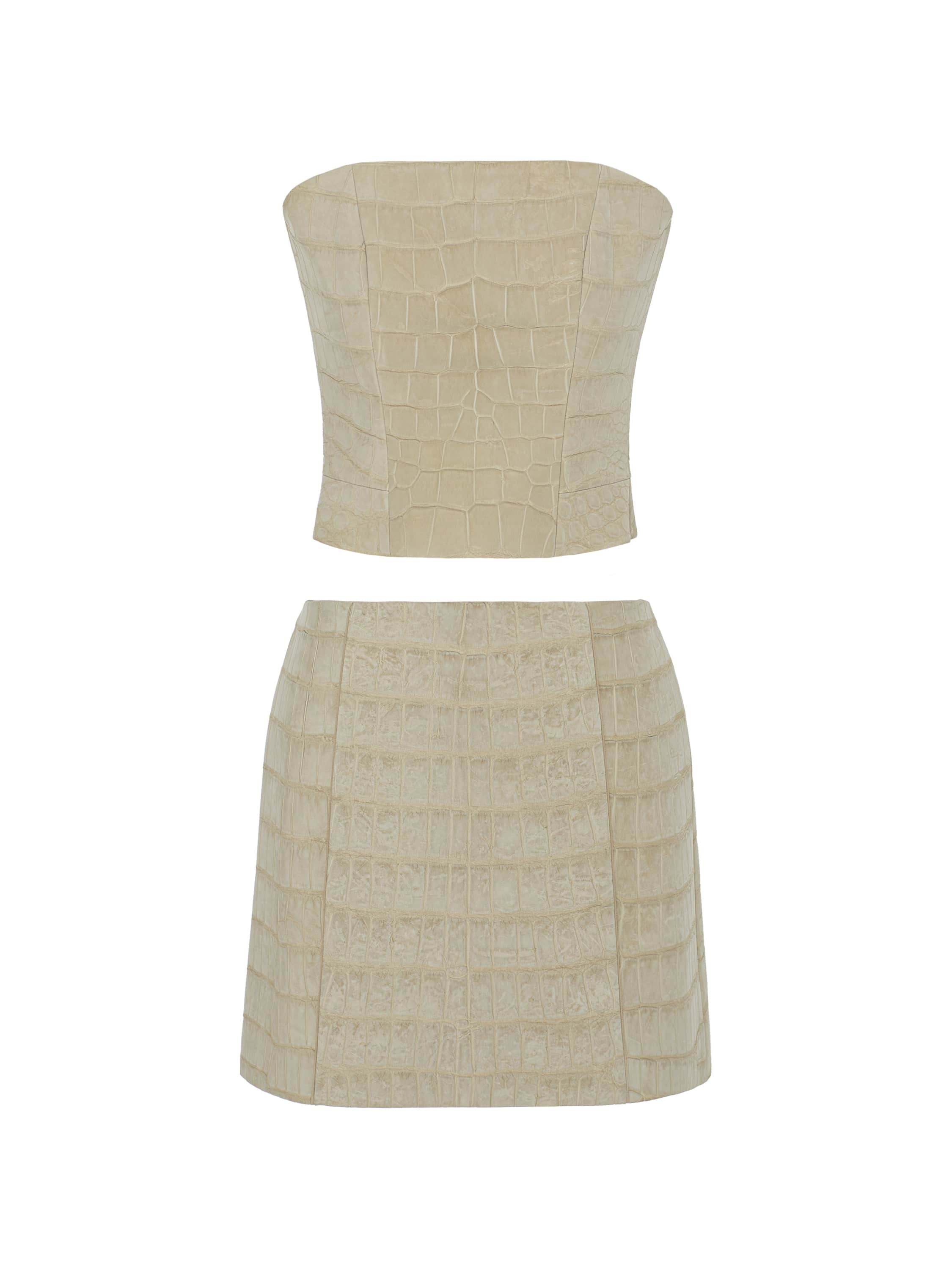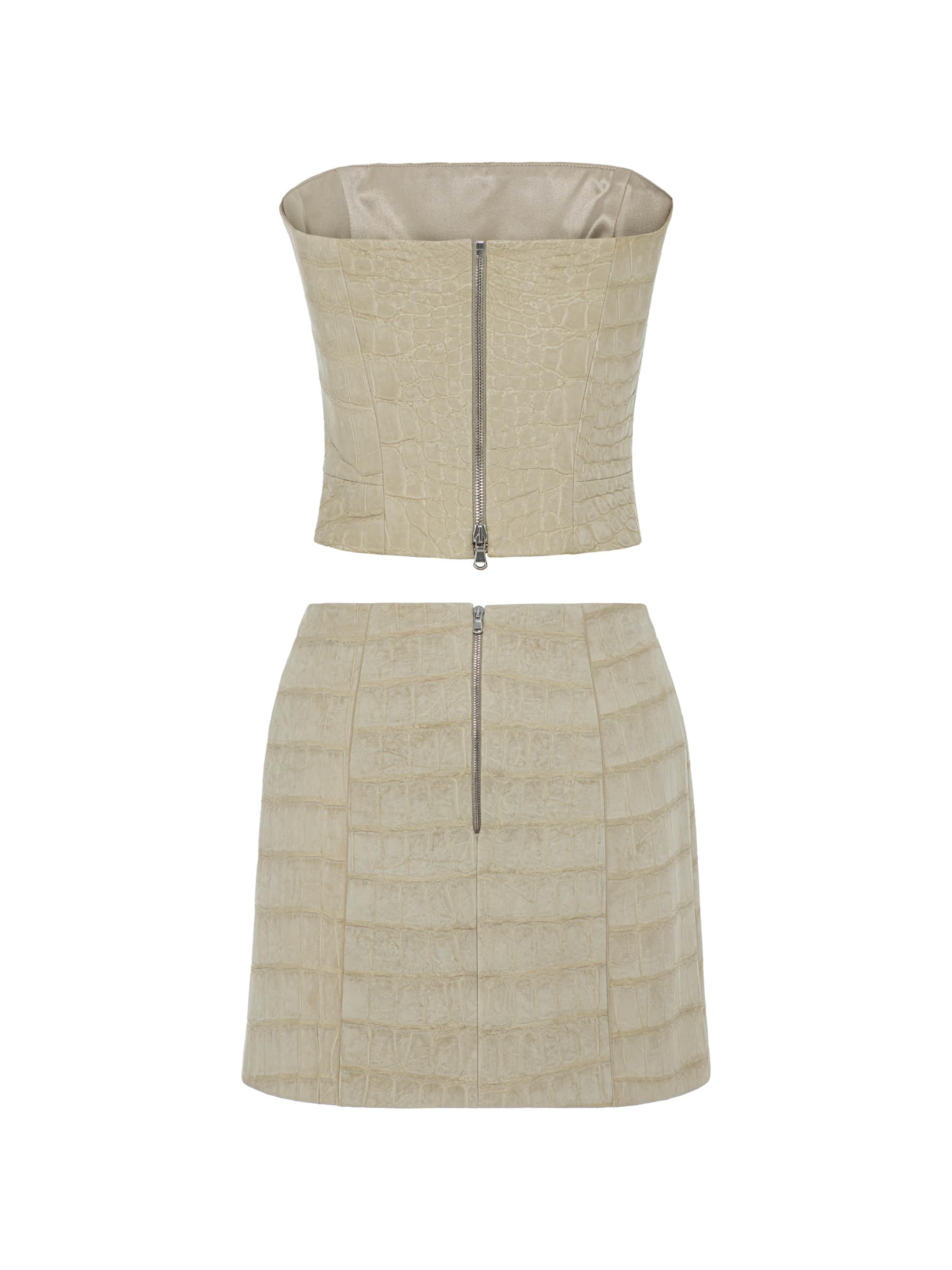 The minimalist set of a corset and a mini skirt is made of beige crocodile leather. The set from the new Yana Dress collection is easy to combine with any jewelry sets. The corset and skirt fasten with zippers at the back.