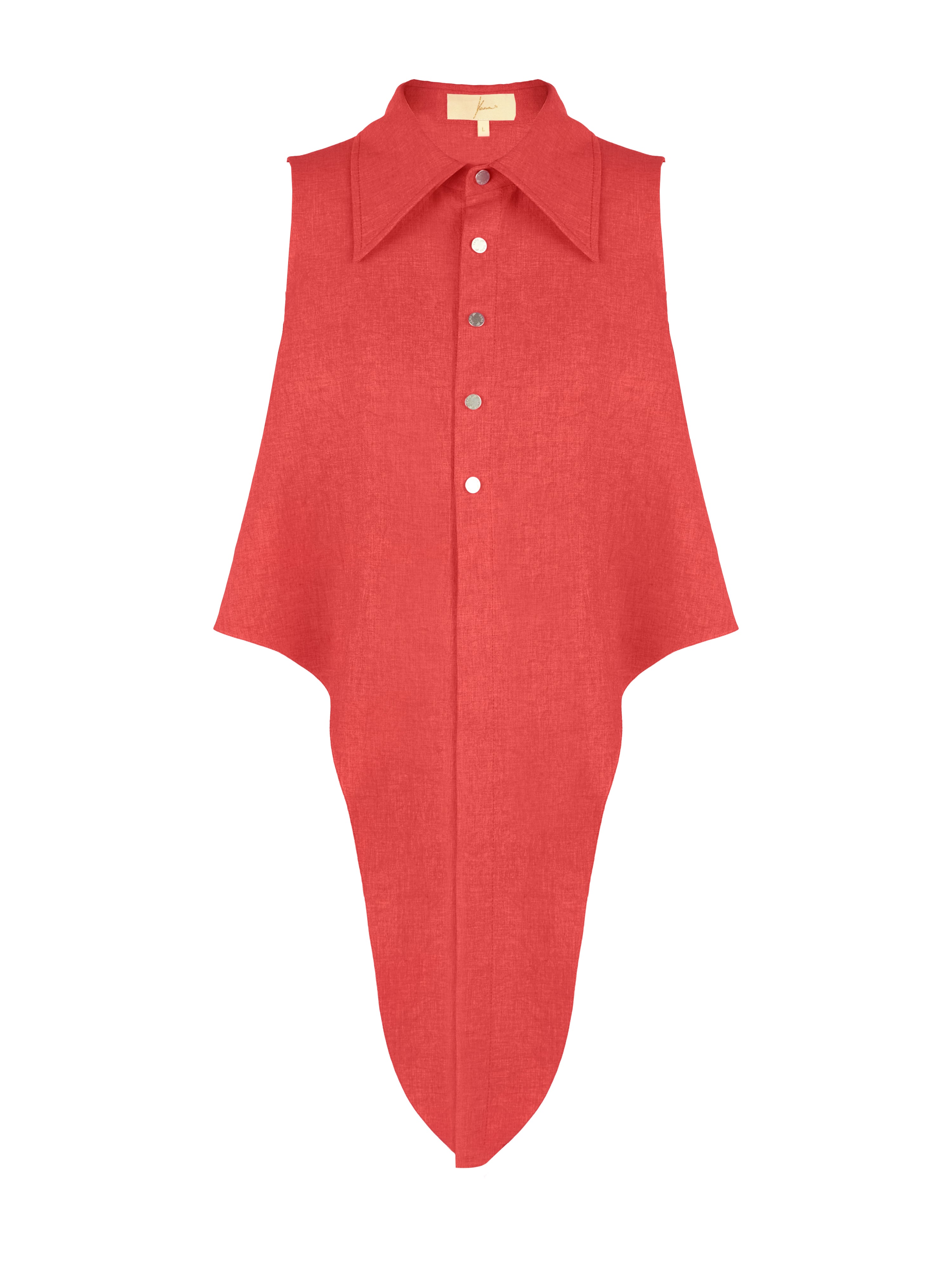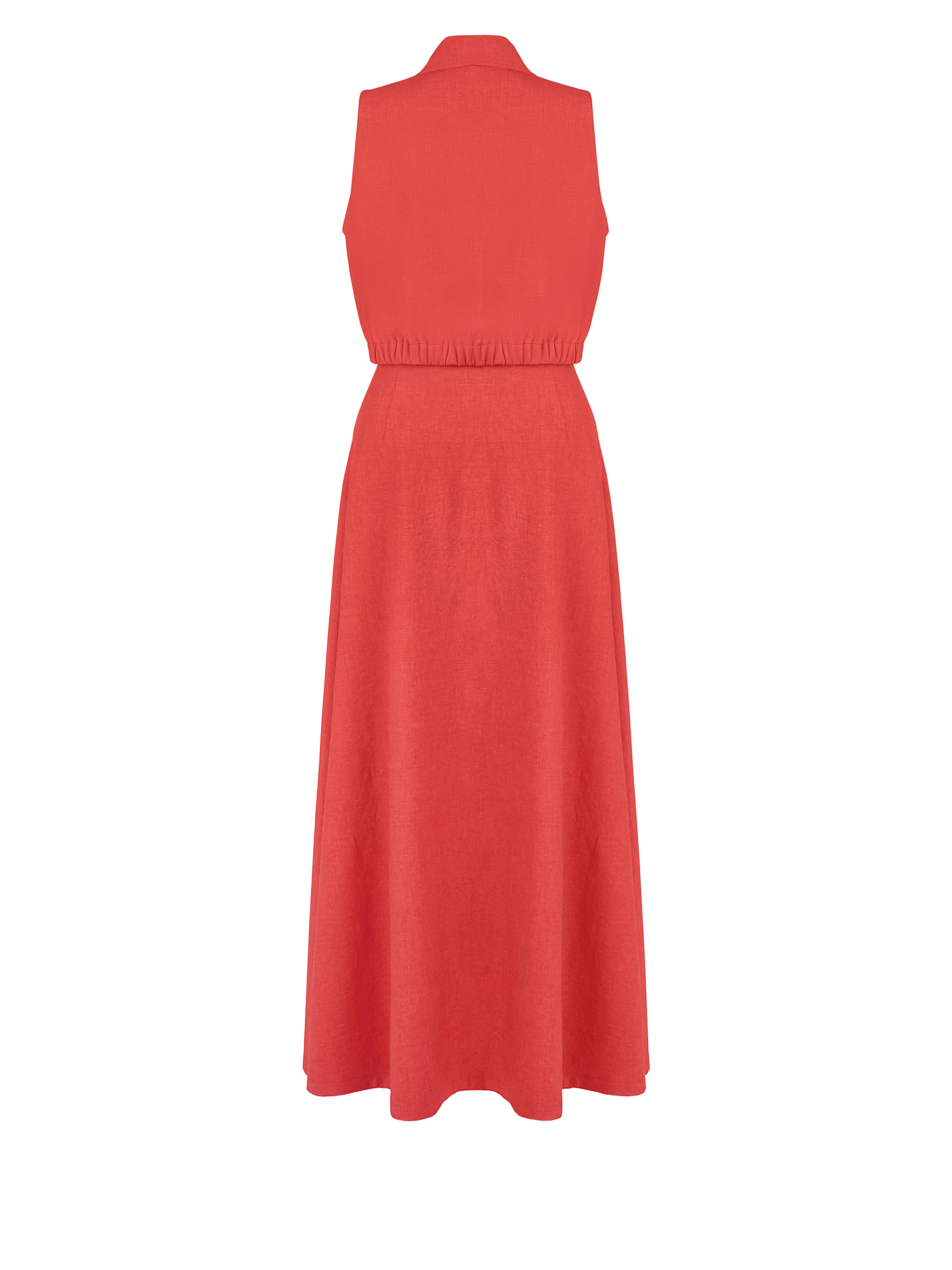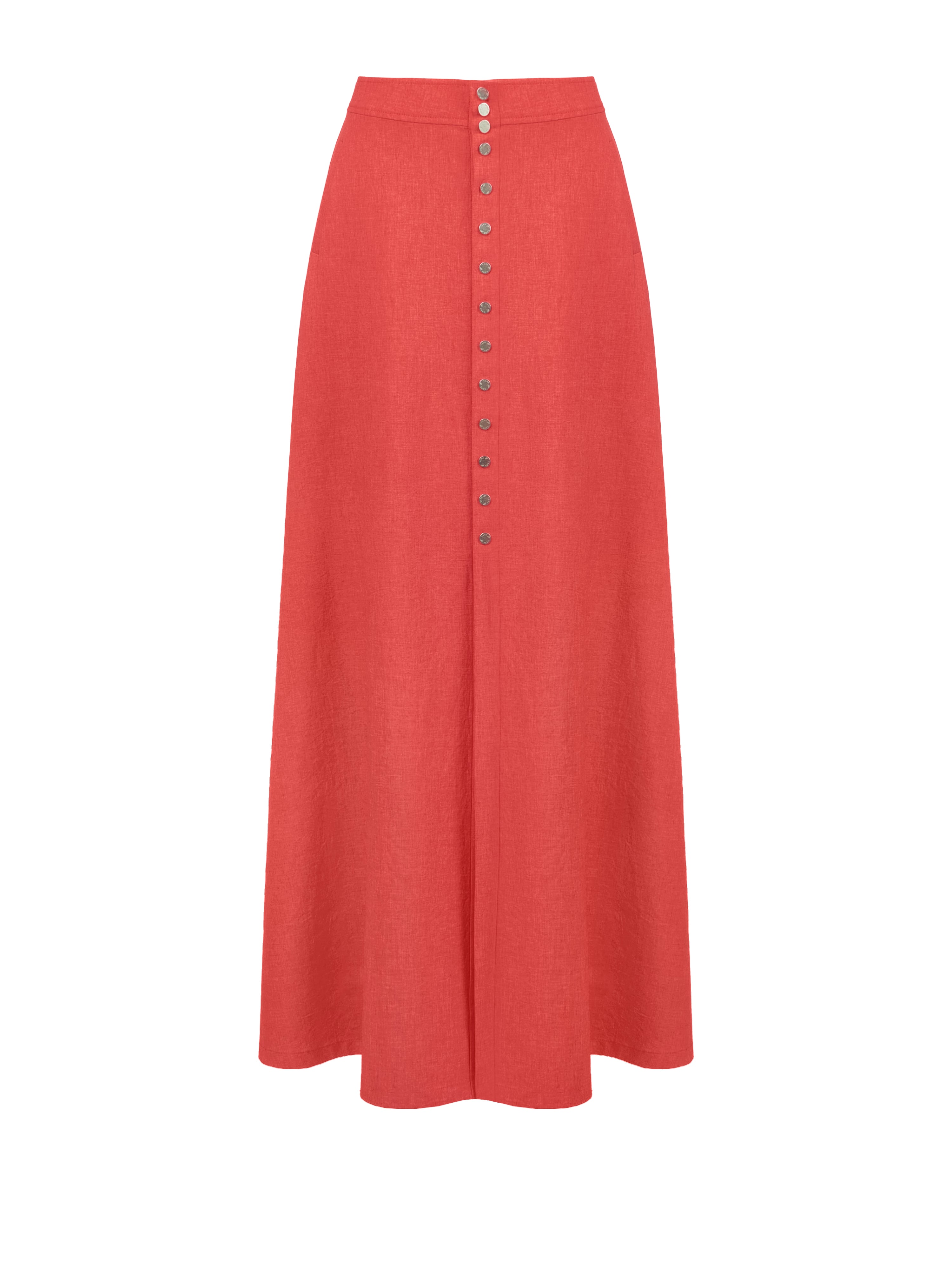 The coral suit is made of linen and consists of a blouse with deep armholes and ties and a flared maxi skirt. The top and skirt fasten with snaps at the front.