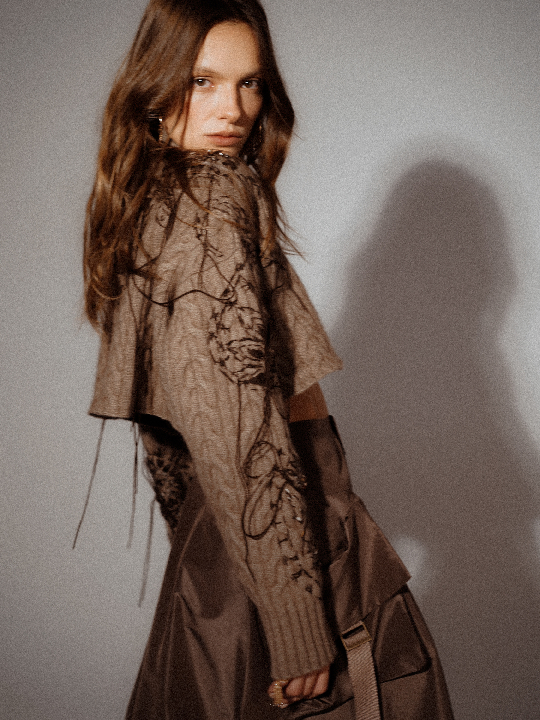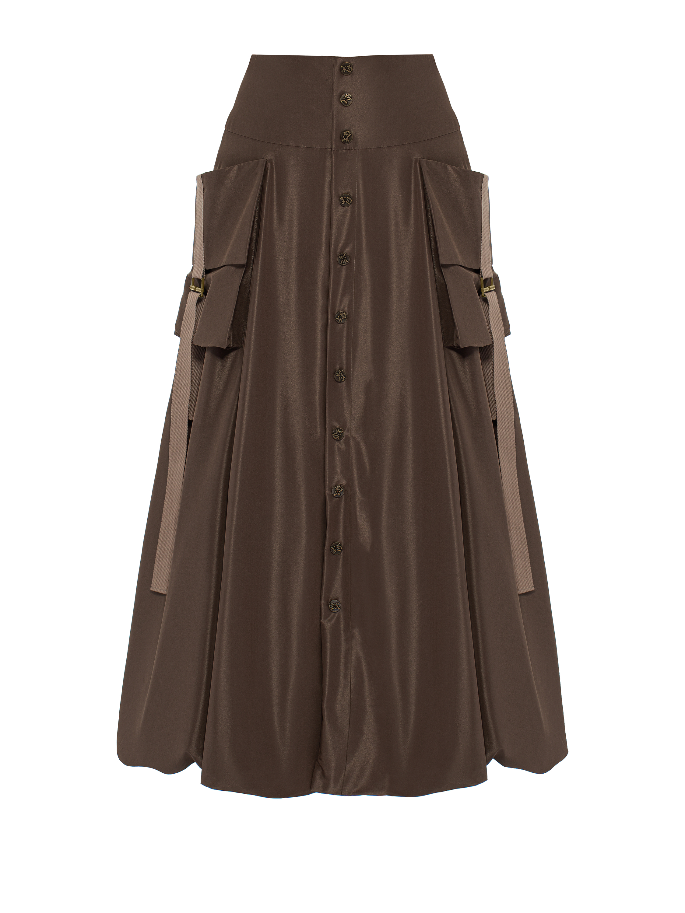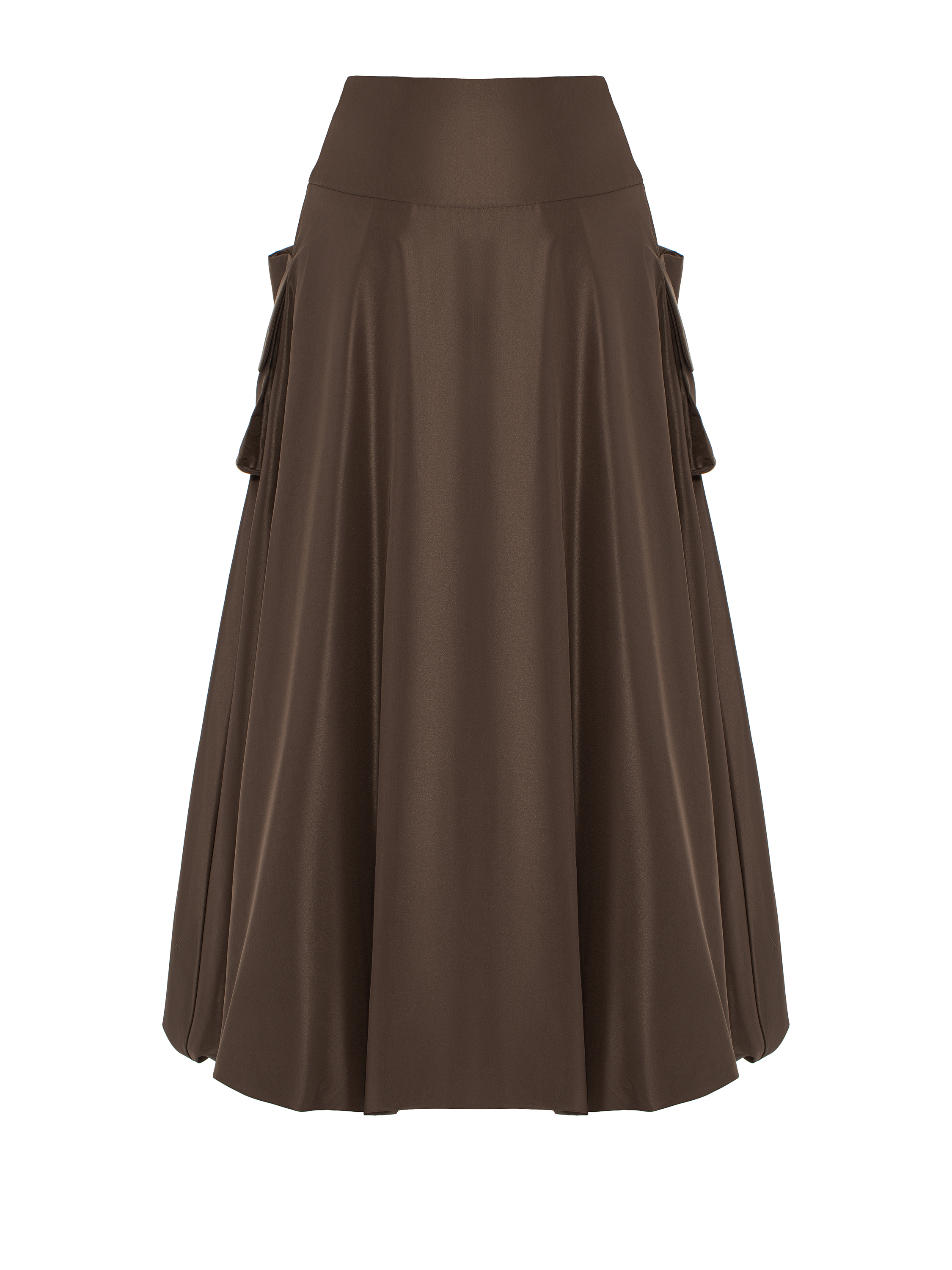 Brown balloon midi skirt made of shimmering taffeta. The model is complemented by two voluminous patch pockets with flaps on the sides. Fastens with branded snap buttons along the entire length.