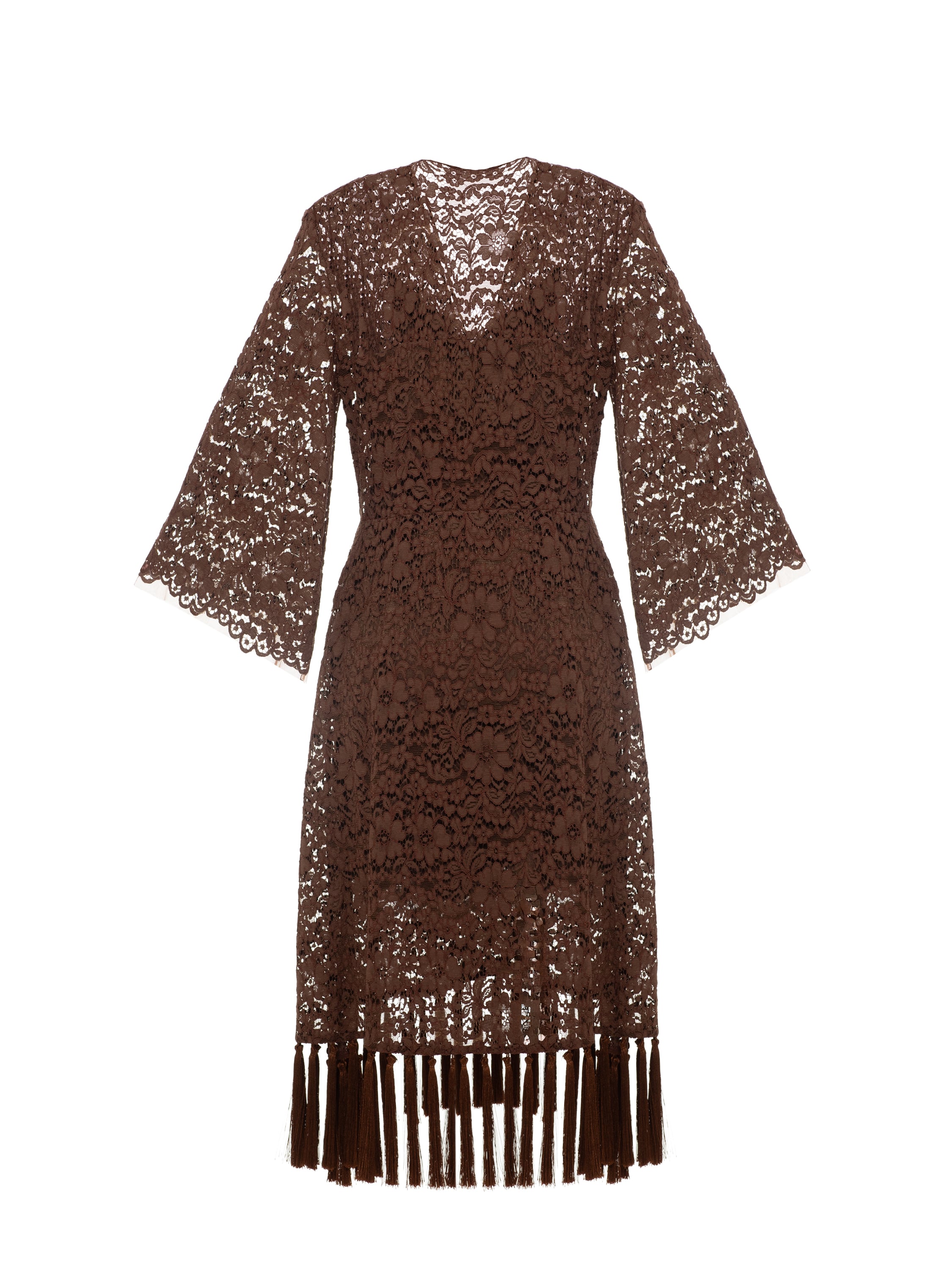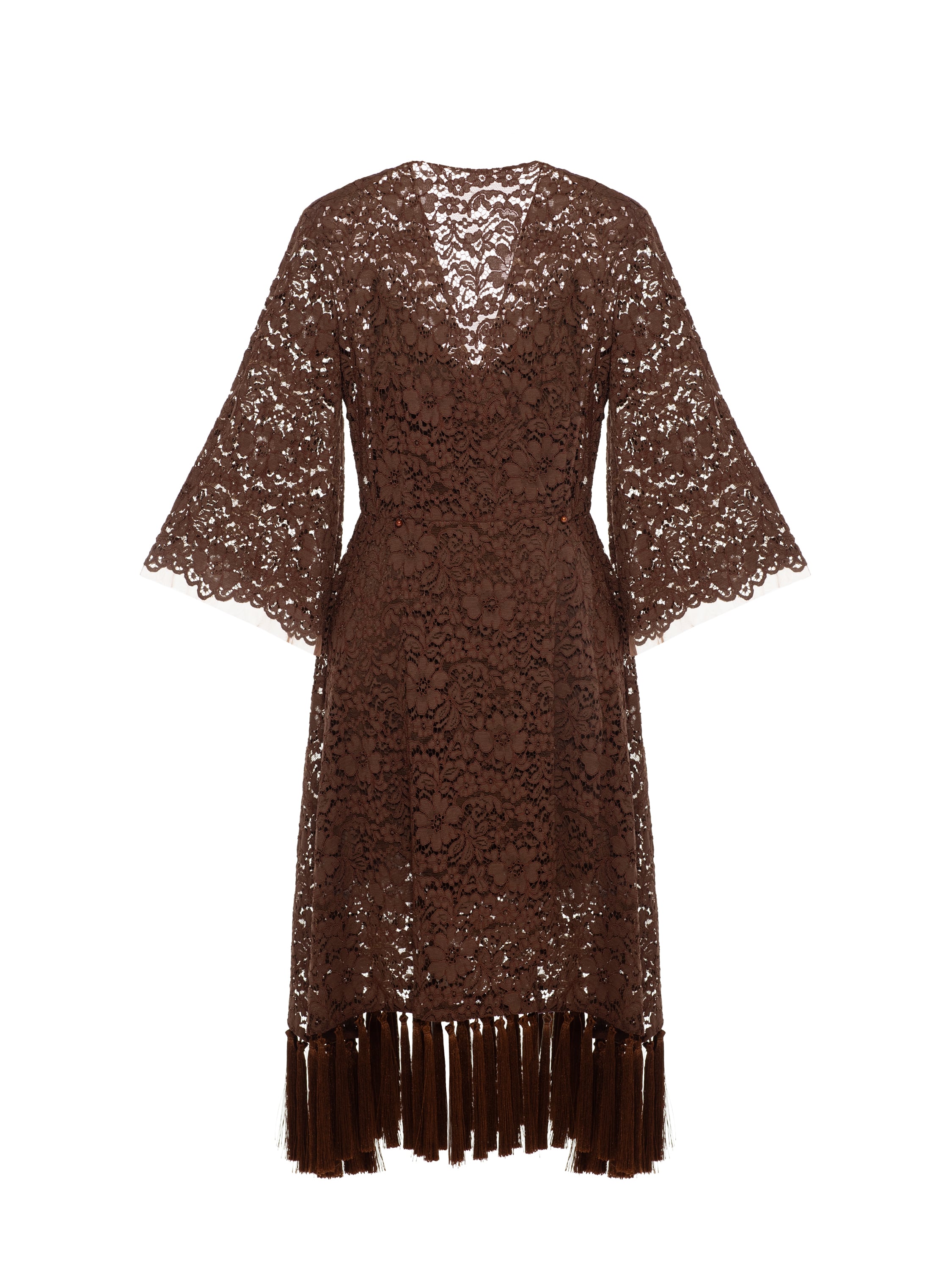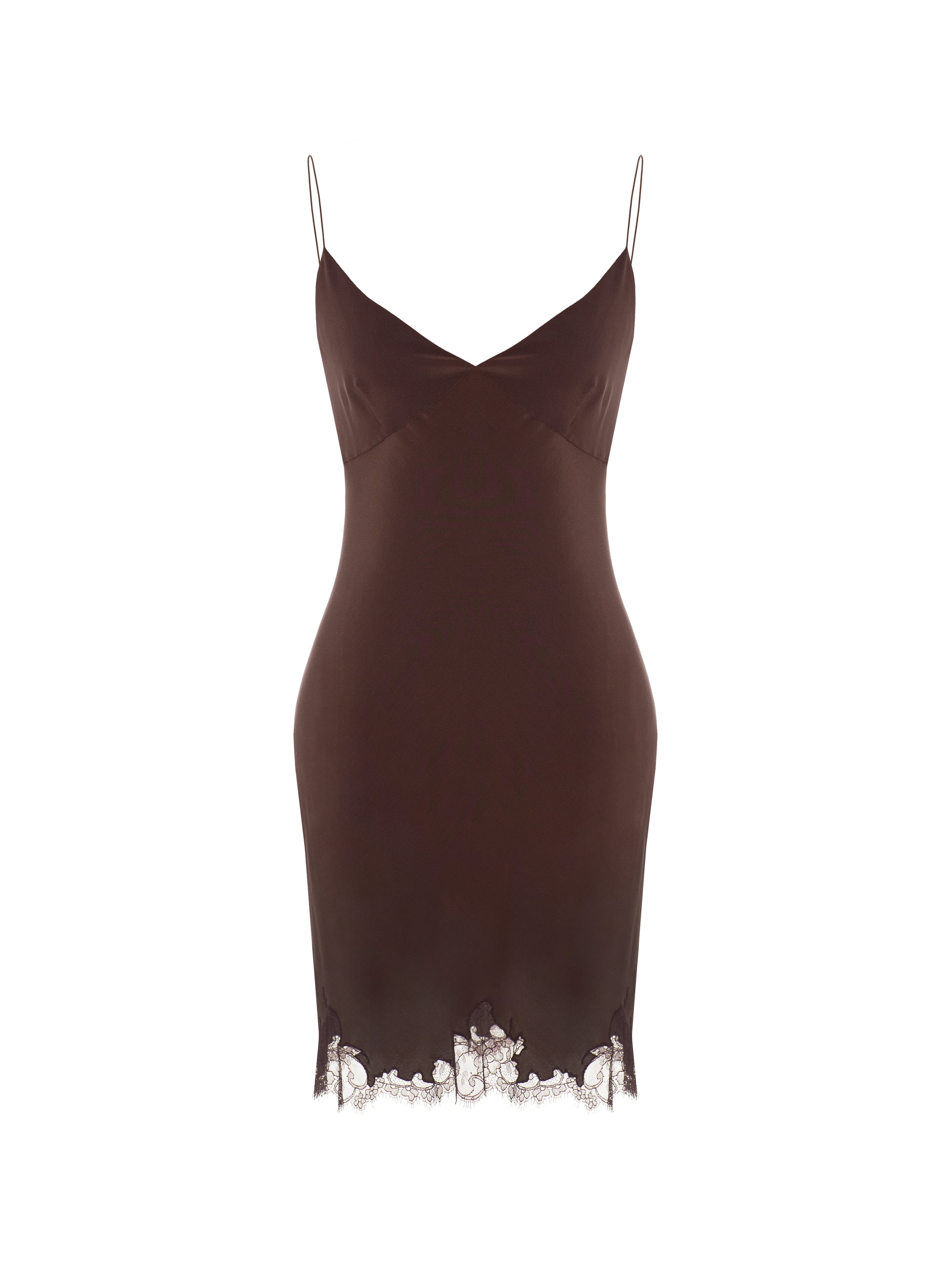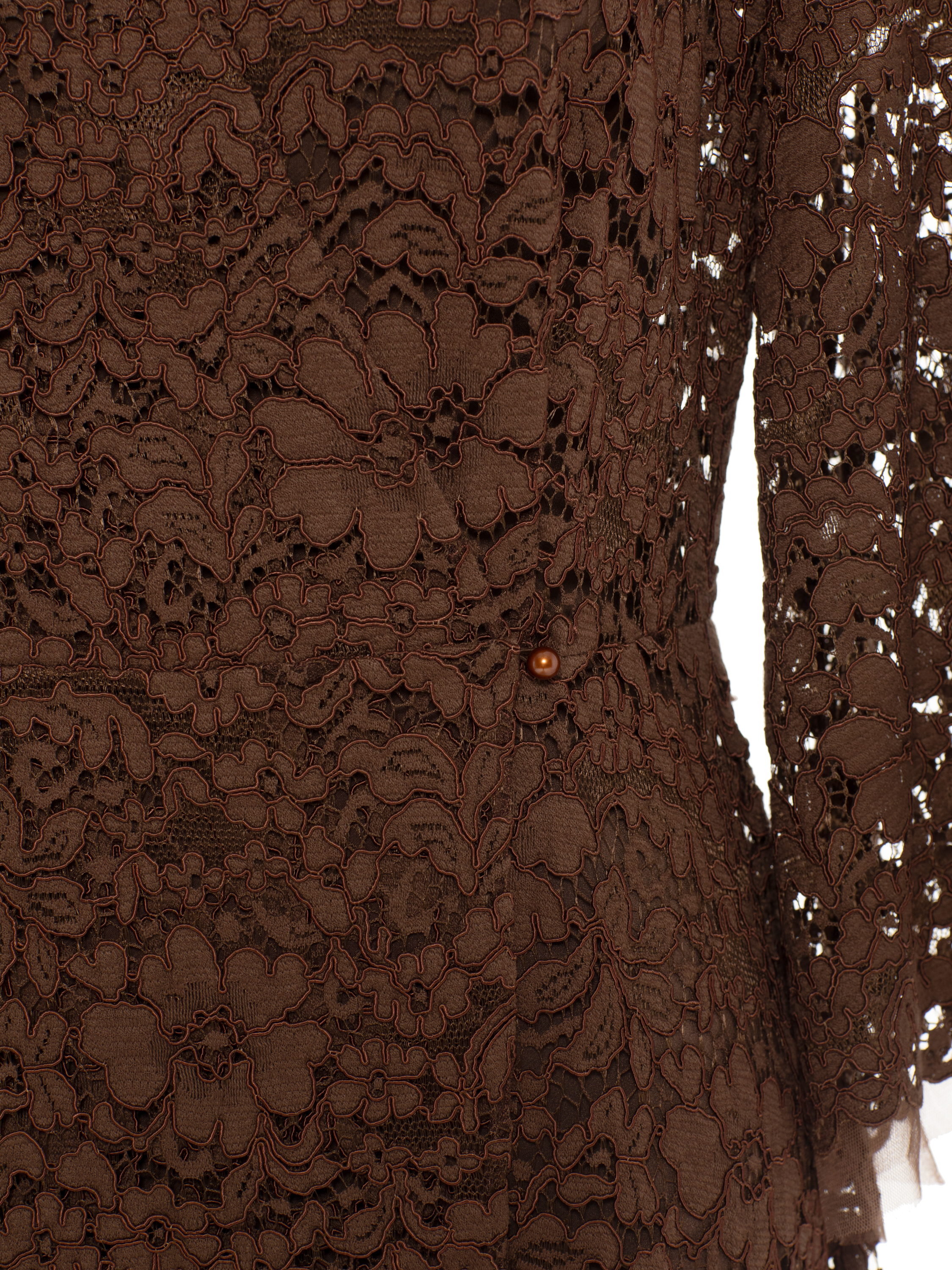 The brown double-layered midi dress consists of a silk slip and a lace mesh with long sleeves. Create a unique look by complementing the dress with shoes and accessories from Yana Dress.