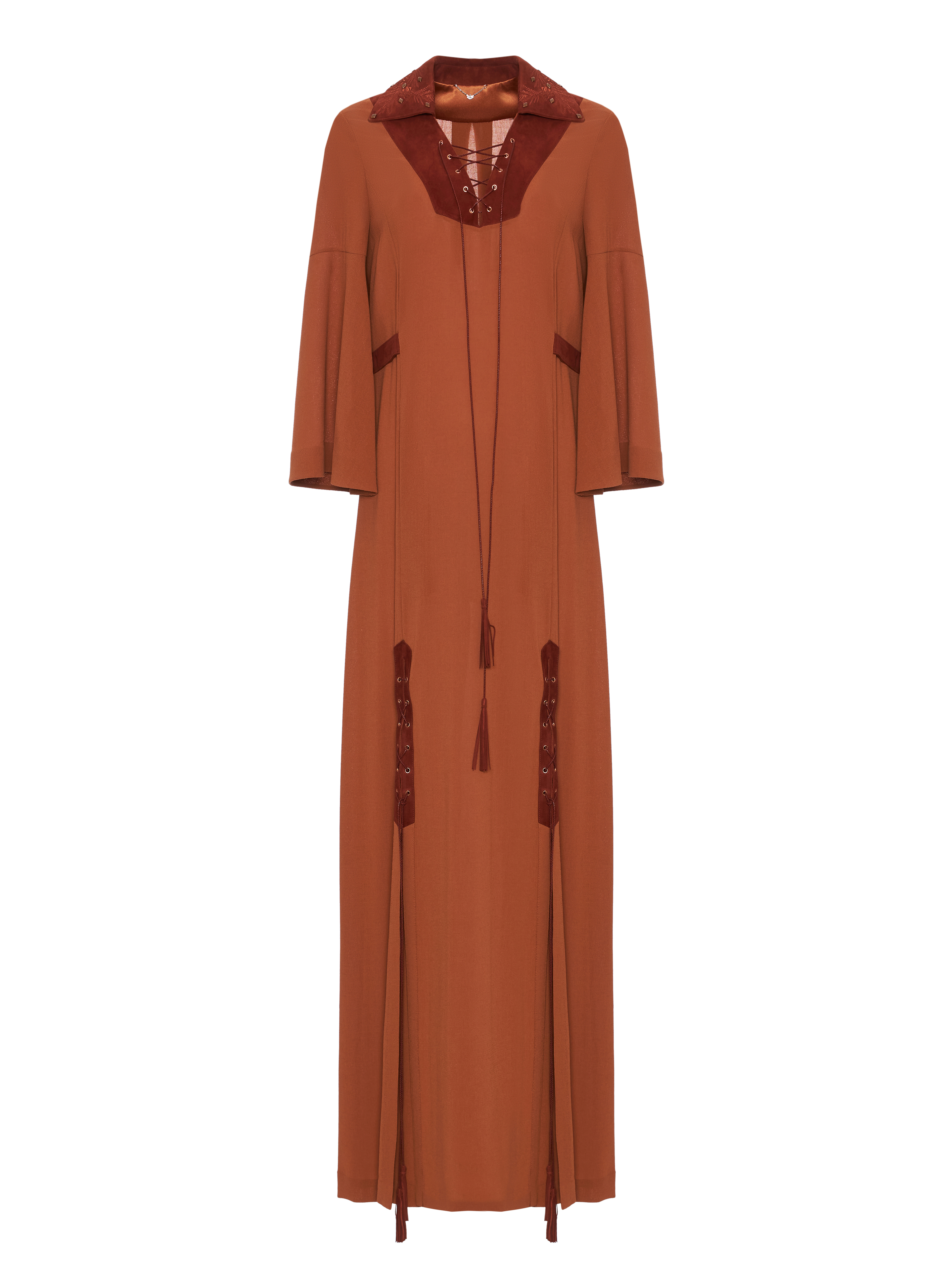 Brown maxi dress with flared 3/4 sleeves and lacing on the chest. The model has a comfortable, loose fit. The collar and trims are made of tone-on-tone genuine suede. Tassel ties at the front.