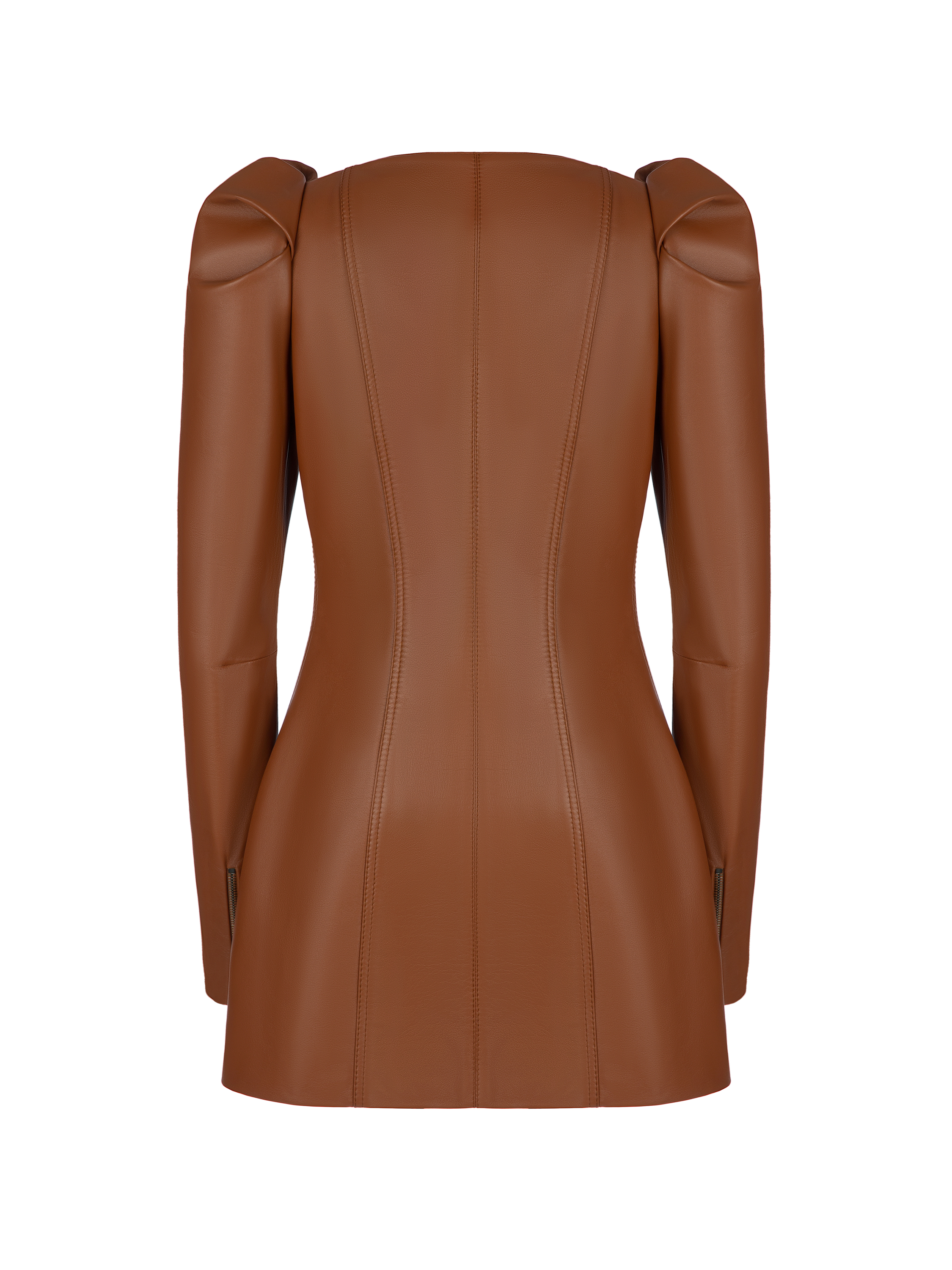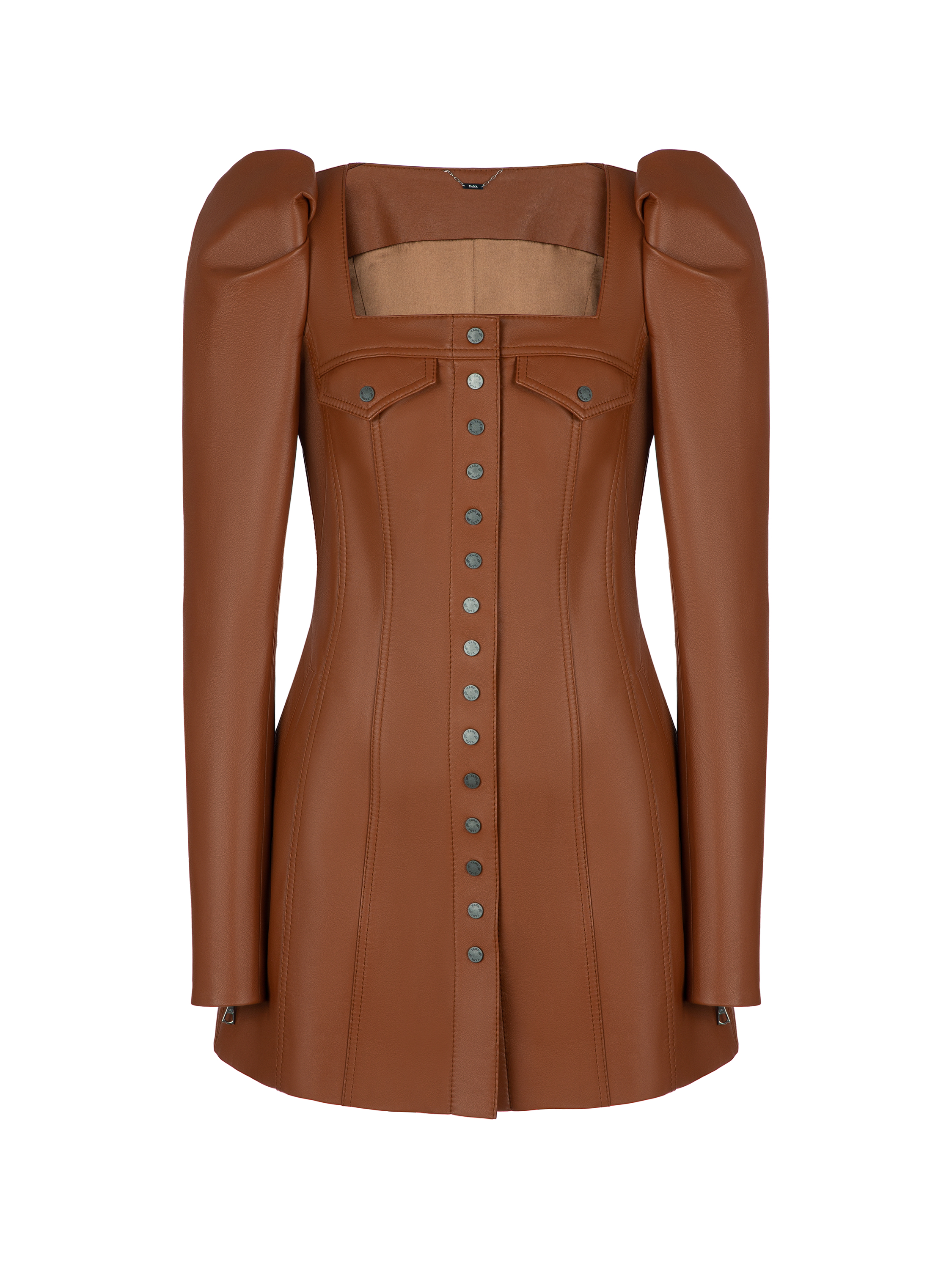 The brown mini dress is made of genuine leather and complemented with a square neckline, long puff sleeves and zippers on the cuffs. The model fastens with snaps at the front.