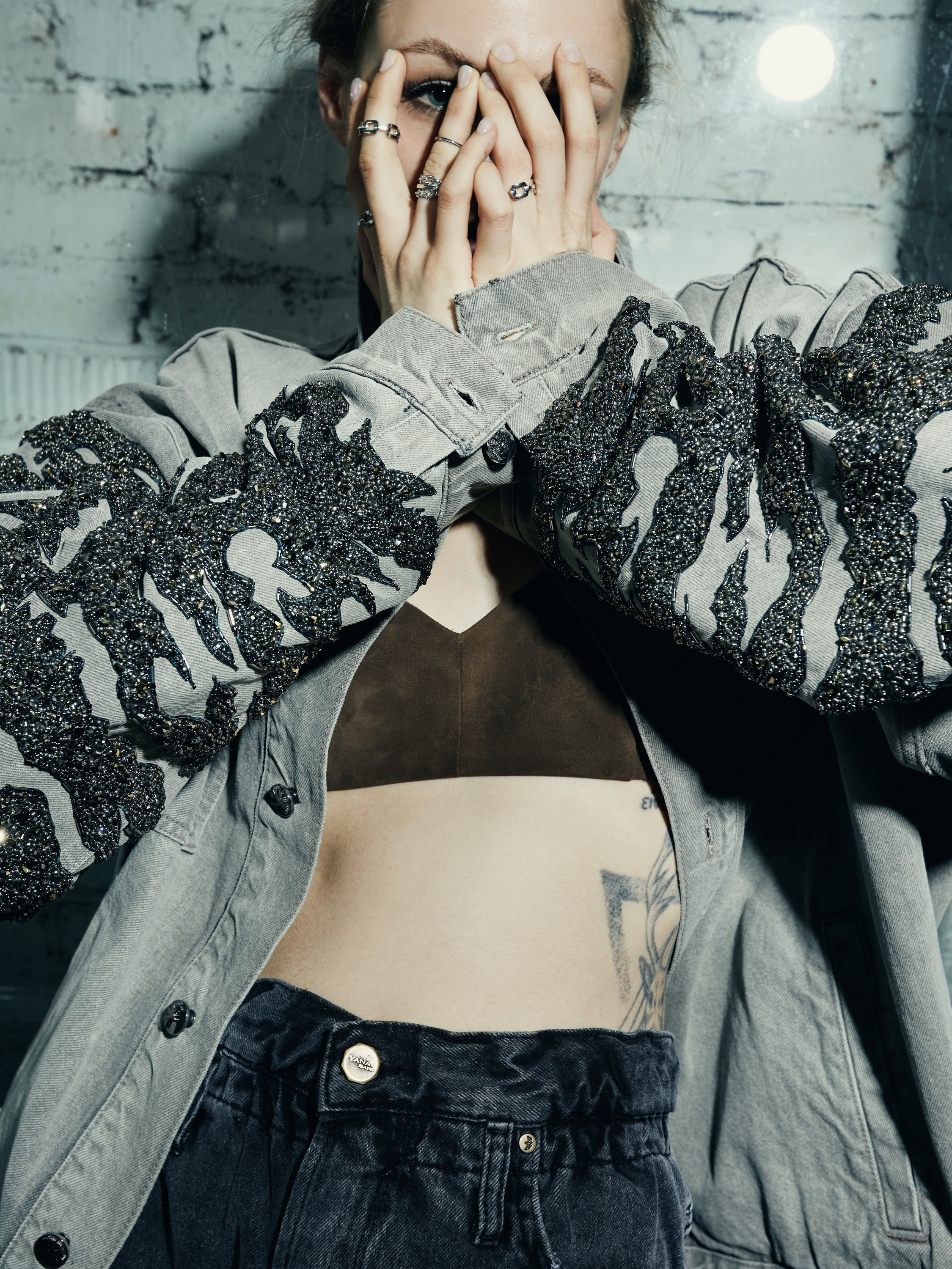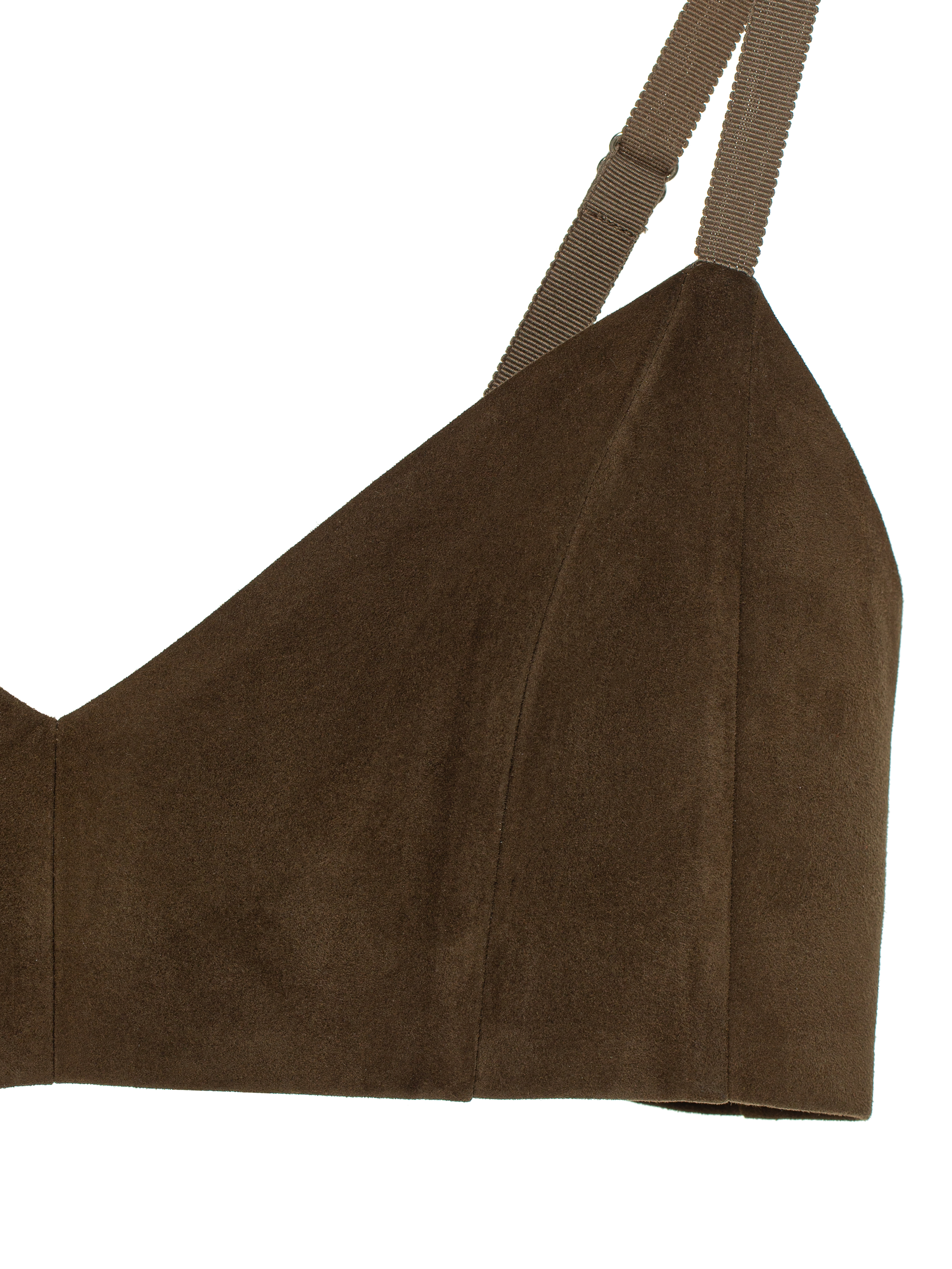 A short brown suede crop top with thin grosgrain straps. The model is complemented by a tonal natural silk lining. Fastens with a zipper at the back. The fit can be easily adjusted with sliders on the straps.