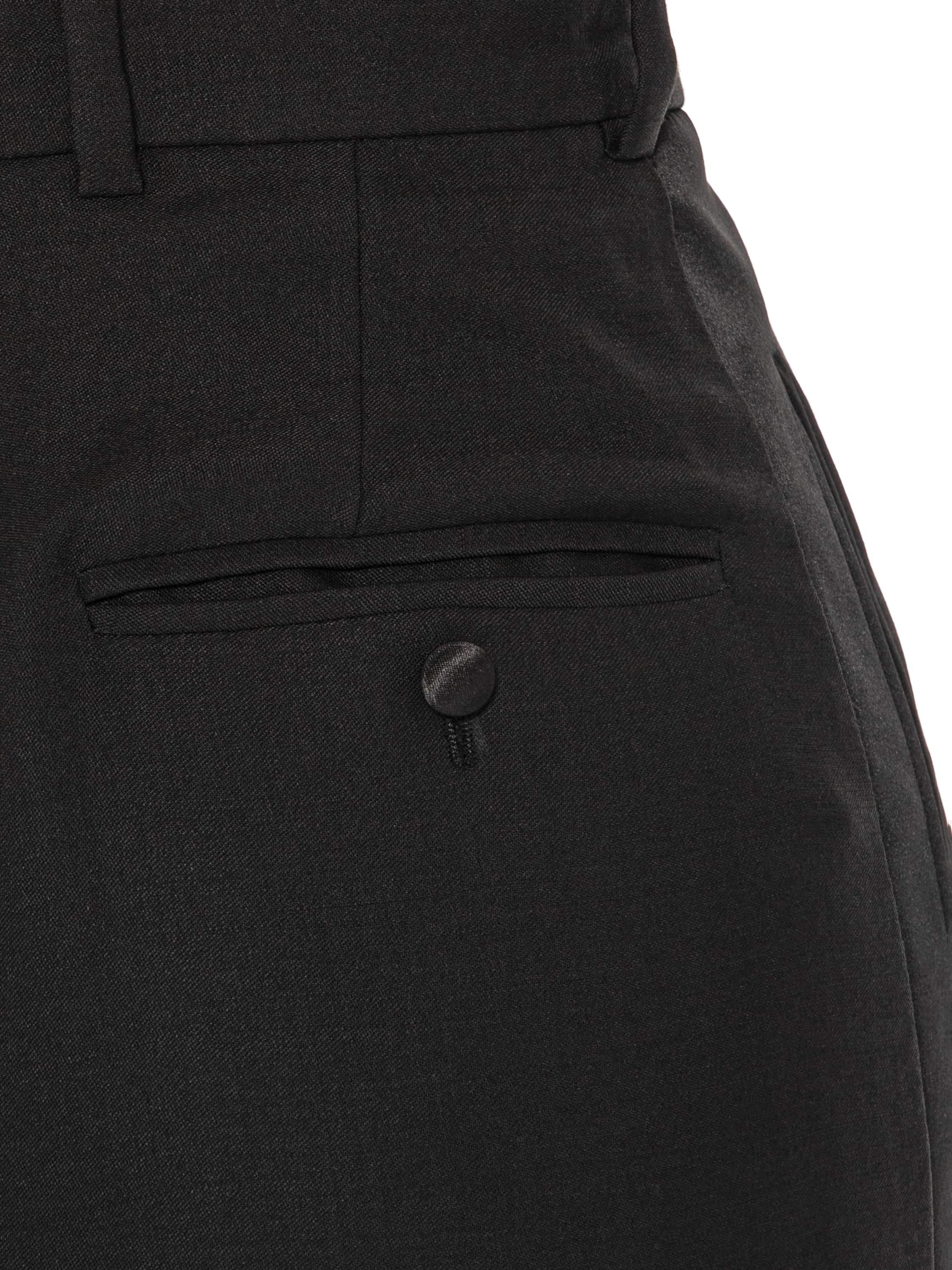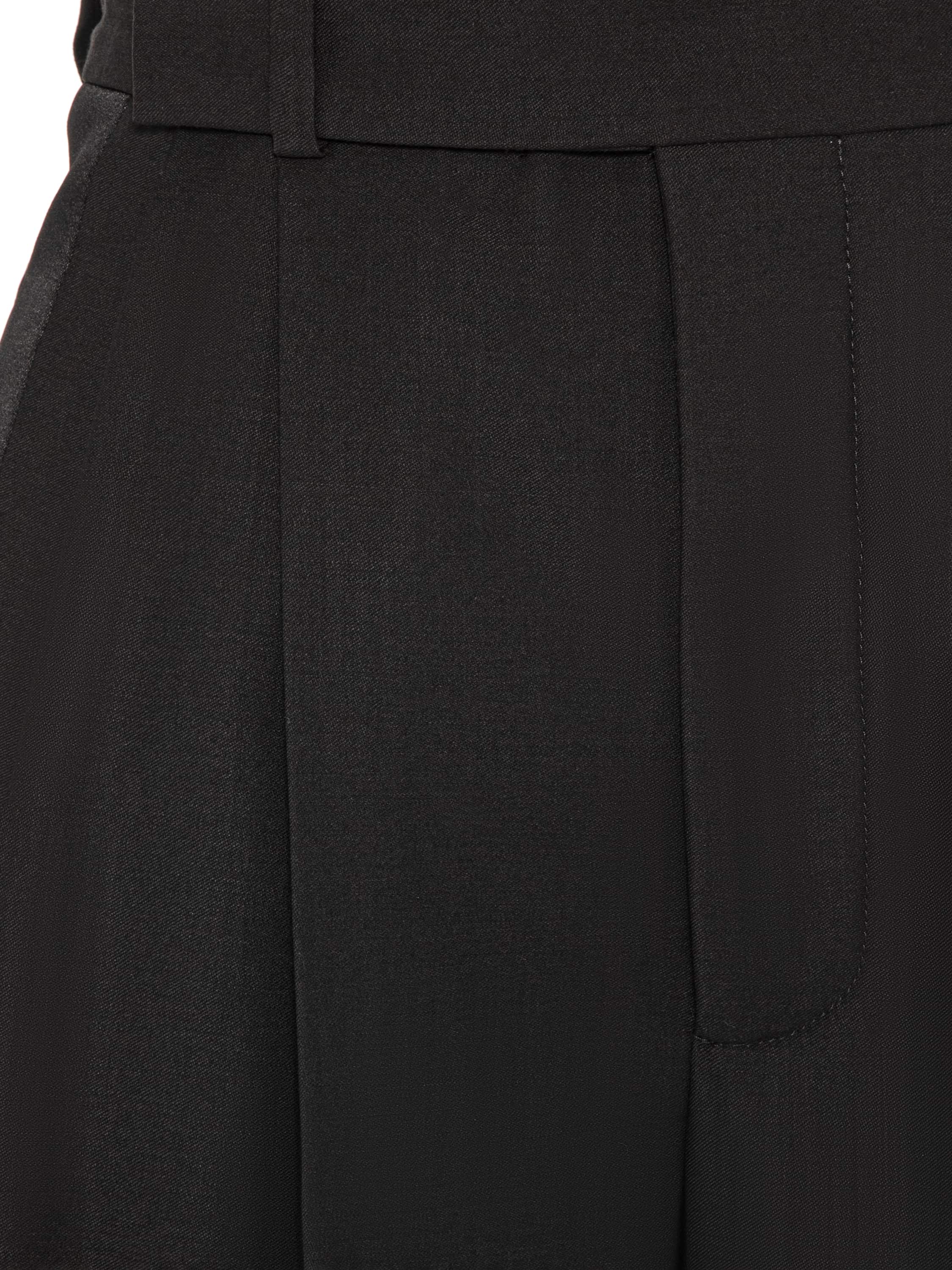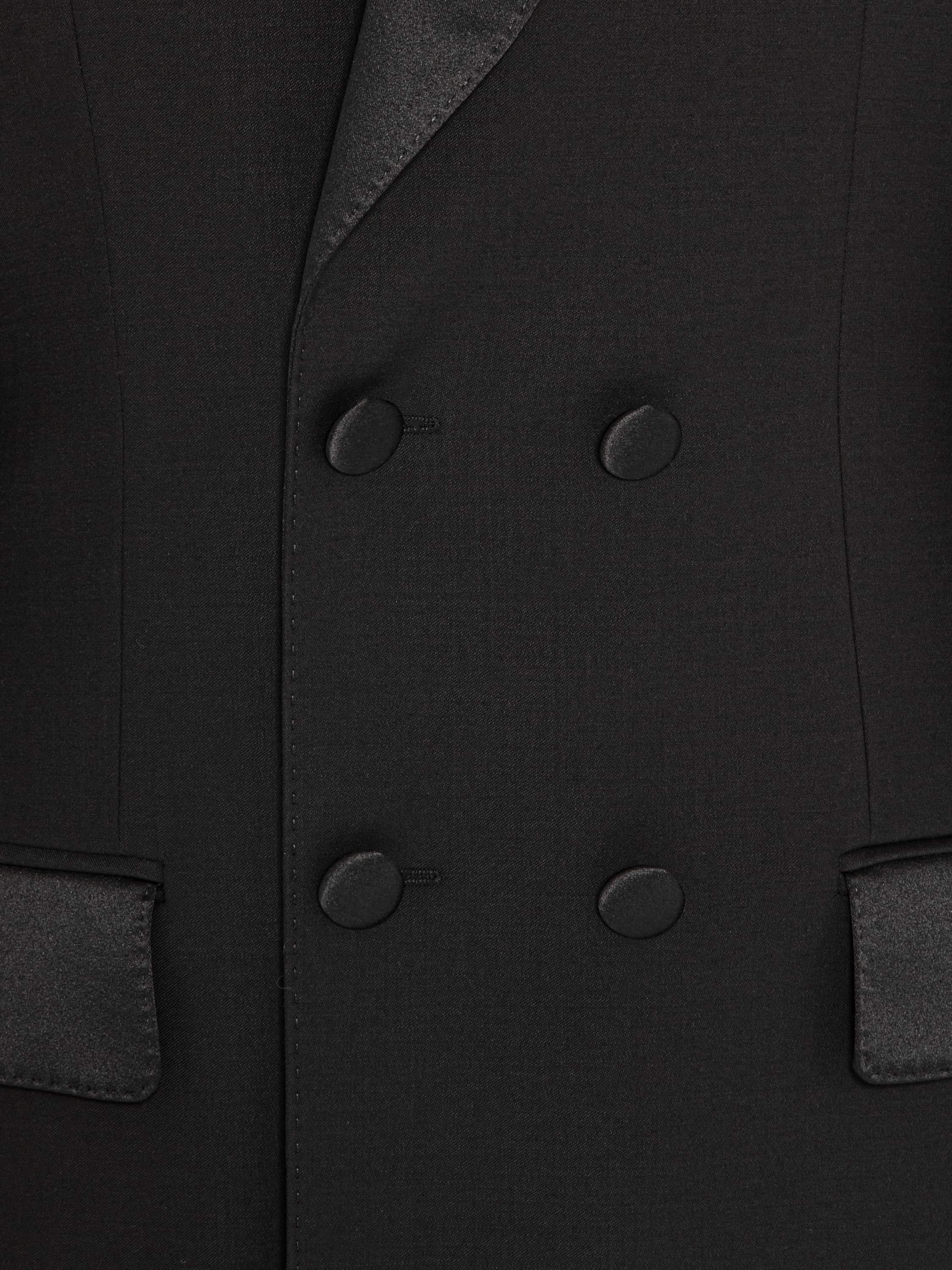 The laconic black two-piece suit consists of a double-breasted jacket and palazzo trousers with side stripes. The jacket is complemented by shaped lapels, a welt pocket and satin flaps.