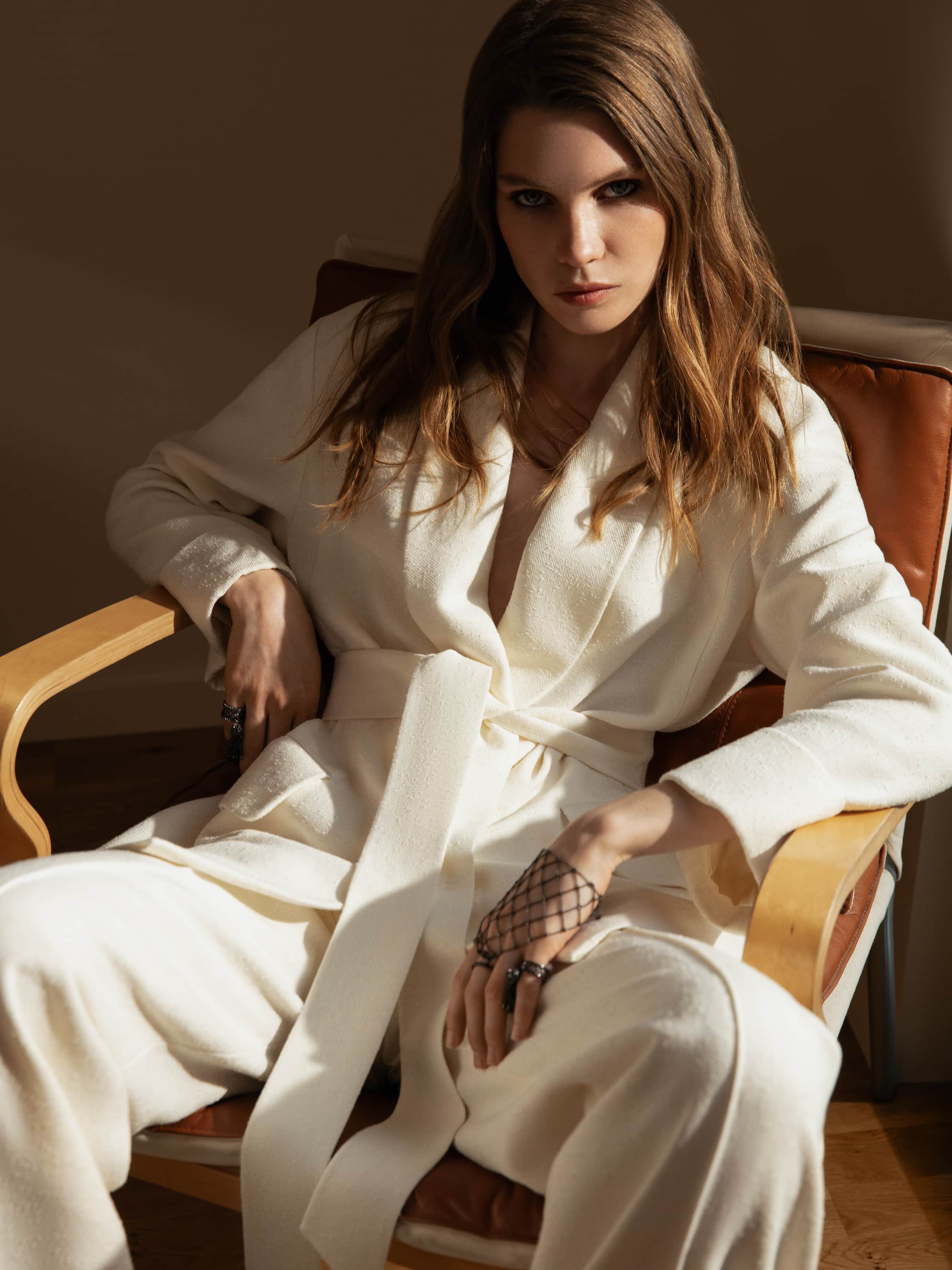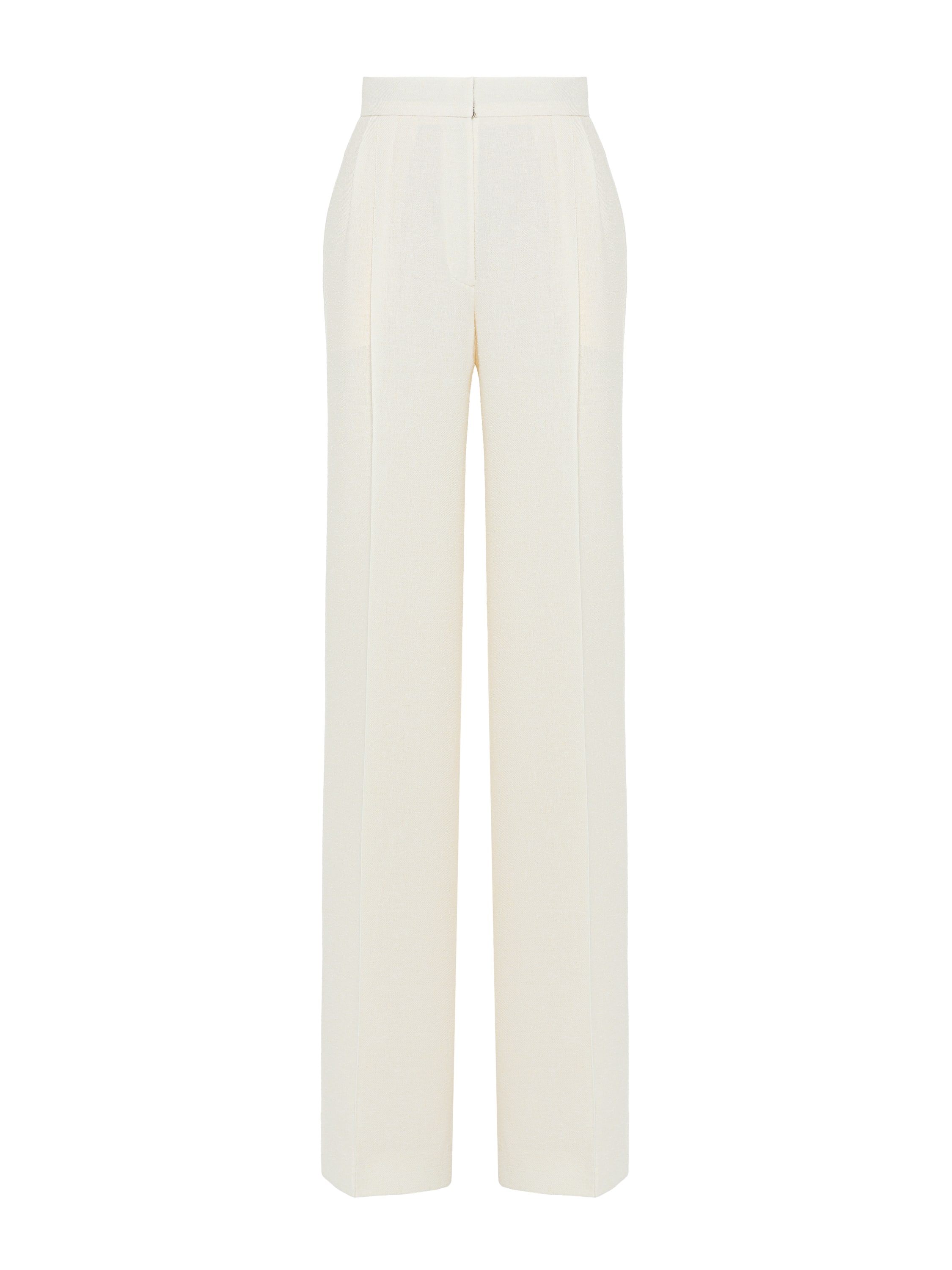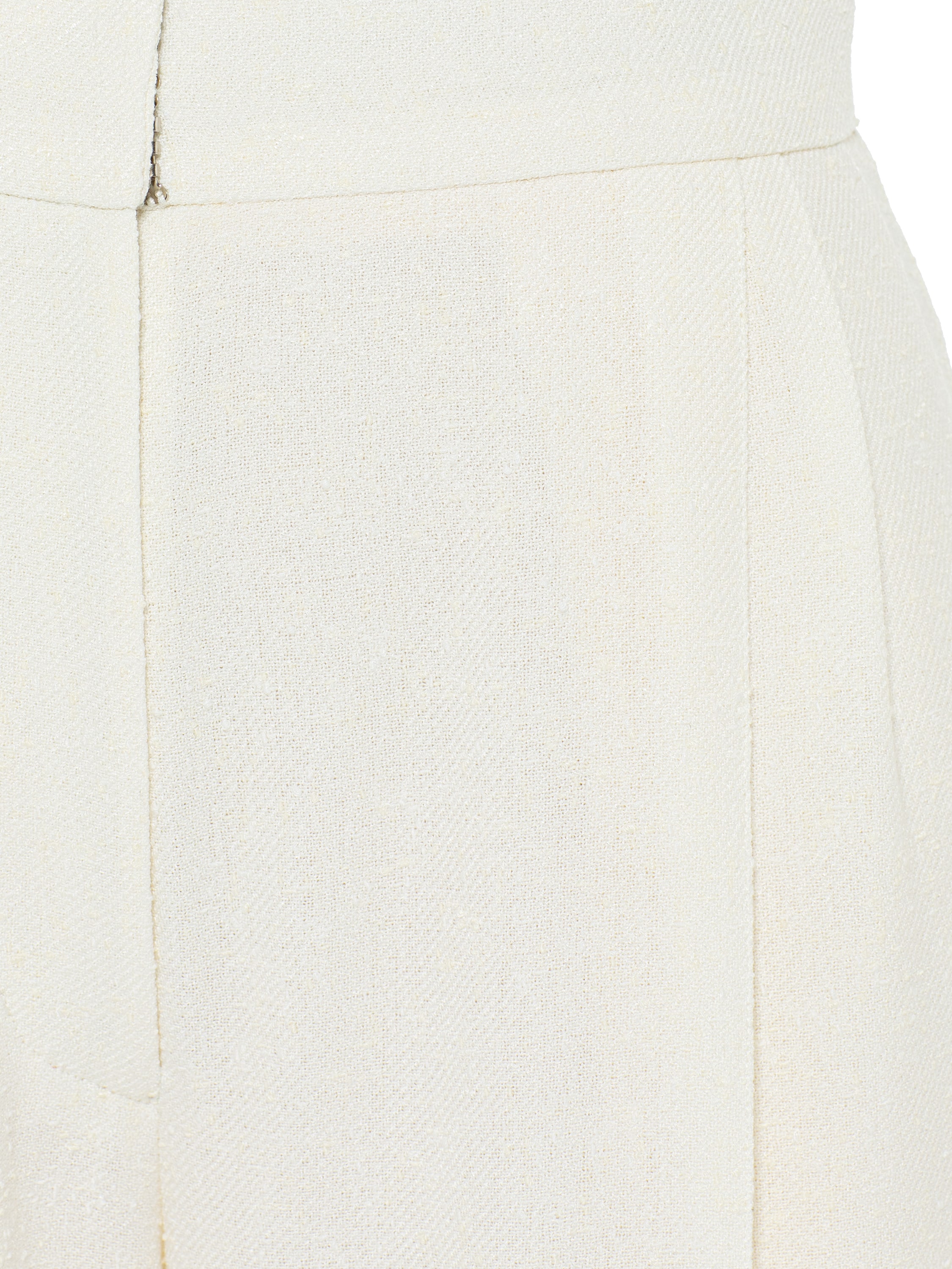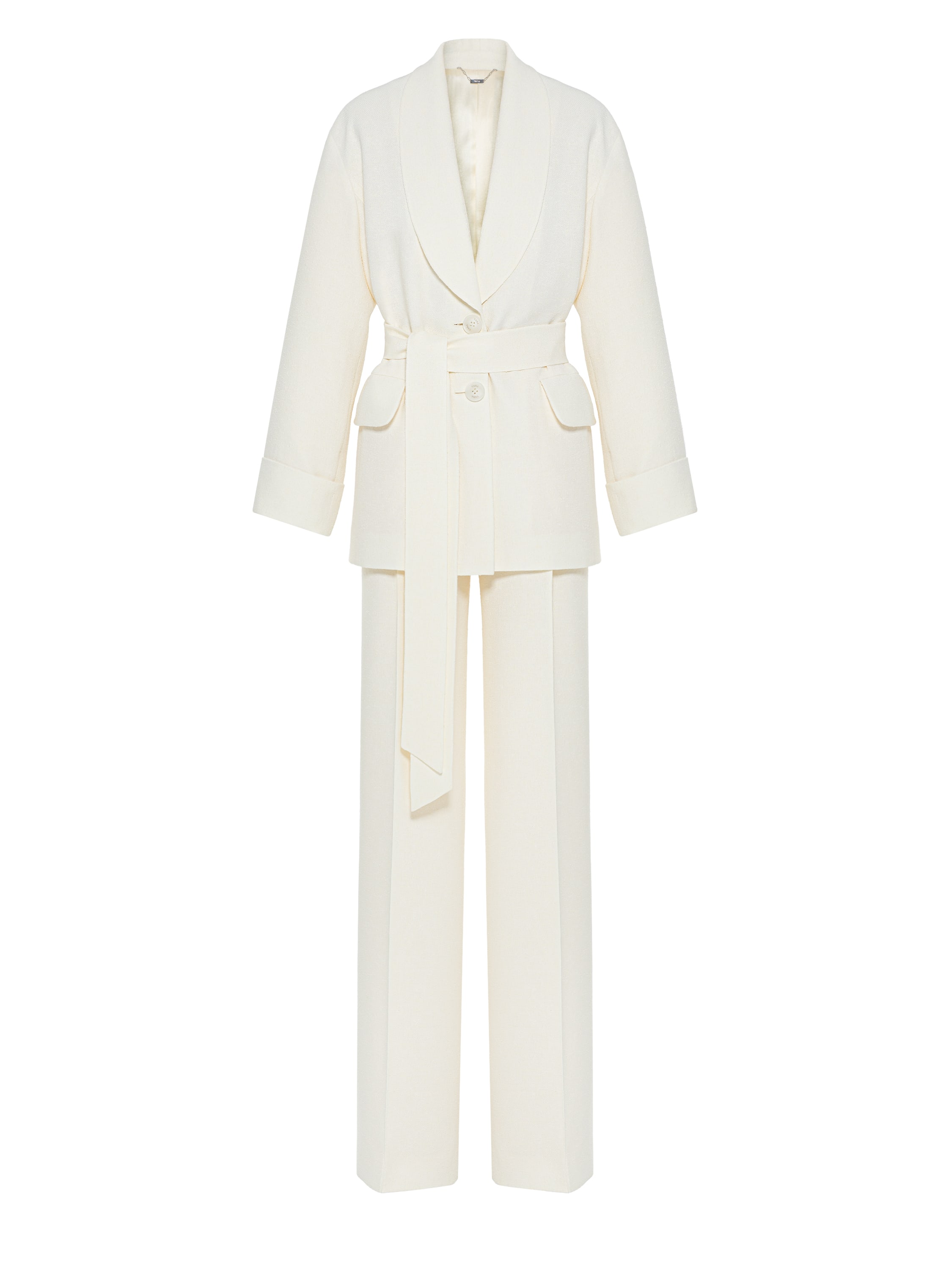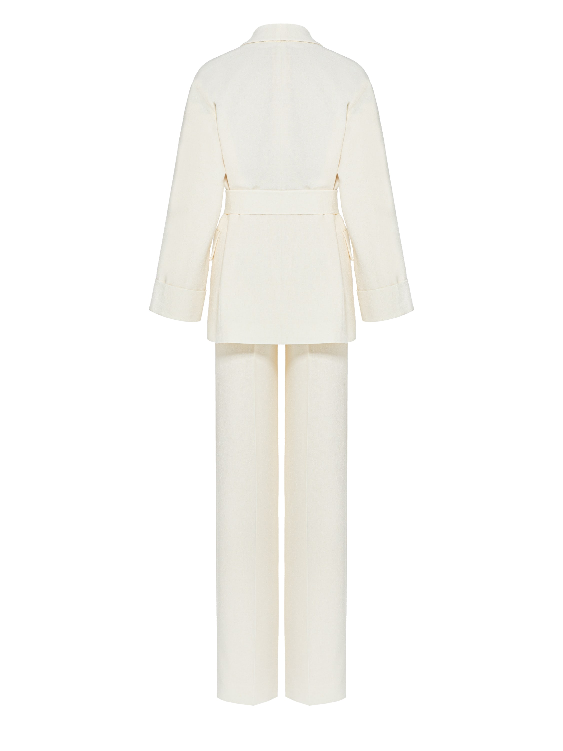 The milky tweed two-piece suit consists of a single-breasted jacket with a belt and straight-cut trousers. The laconic set is suitable both for a formal event and for a business meeting.