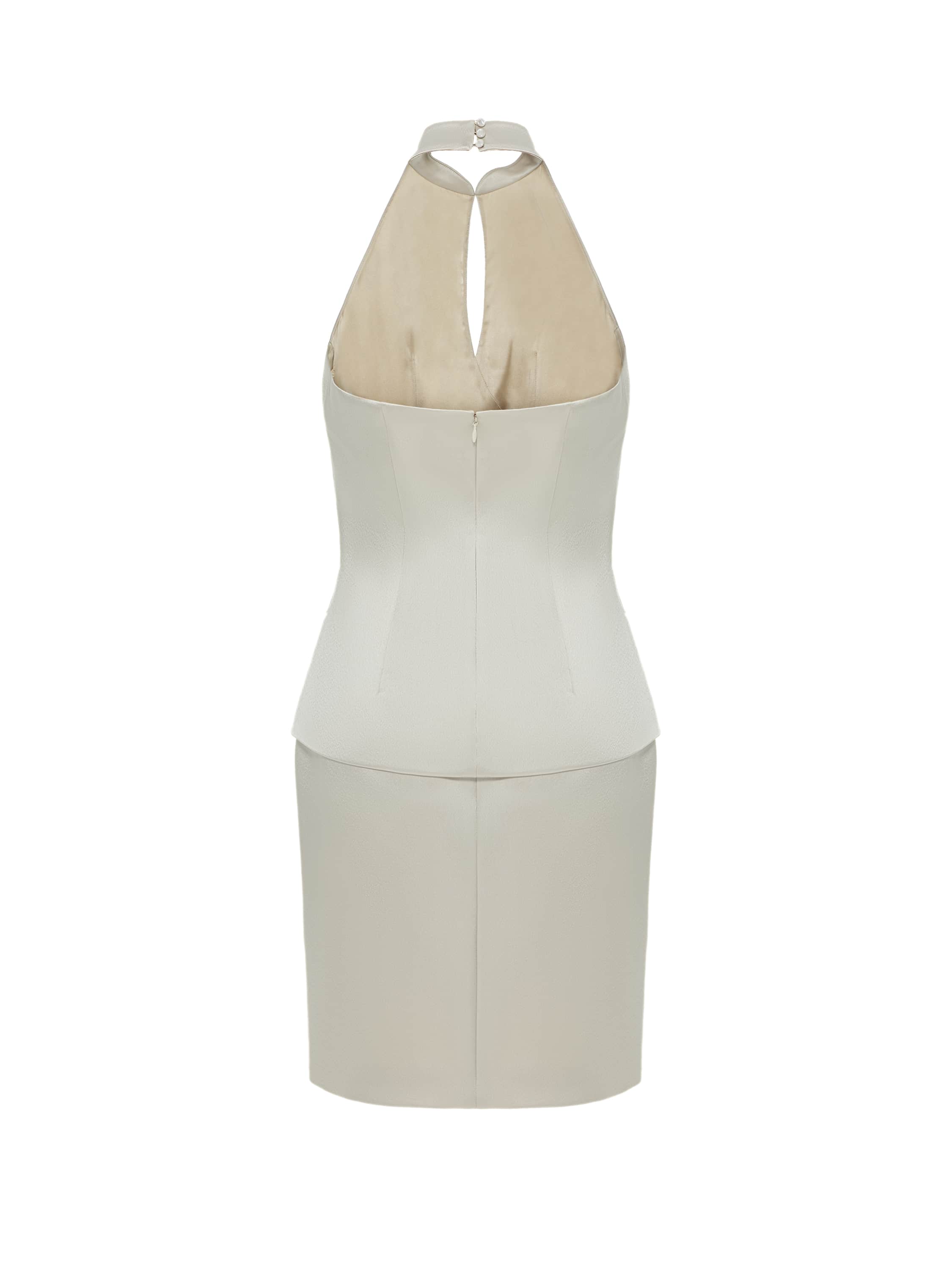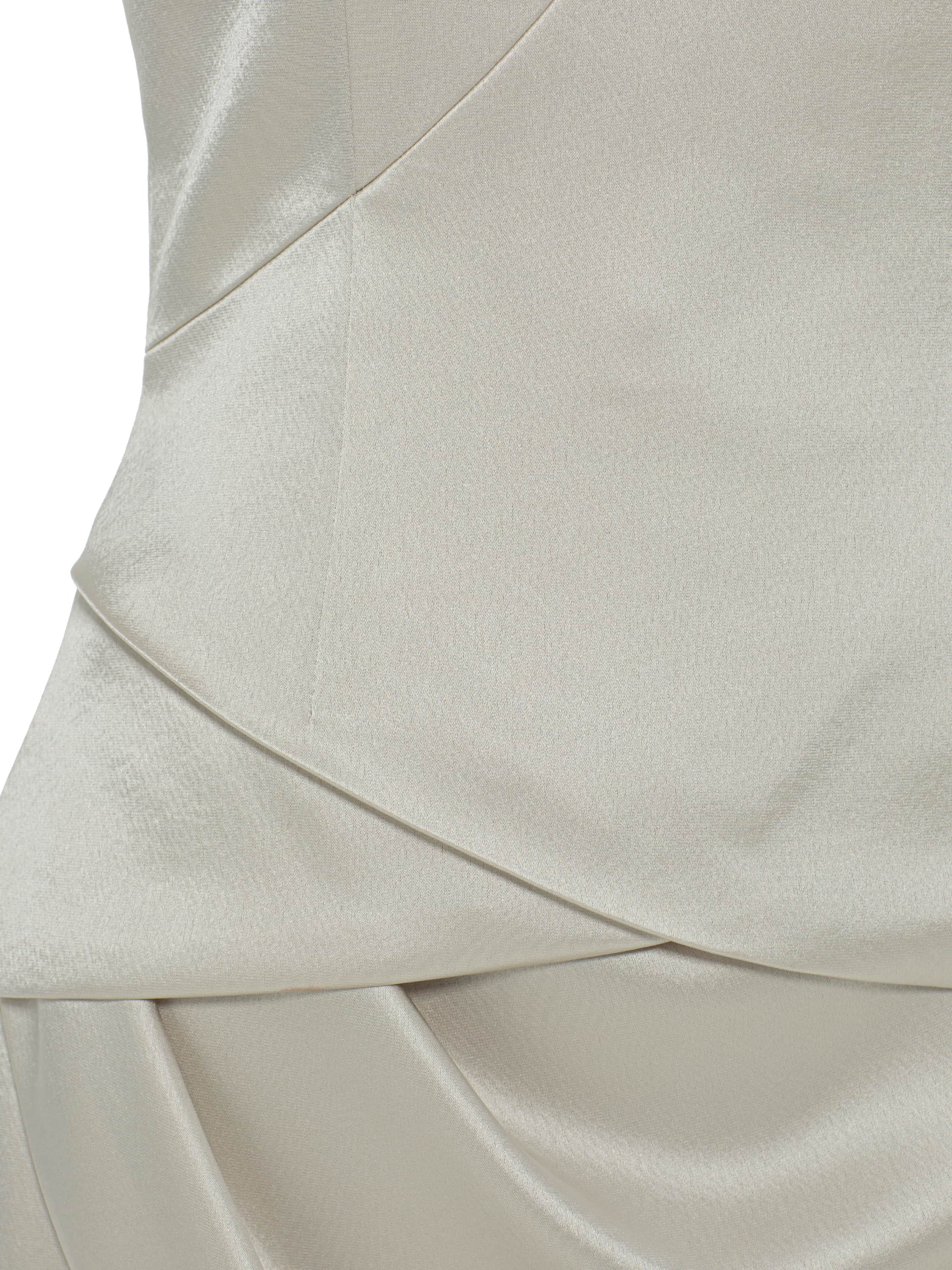 For the tailoring of the two-piece suit consisting of a top and a draped mini skirt, a silver-beige silk fabric was used. The striking set draws all attention to the waistline, while the delicate slit accentuates the décolleté area.